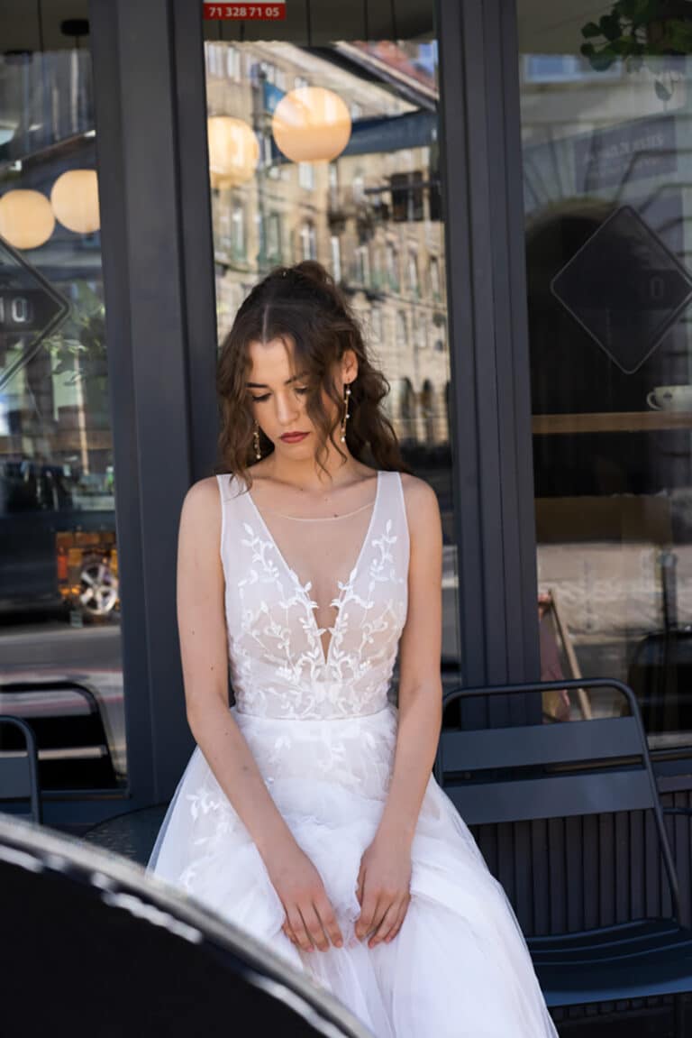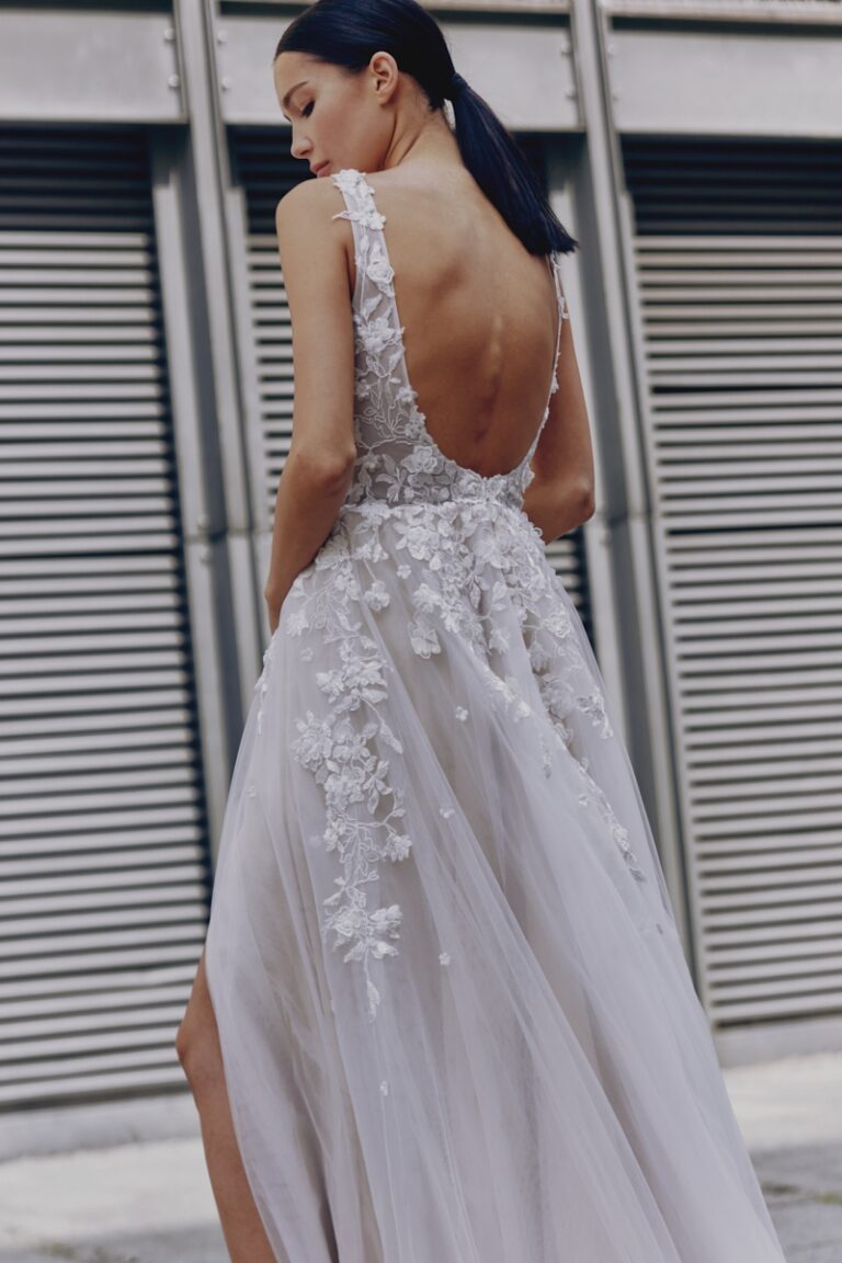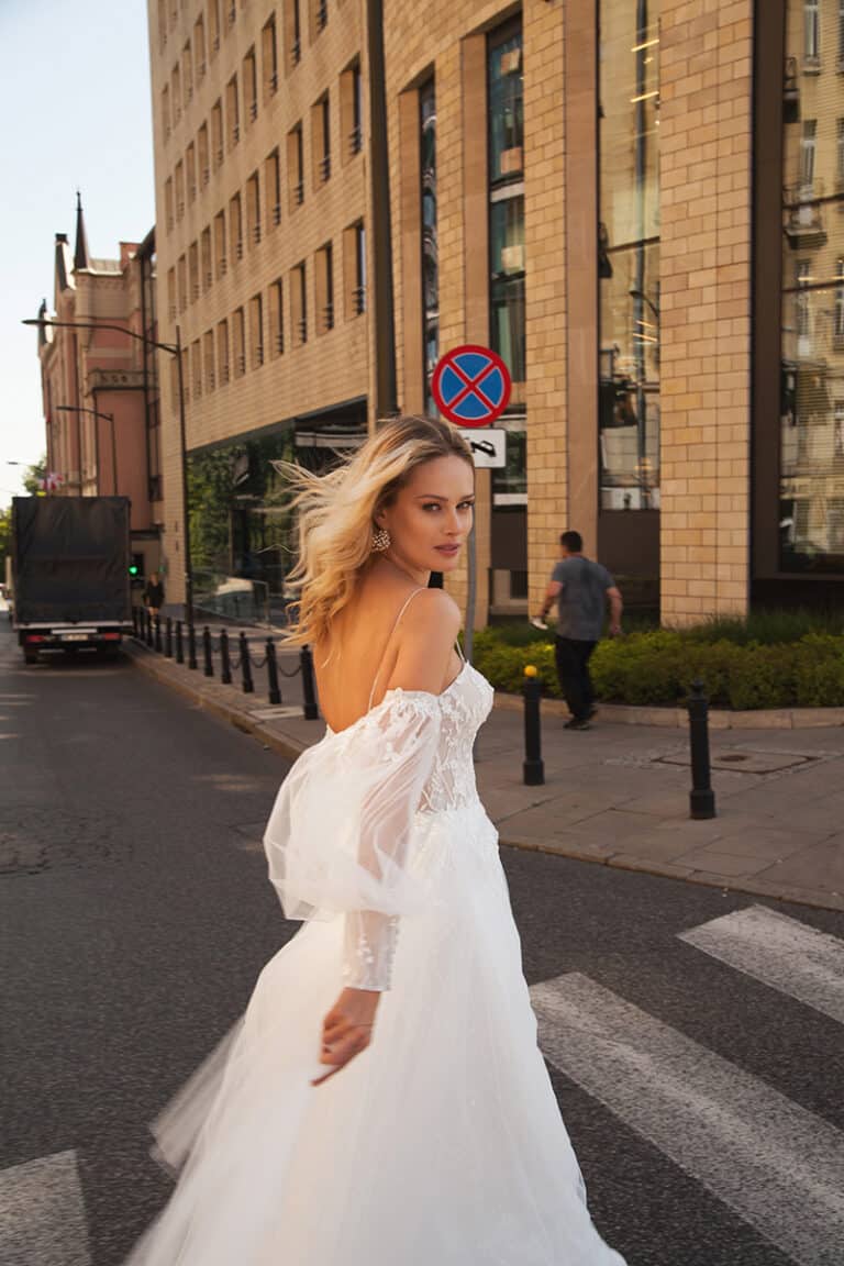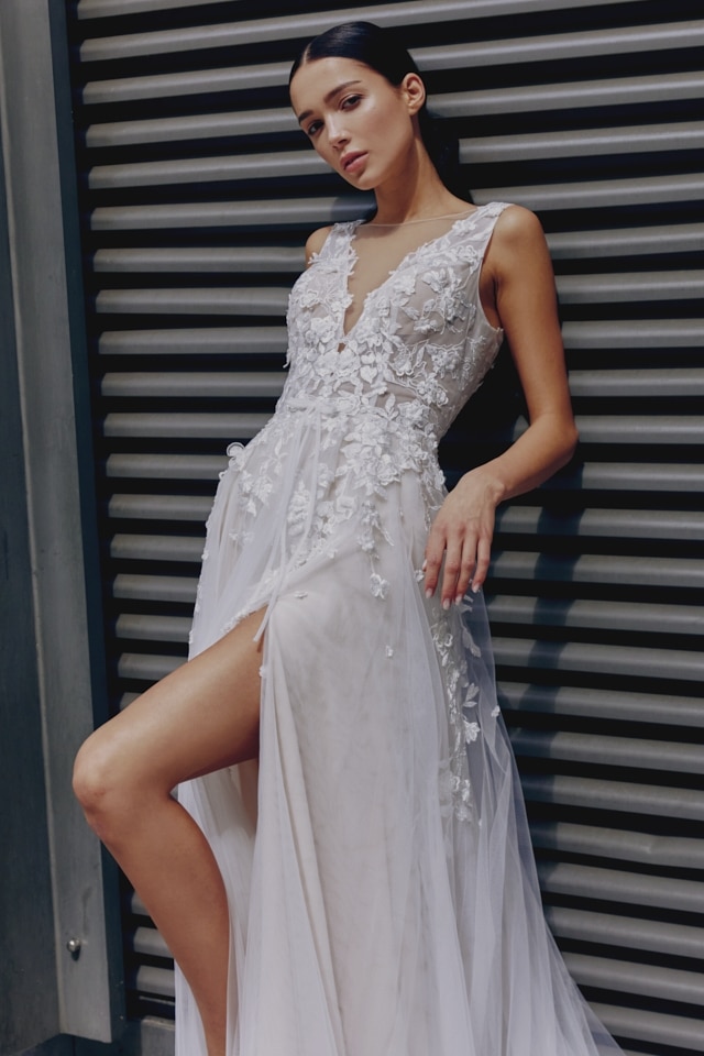 Die Kleider zeichnen sich durch leichten, luftigen Tüll, zarte Spitze, 3D-Applikationen und handgefertigte Accessoires aus. Ausgefallene Akzente in Form von angesetzten Ärmeln, tief ausgeschnittenen Schulterträgern, gebundenen Tüllschleifen und transparenten Ausschnitten runden die moderne Brautsilhouette ab.
