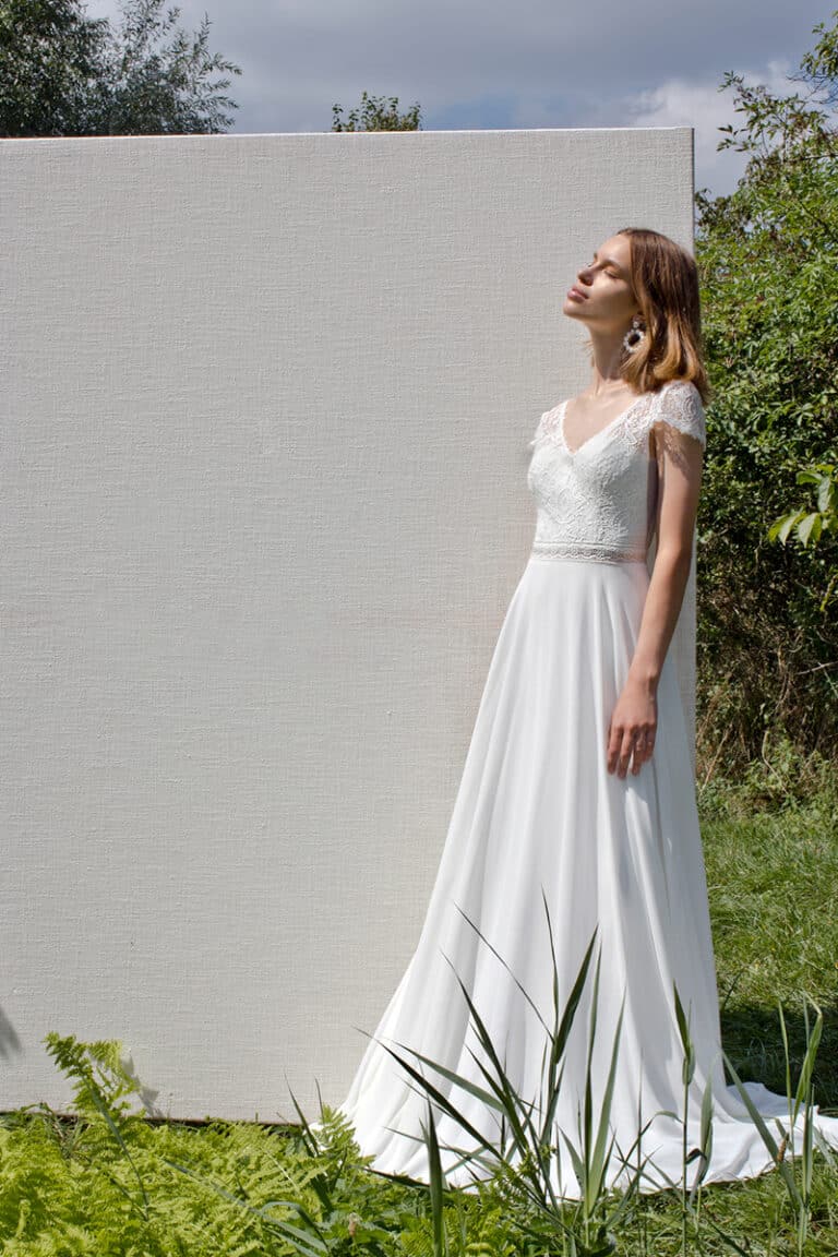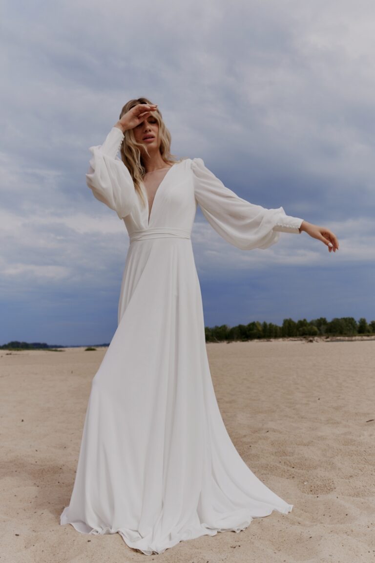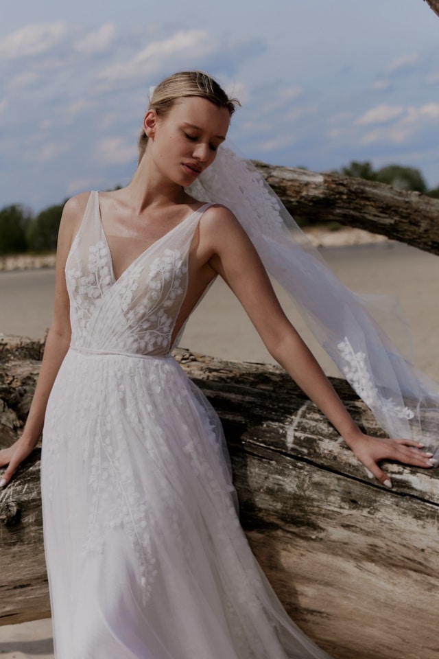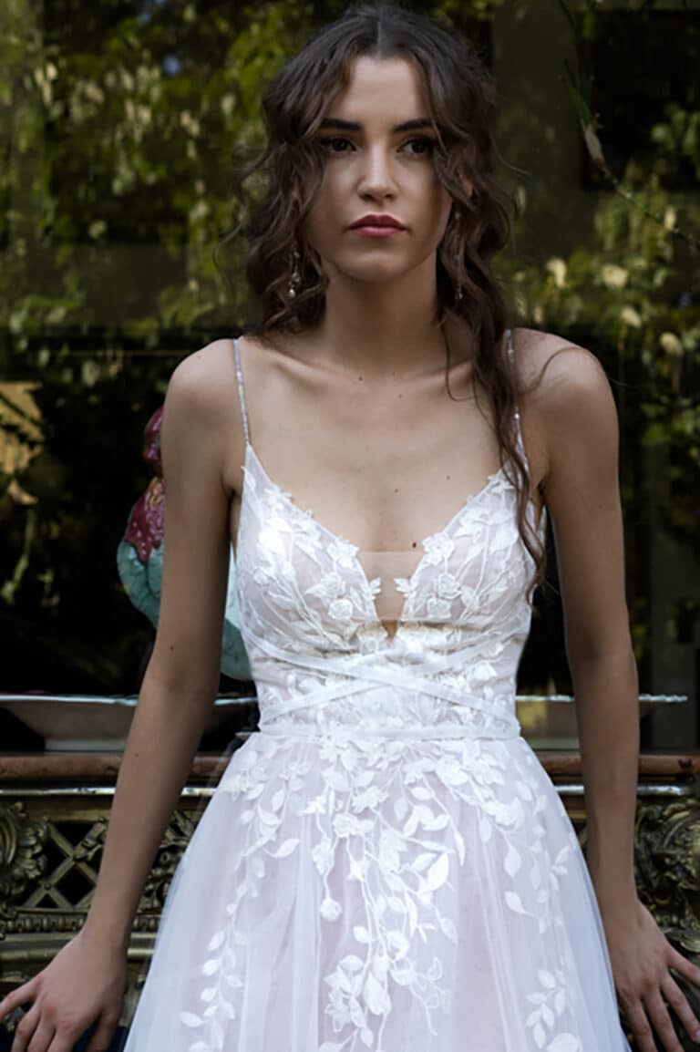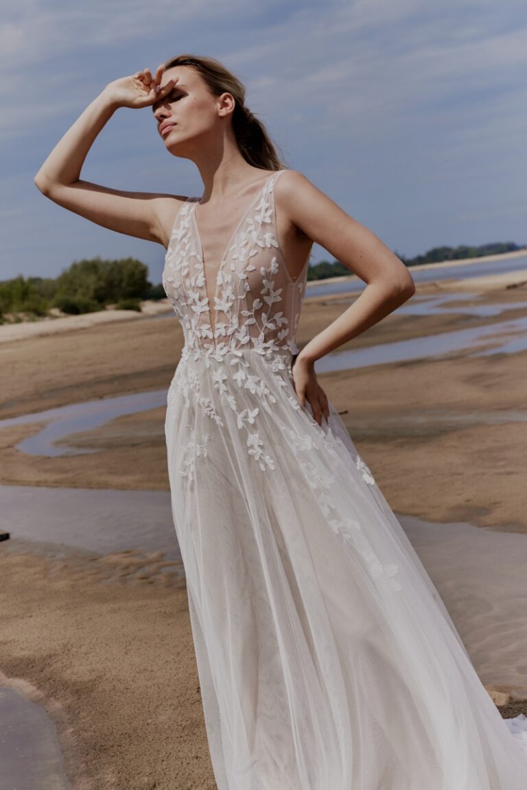 Die Kleider zeichnen sich durch leichten, luftigen Tüll, zarte Spitze, 3D-Applikationen und handgefertigte Accessoires aus. Ausgefallene Akzente in Form von angesetzten Ärmeln, tief ausgeschnittenen Schulterträgern, gebundenen Tüllschleifen und transparenten Ausschnitten runden die moderne Brautsilhouette ab.