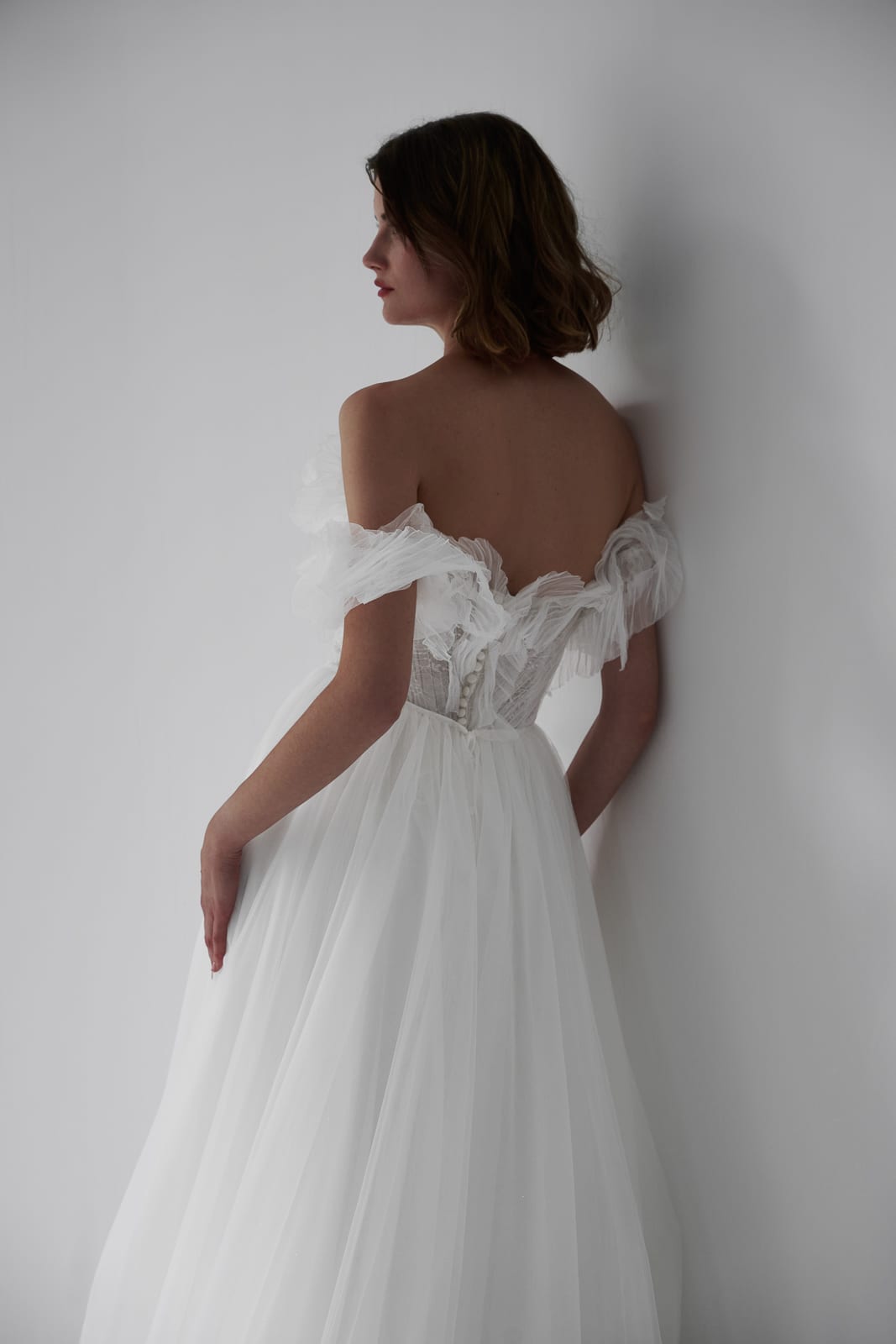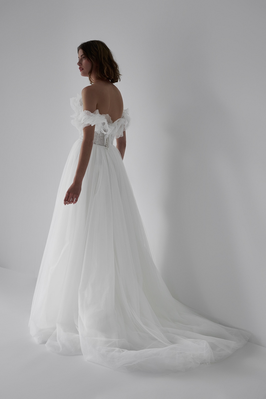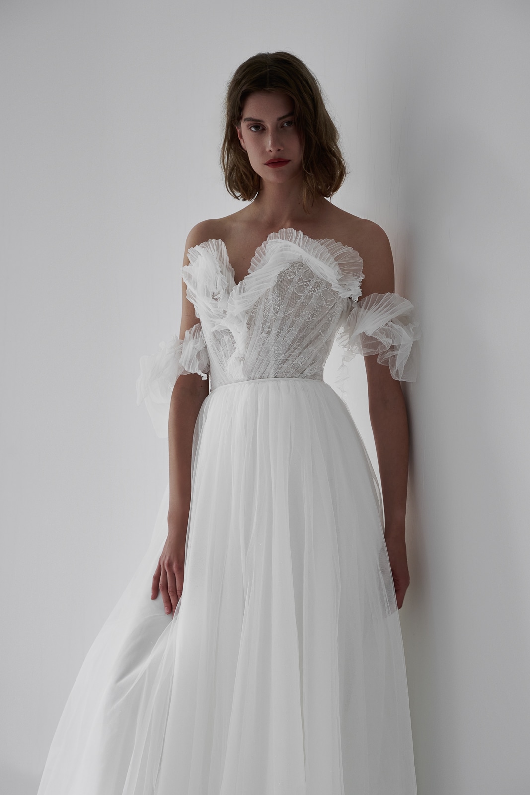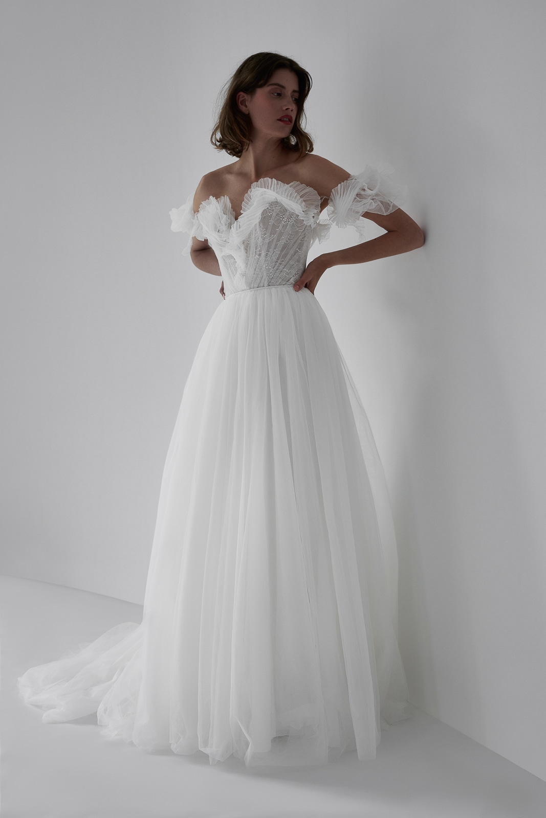 Dieses Brautkleid vereint romantische Eleganz mit einem Hauch Extravaganz. Auffällige Rüschen am Dekolleté und in den zarten Off-Shoulder-Trägern sorgen für einen unverwechselbaren Look. Feinste Spitze schimmert durch eine zarte Lage Tüll und verleiht dem Dekolleté eine verführerische Note. Der leicht fließende Tüllrock umhüllt die Braut in traumhafter Leichtigkeit – perfekt für einen unvergesslichen Auftritt.