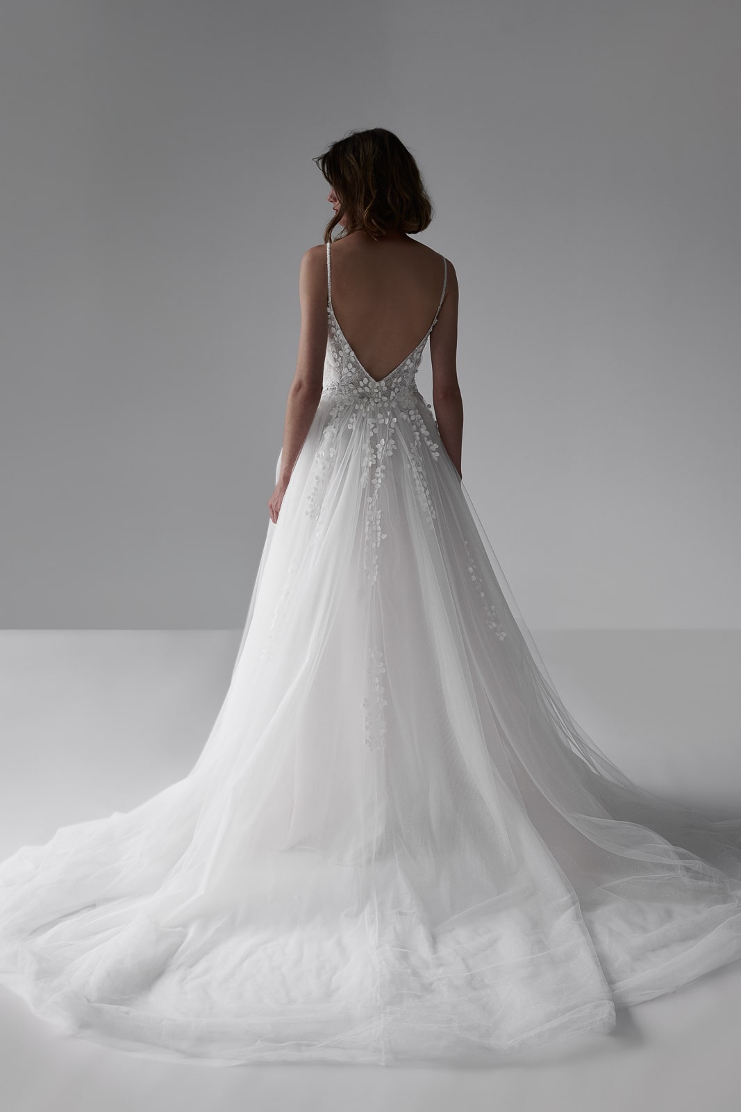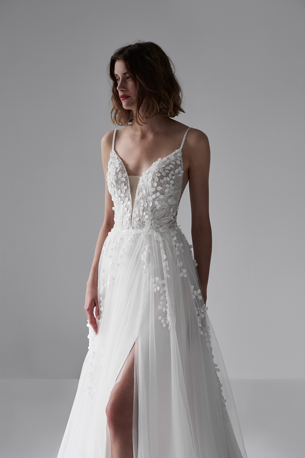 Dieses traumhafte Brautkleid vereint Romantik und Eleganz in perfekter Harmonie. Das zart bestickte Oberteil mit tiefem V-Ausschnitt bezaubert durch filigrane Blätterspitze in 3D-Optik, die sanft auf der Haut liegt. Der luftige Tüllrock fällt weich und leicht, während ein verführerischer Schlitz für einen modernen, aufregenden Akzent sorgt. Ideal für Bräute, die sich einen romantischen Look mit einem Hauch von Raffinesse wünschen.