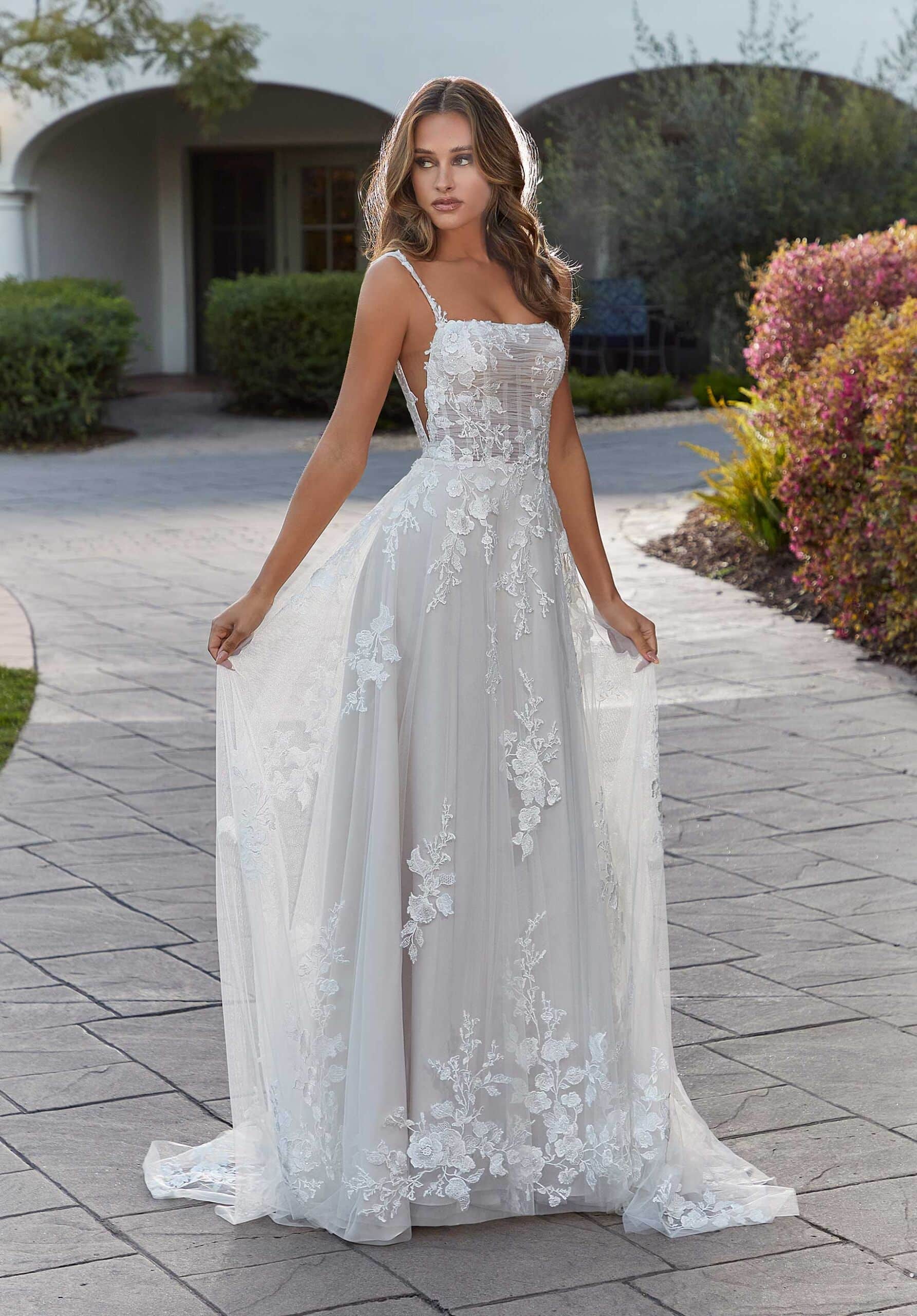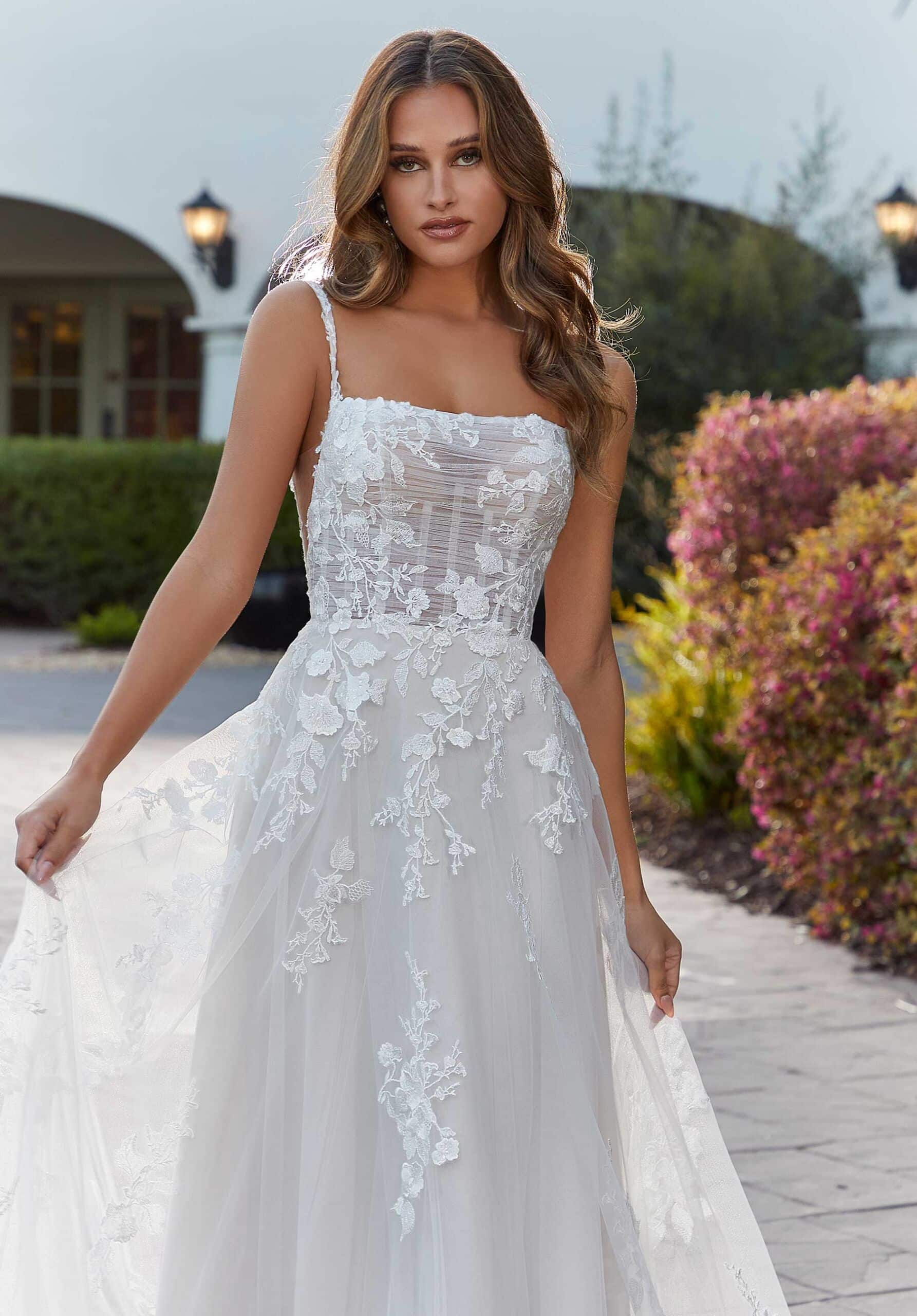Meredith ist schlicht und elegant mit einem strukturierten, quadratischen Mieder mit Drapierungseffekt. Hübsche mattierte, bestickte florale Spitzenapplikationen fallen zart über das A-Linien-Tüllkleid und bilden einen schönen breiten Saumabschluss