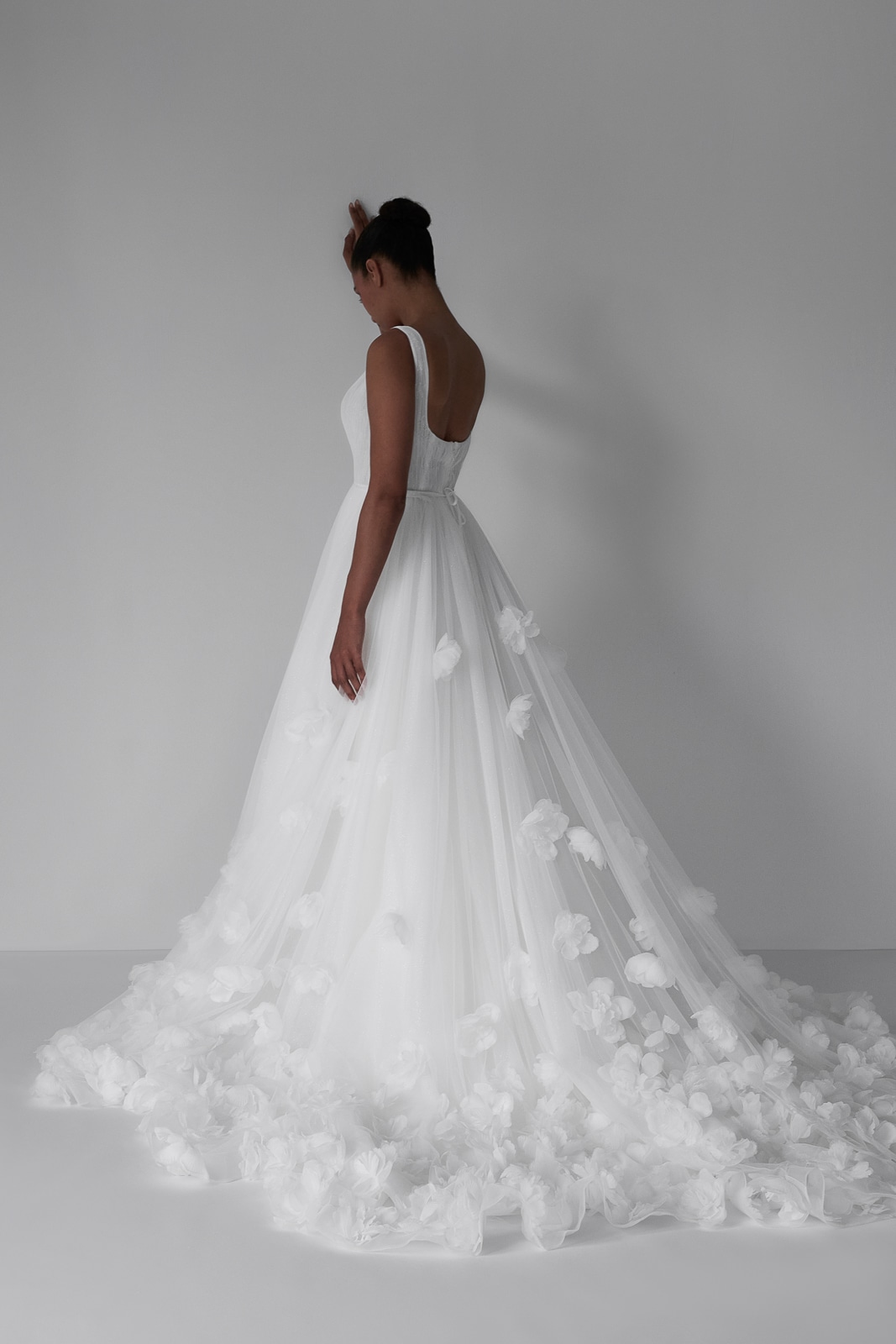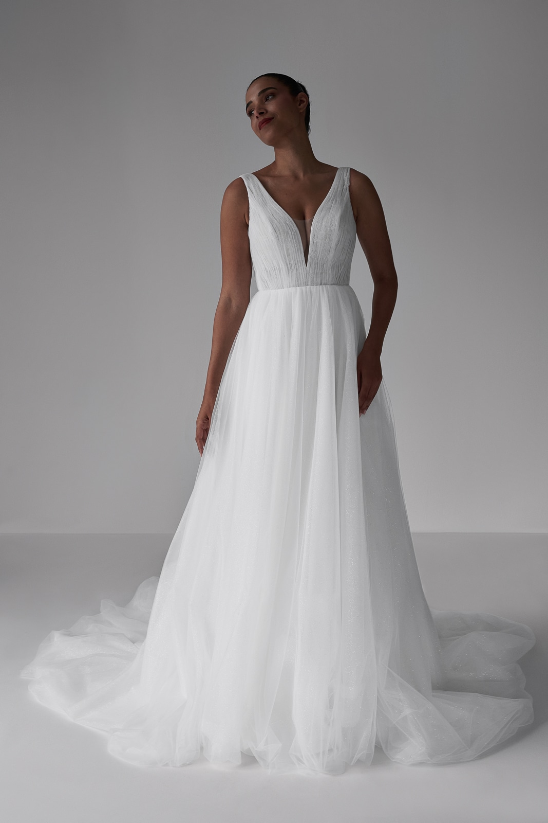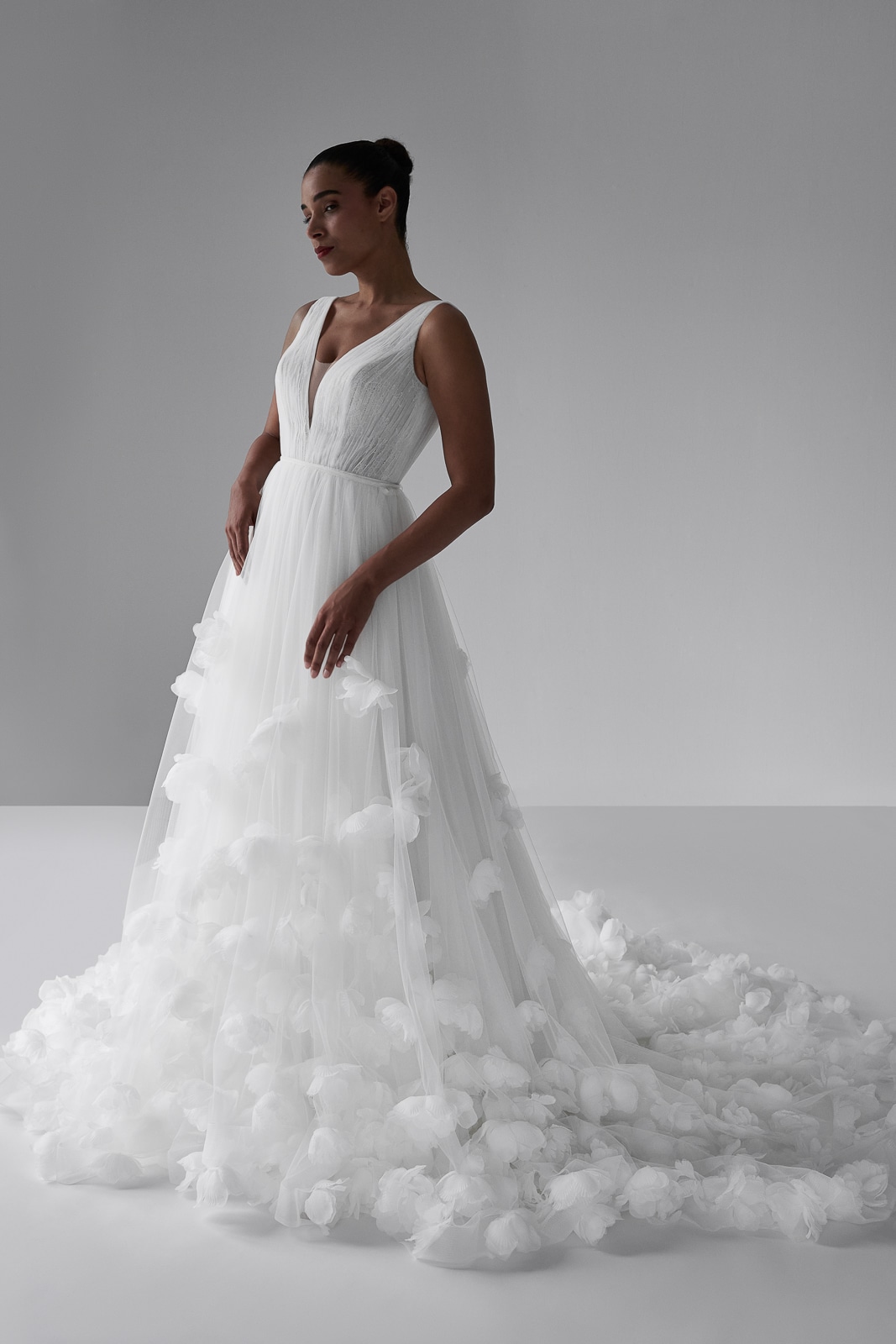 Dieses Brautkleid ist ein zarter Traum aus Tüll, das mit seinem eleganten V-Ausschnitt und einem zart gefalteten Oberteil für feminine Raffinesse sorgt. Kombiniere es mit einem luxuriösen Überrock, verziert mit filigranen 3D-Blumen, um einen romantischen und modernen Look zu kreieren, der deine natürliche Schönheit perfekt unterstreicht.