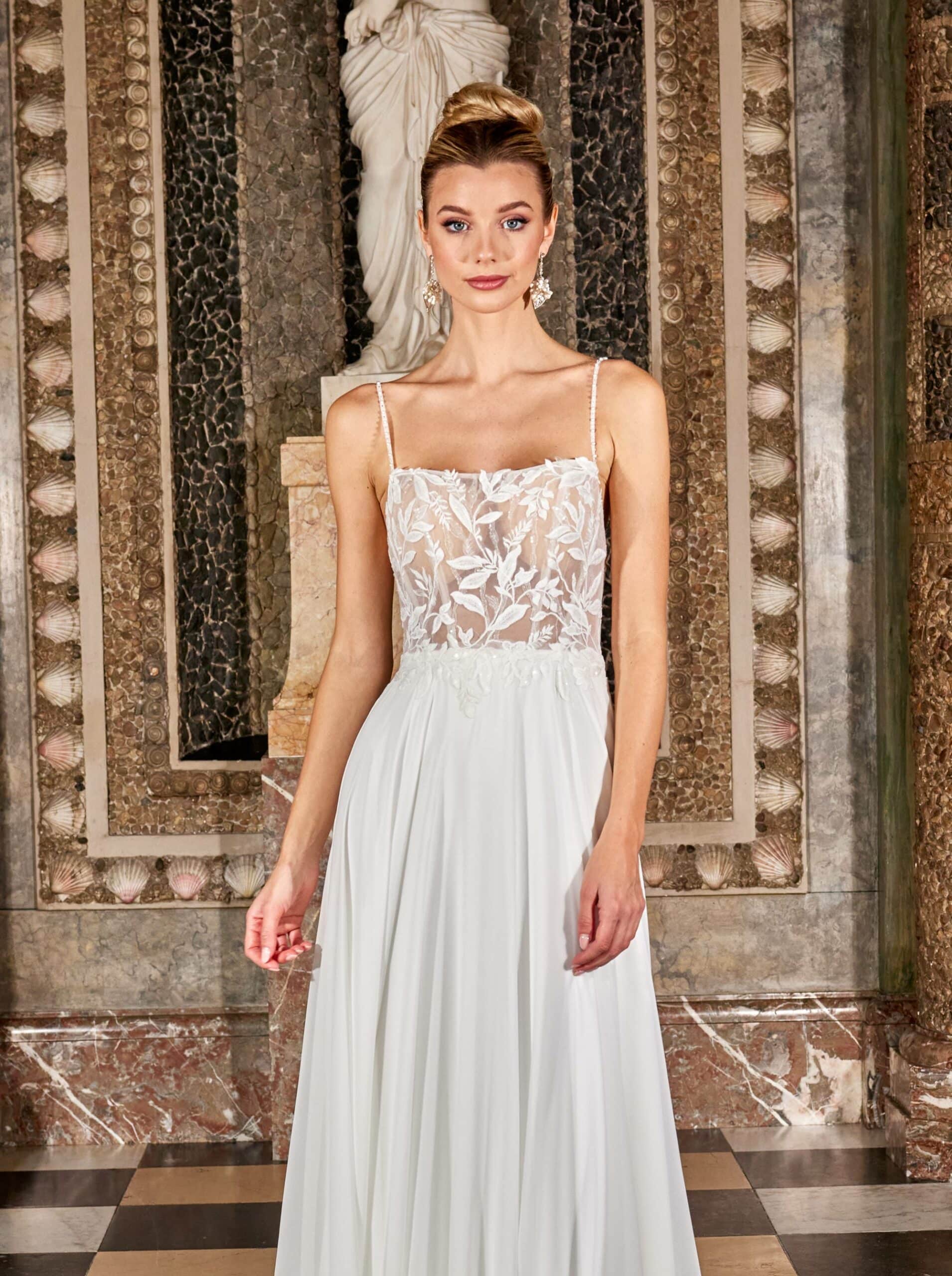 Der gerade Ausschnitt verleiht dem Kleid eine zeitgemäße Note, die dich an deinem großen Tag strahlen lässt. Der tiefe Rückenausschnitt ist kunstvoll mit feiner Blätterspitze verziert und fließt harmonisch in eine elegante Schleppe, die ebenfalls mit zarter Blätterspitze akzentuiert ist.
