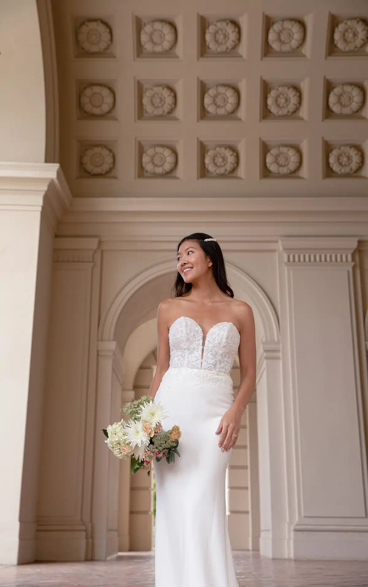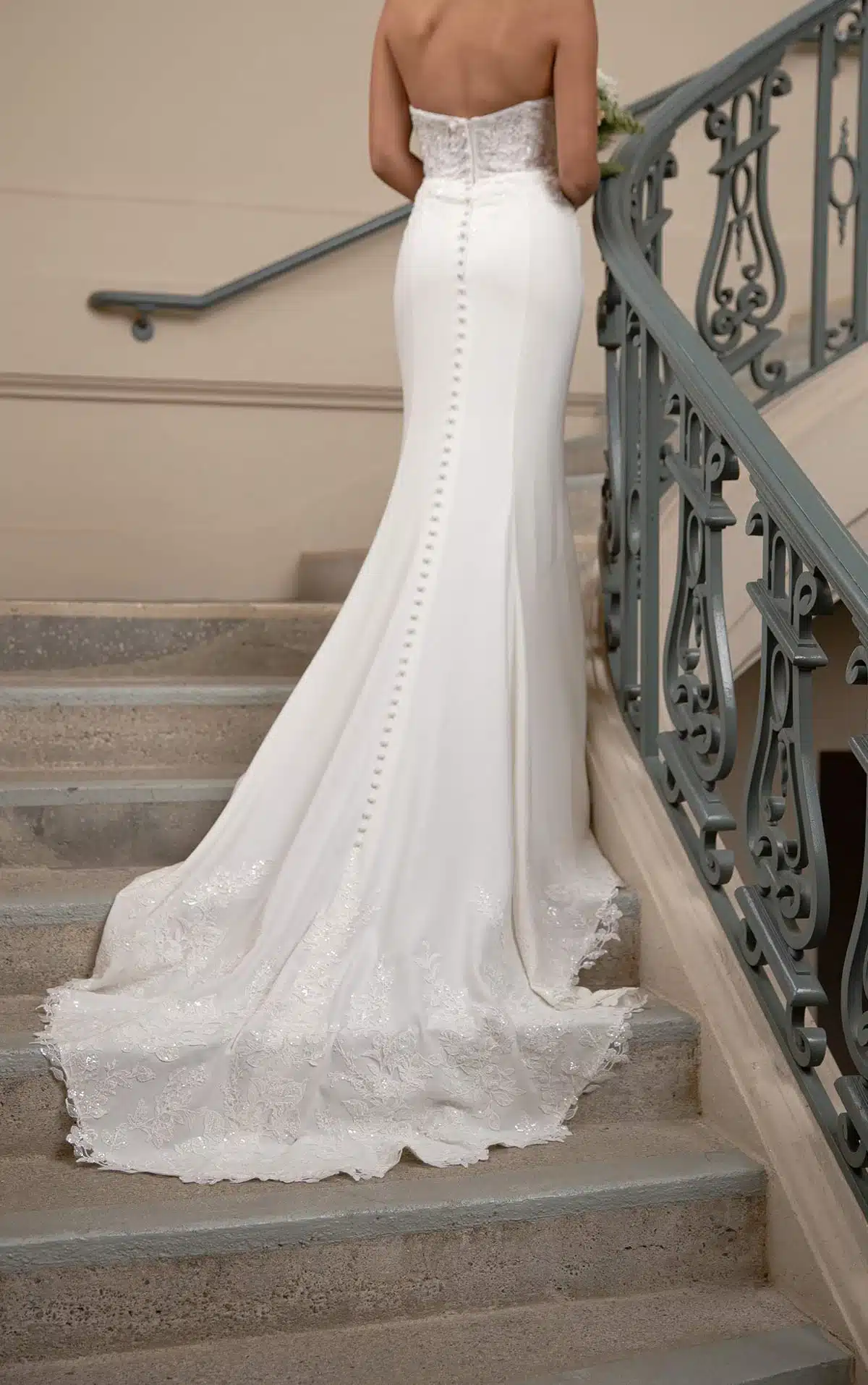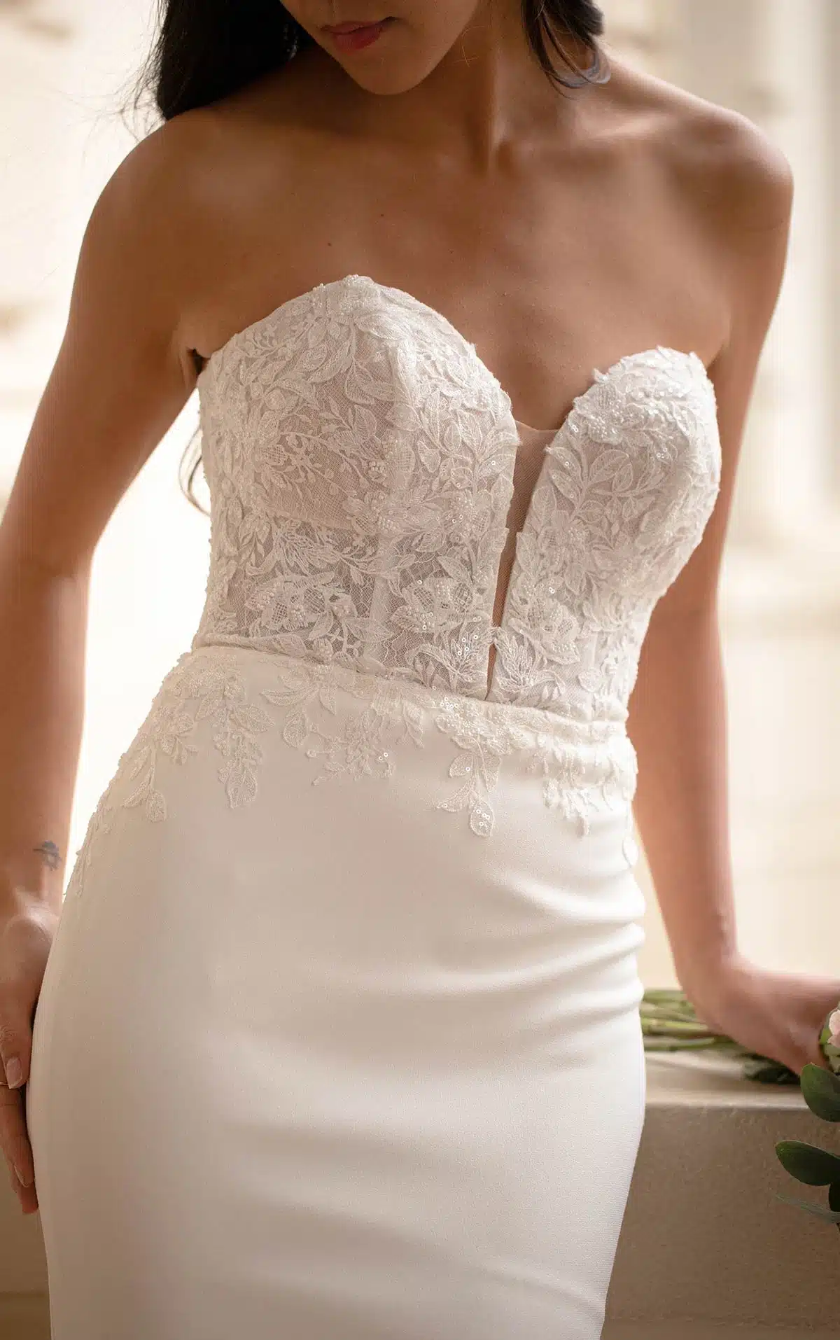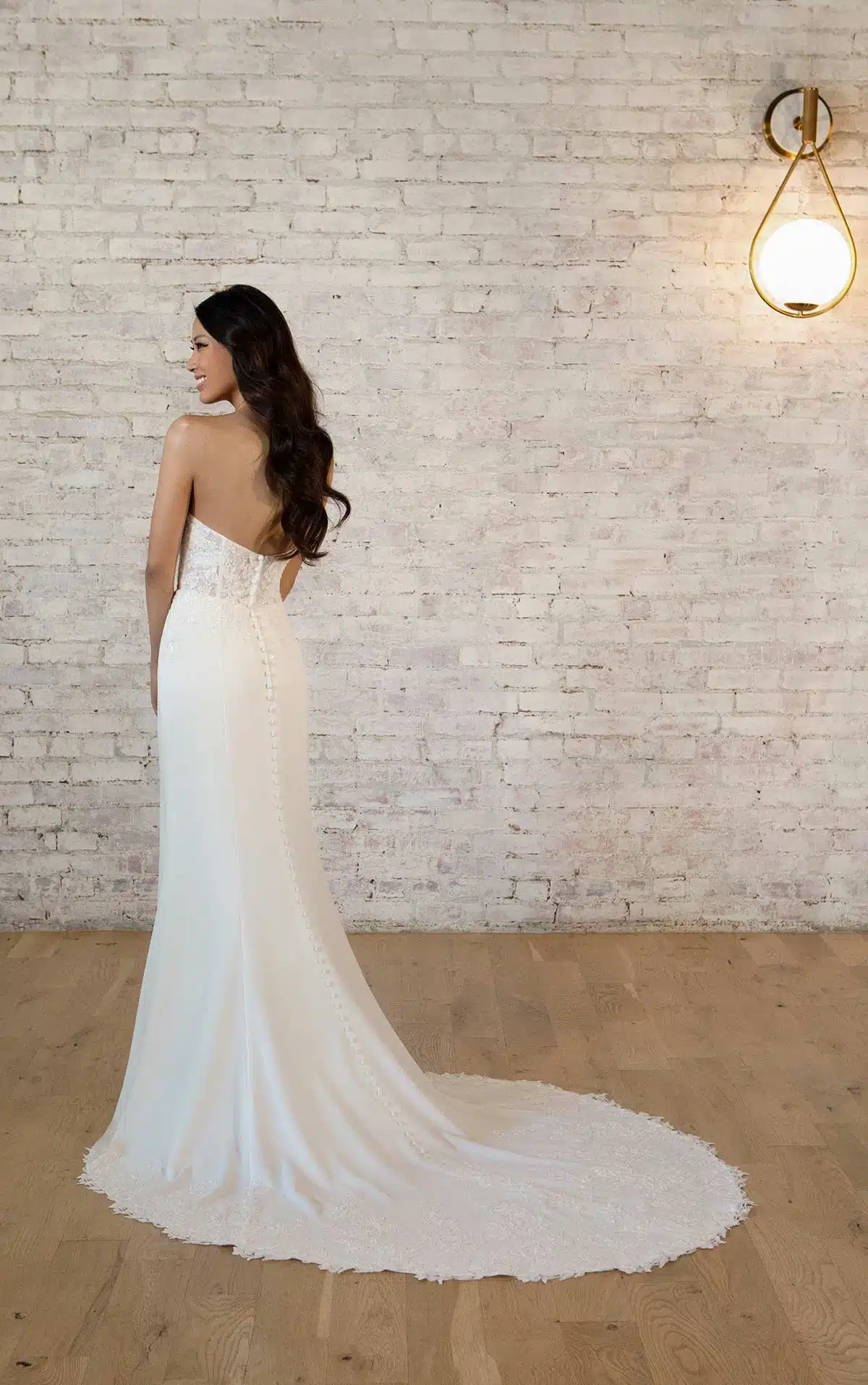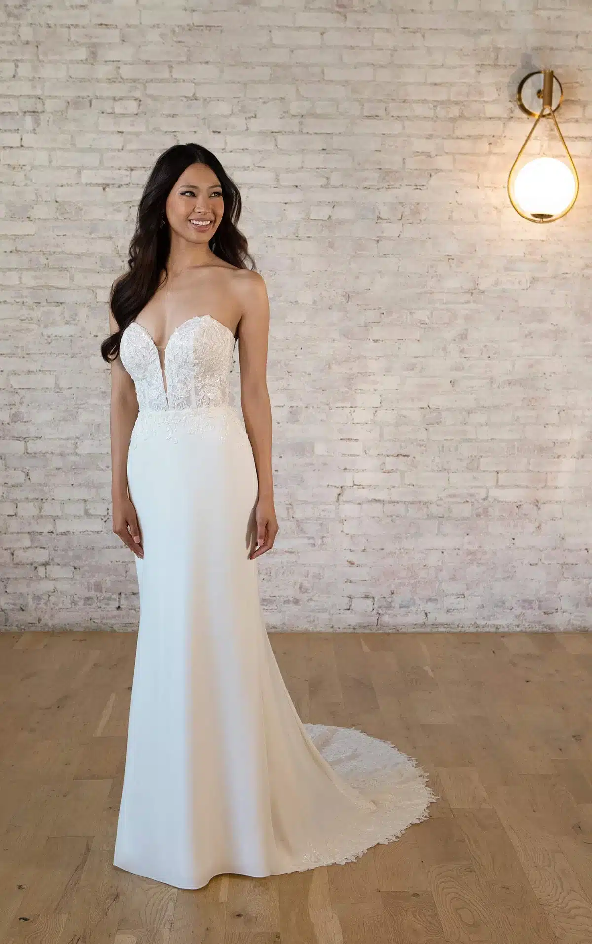 7597 ist ein elegantes trägerloses und figurbetontes Hochzeitskleid mit Spitze und luxuriösem Krepp. Ein sanftes Funkeln geht von der Spitze des herzförmigen Mieders aus, bevor es in ein tiefes Dekolleté mit Porzellantüll übergeht. Die Taille geht anmutig in einen Rock aus Crêpe über, der eine lange und königliche Silhouette formt. Ein stoffbezogenes Knopfdetail am Rücken trifft auf eine sanft geschwungene Schleppe, die mit zarter Spitze und sanft funkelnden Akzenten eingefasst ist.