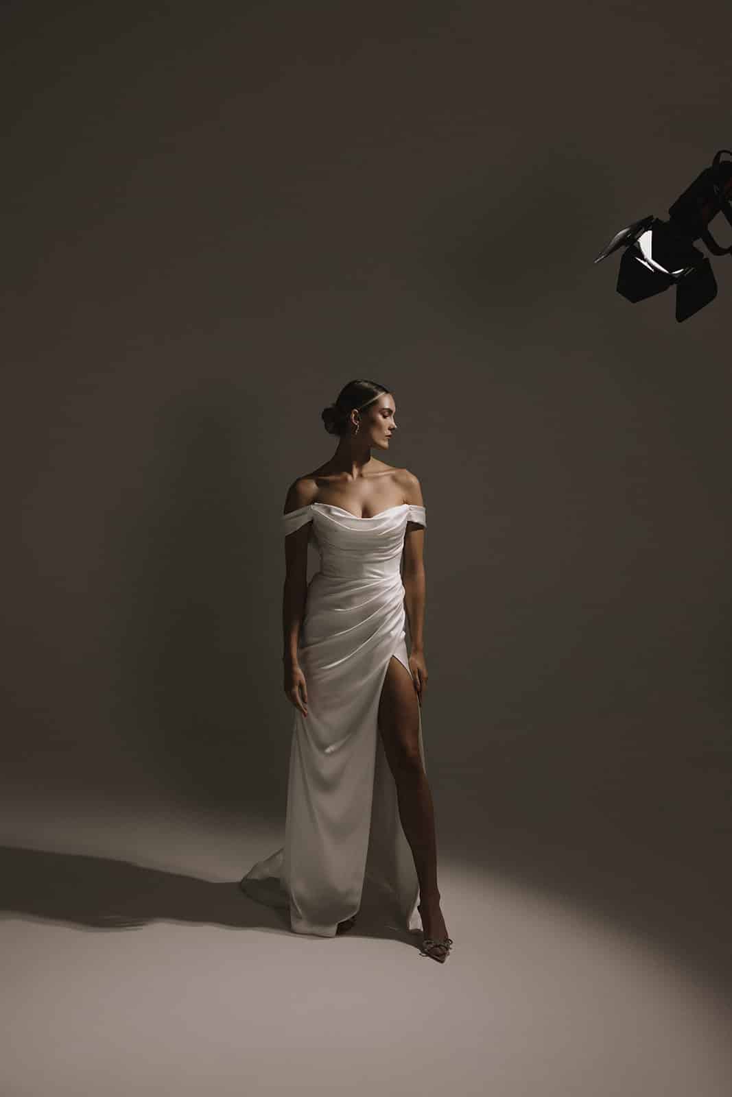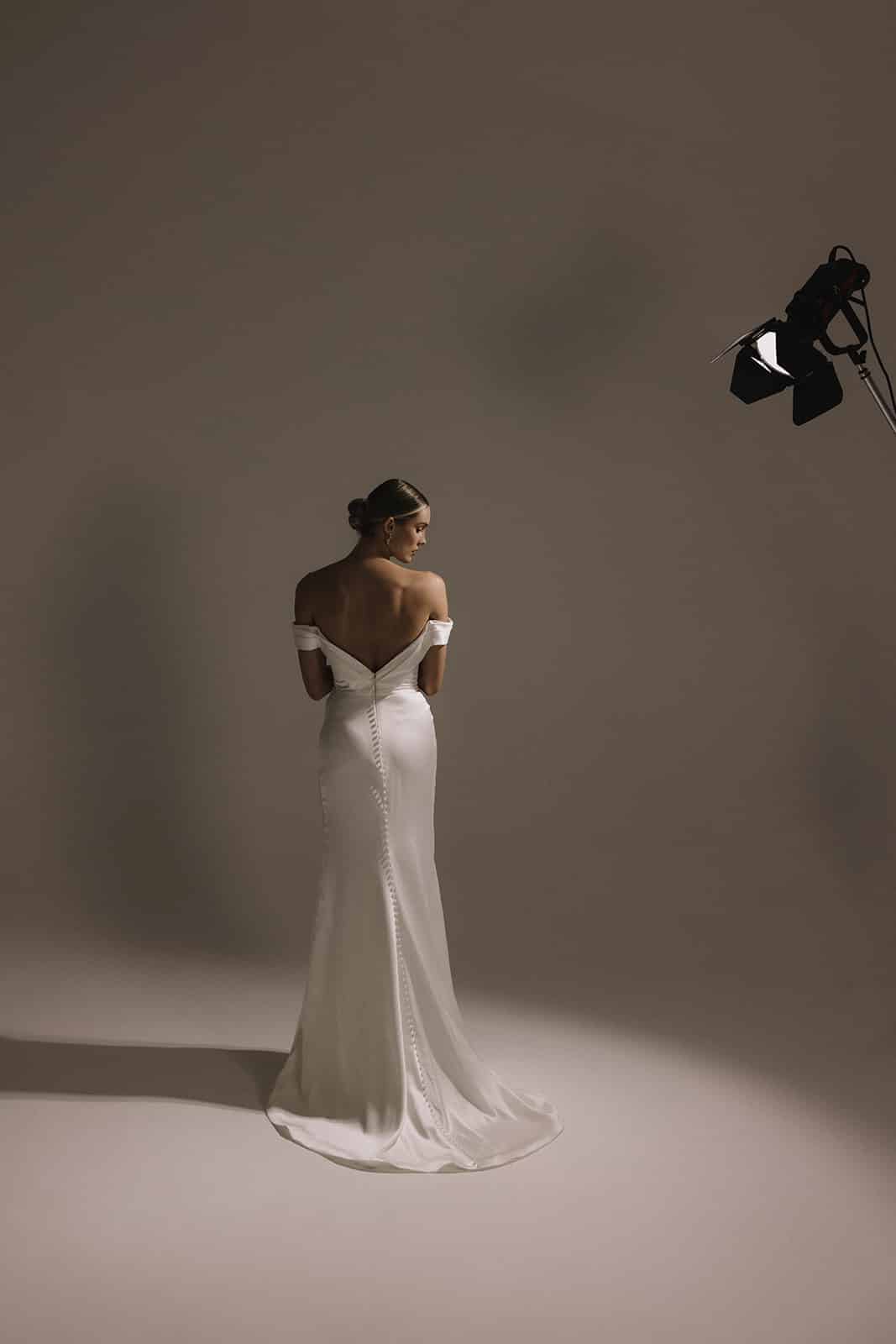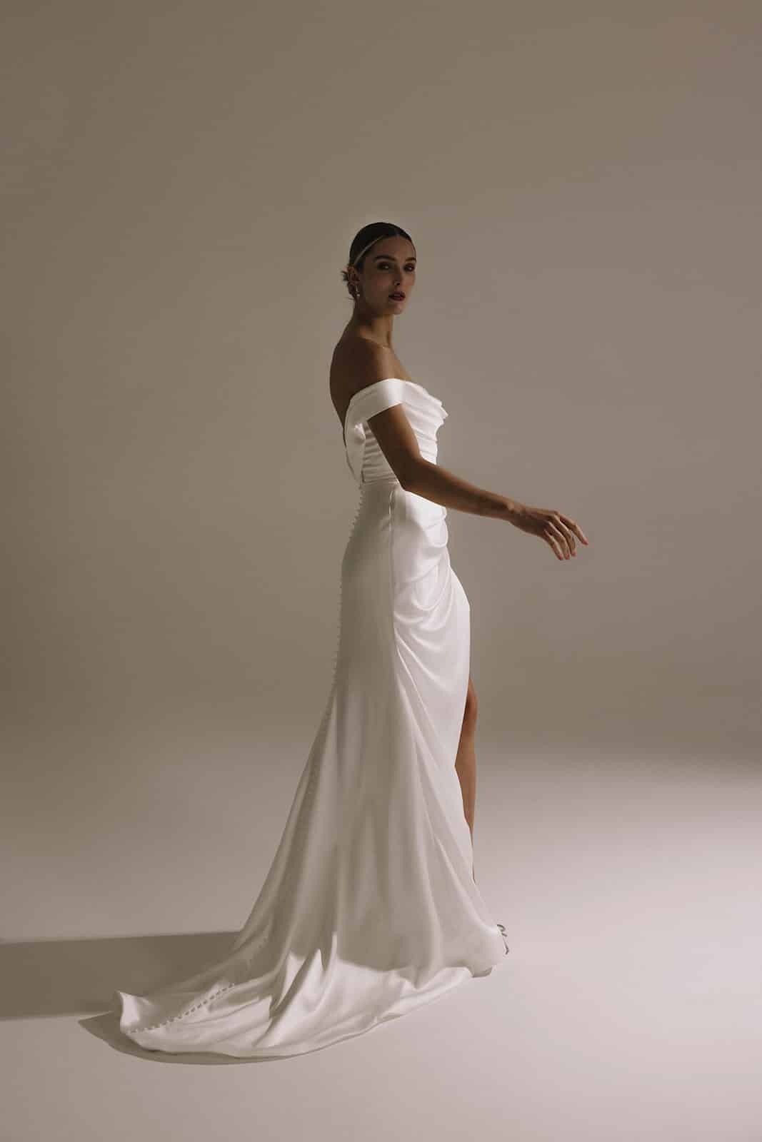 Die modellierte Schulterpartie von Allura legt sich über die Brust und verleiht dem herzförmigen Ausschnitt eine moderne Note. Die Ärmel wickeln sich zu einem atemberaubenden tiefen V-Rücken, wo eine Reihe von Kunstperlen zu einer kleinen, aber eleganten Schleppe fließt. Das Mieder sorgt für ein zeitgemäßes Styling, während die Falten von der Taille aus einen hohen Schlitz bilden, der einen Blick auf das Bein freigibt.