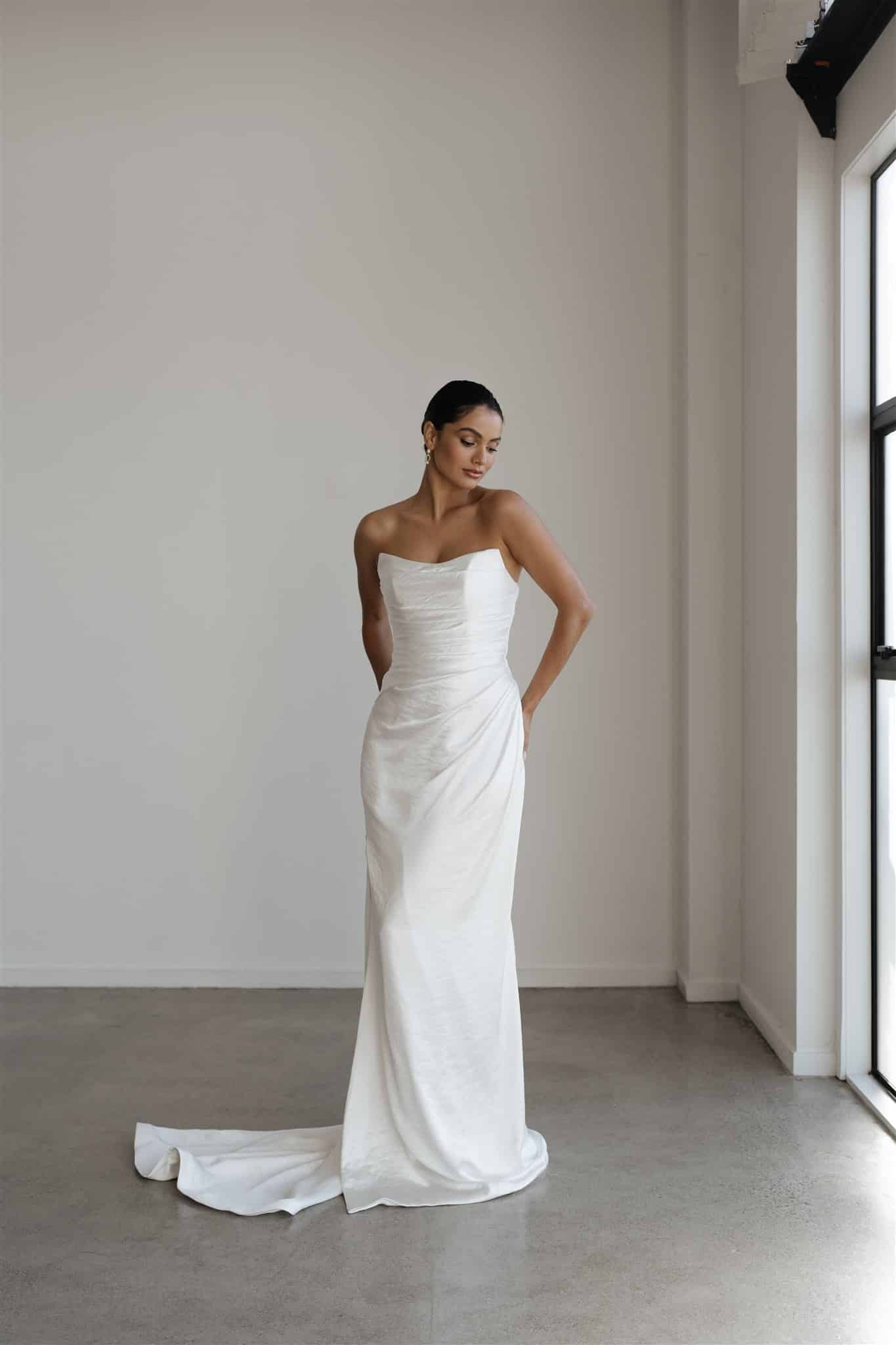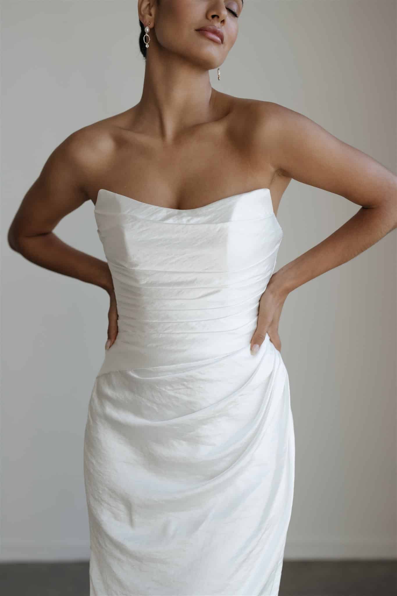 Setze ein Statement mit dem Argent-Kleid, das Selbstbewusstsein und Eleganz ausstrahlt. Der trägerlose Ausschnitt bietet genau die richtige Menge an Bedeckung mit subtilen Spitzen für einen Hauch von Modernität. Die Plissee-Konstruktion fließt wie Wasser um das korsettierte Mieder und schafft eine schmeichelhafte, göttliche Silhouette, die mühelos über die Hüften fällt. Ein dezenter Seitenschlitz lässt das Bein aufblitzen und verleiht dem minimalistischen Design einen Hauch von Sinnlichkeit. Das Argent-Kleid ist mit einer Reihe opulenter Kunstperlen verziert. Das Argent-Kleid ist in Crush-Satin für einen flüssigen und verführerischen Look. Bestellbar ist es zudem in French Crepe und in Stretch-Mikado-Seidendrill-Satin.