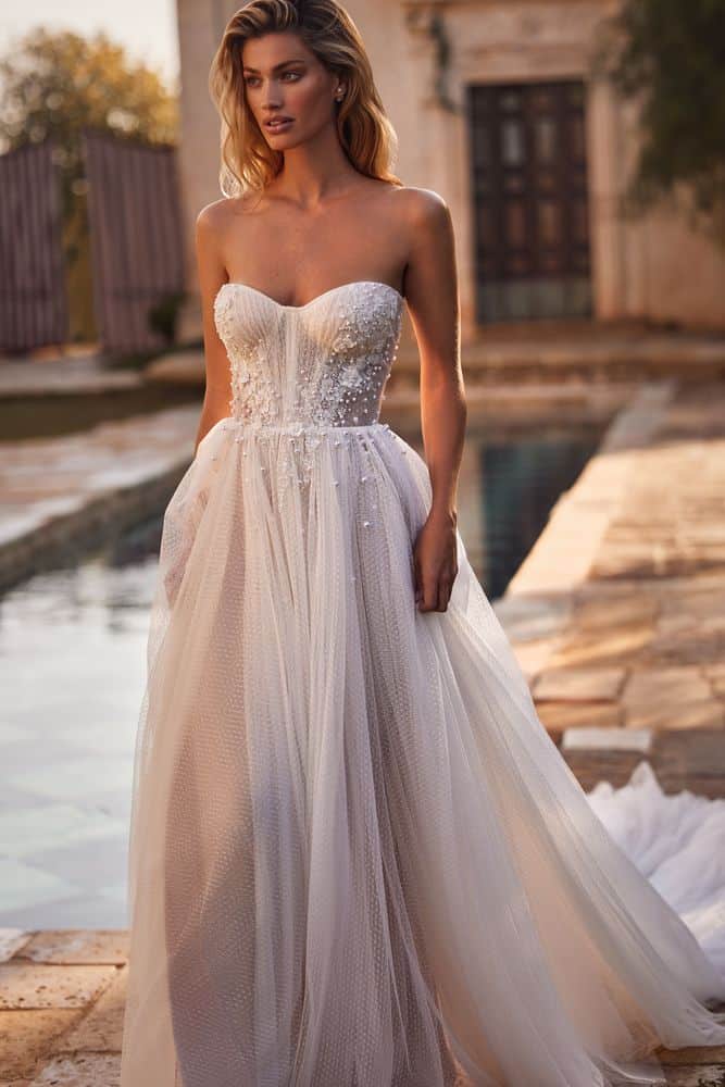 Traumhaftes A-Linien-Hochzeitskleid aus leichtem, drapiertem Mesh-Tüll, handverziert mit 3D-Blumen und Perlen. Mit einem herzförmigen, halbtransparenten Korsett, das mit 3D-Blumen und Perlen verziert ist, die vom Mieder bis zum oberen Rockteil reichen, einem geschlossenen, verzierten, halbtransparenten Rücken mit Reißverschluss und einem fließenden Maxirock mit Midischleppe.