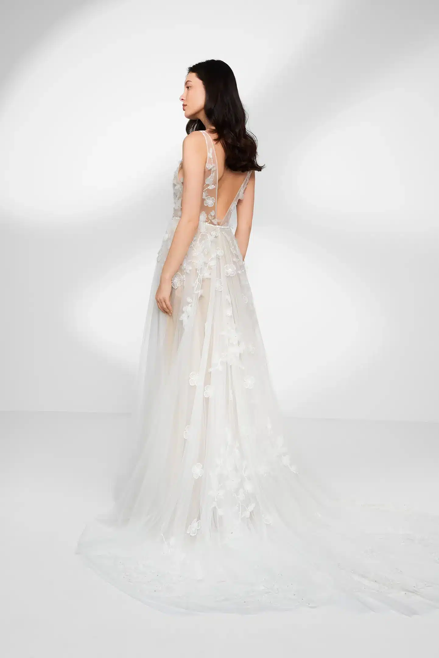 Skulpturale, dreidimensionale, mit zarten Kristallen verzierte Stickereien verbinden sich mit einer klassischen Anna Kara Silhouette mit tiefem V-Ausschnitt und einem fein verzierten schmalen Gürtel.