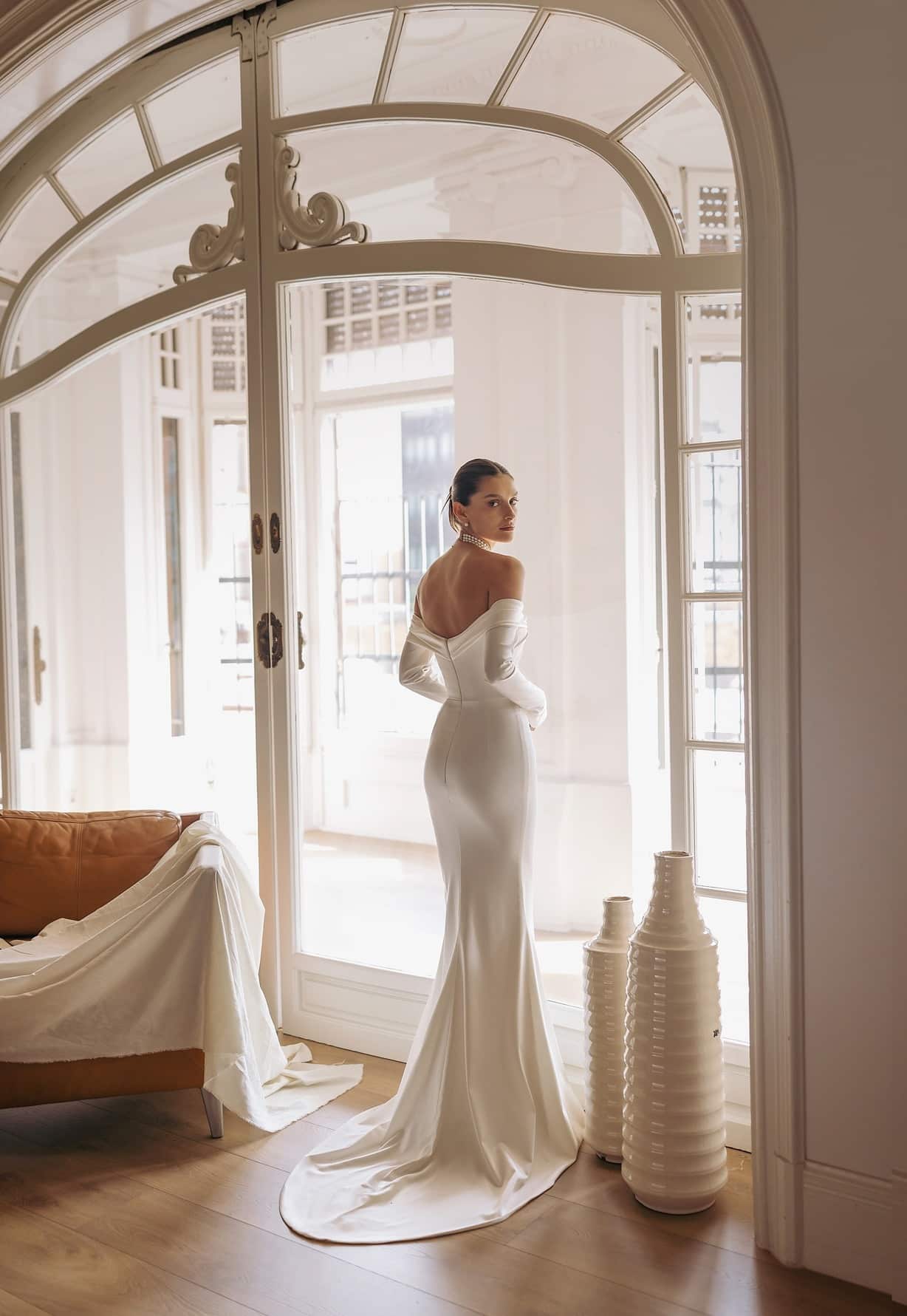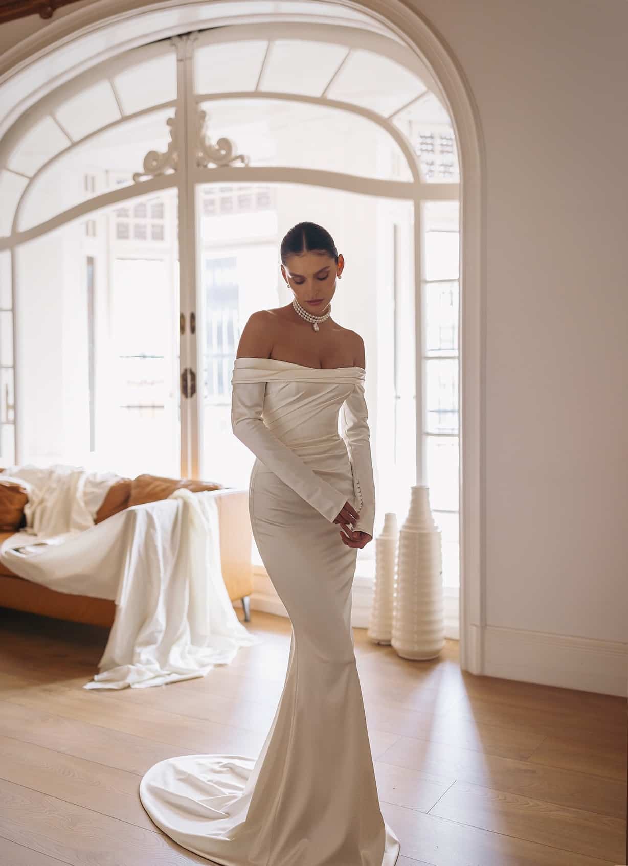 Attika – Langärmeliges Kleid mit Off-Shoulder-Träger und leichter, seitlich geschlungener Silhouette mit verlängertem Ausschnitt.