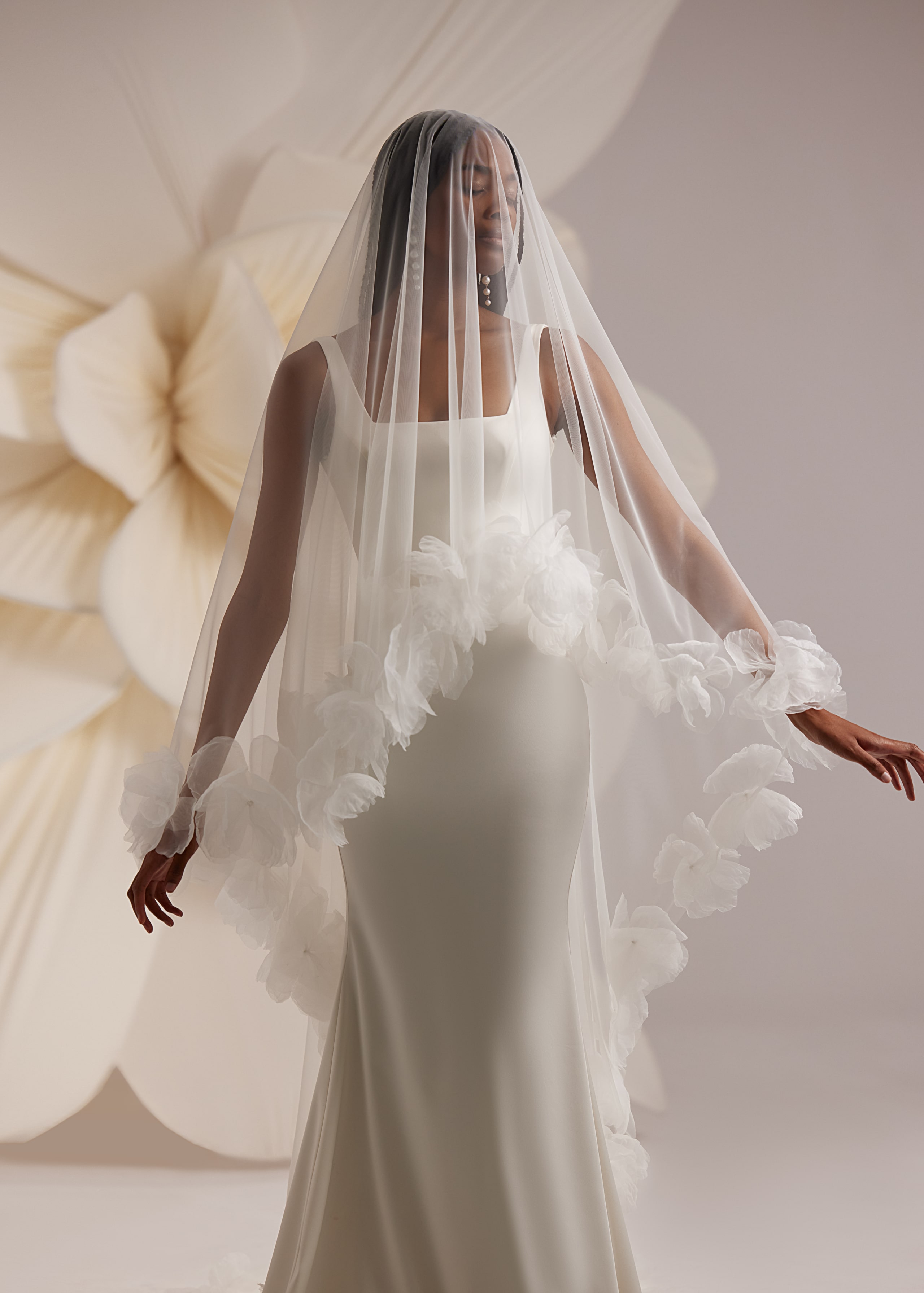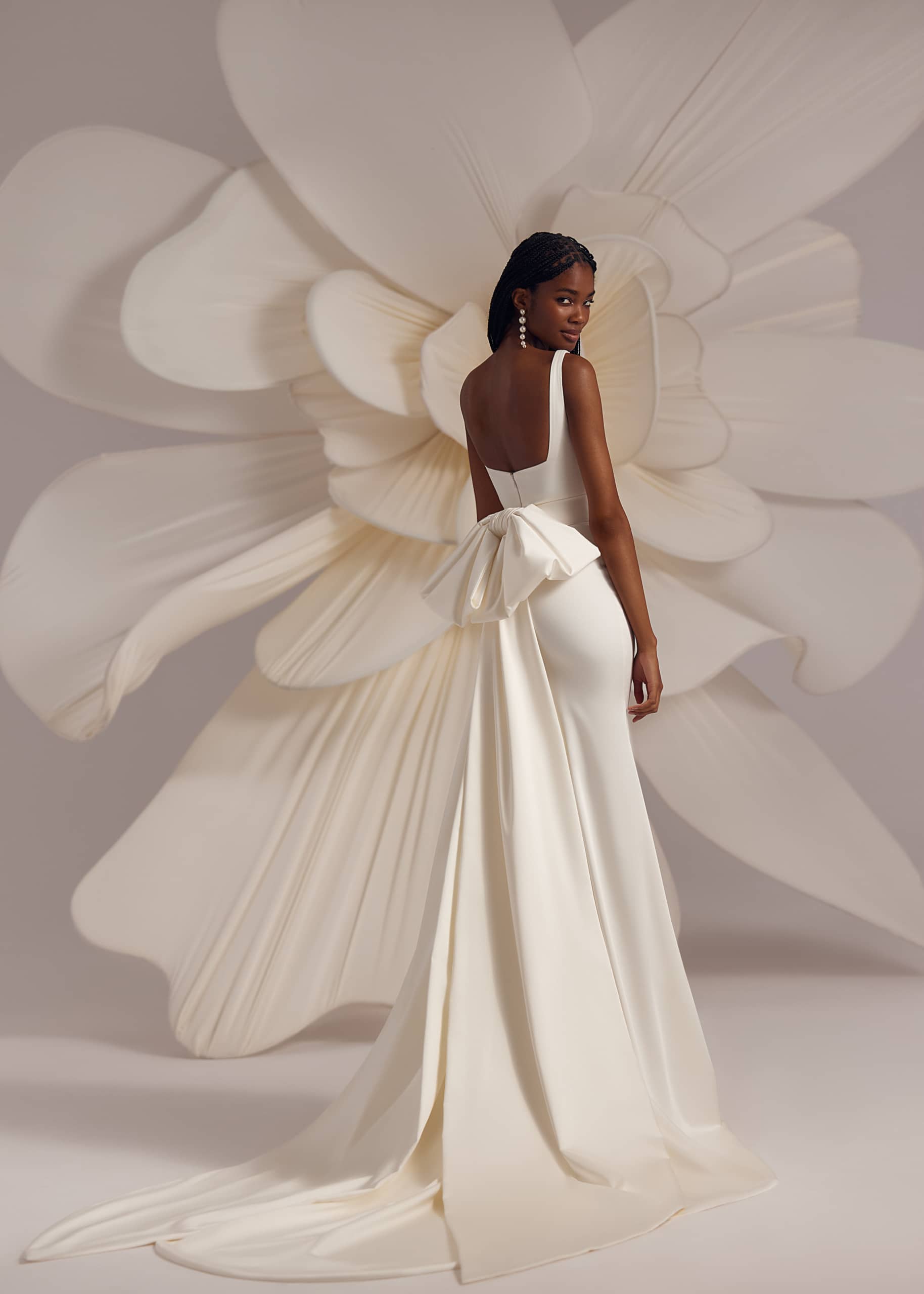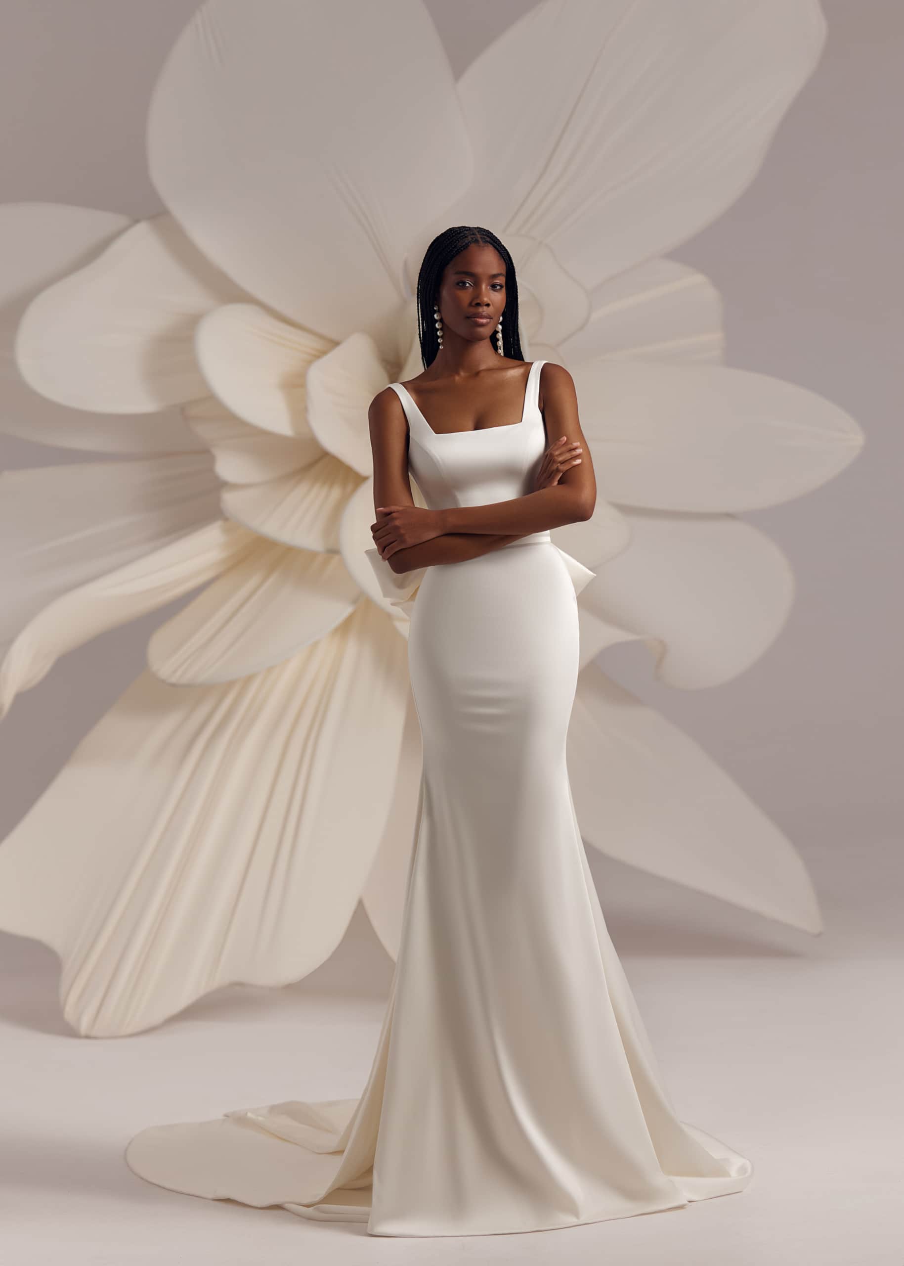 Tailliertes Kleid mit quadratischem Ausschnitt, verlängertem Rock und abnehmbarer, breiter Schleife auf dem Rücken. Ergänzt mit einem transparenten Schleier, der am Rand mit voluminösen Blumen verziert ist.