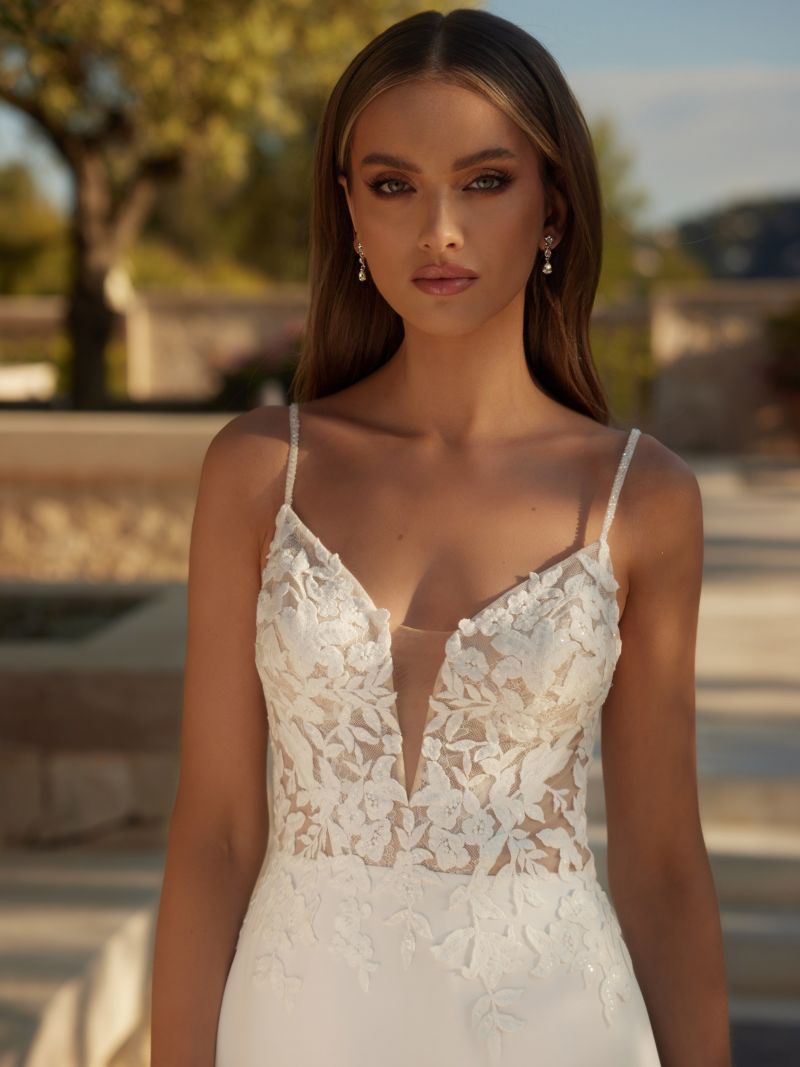 BERYL ist ein Brautkleid in A-Linie aus hochwertigem Chiffon und Spitze. Das moderne Brautkleid hat ein ärmelloses Design und kommt mit sinnlichen Trägern vorne und V-Rücken.