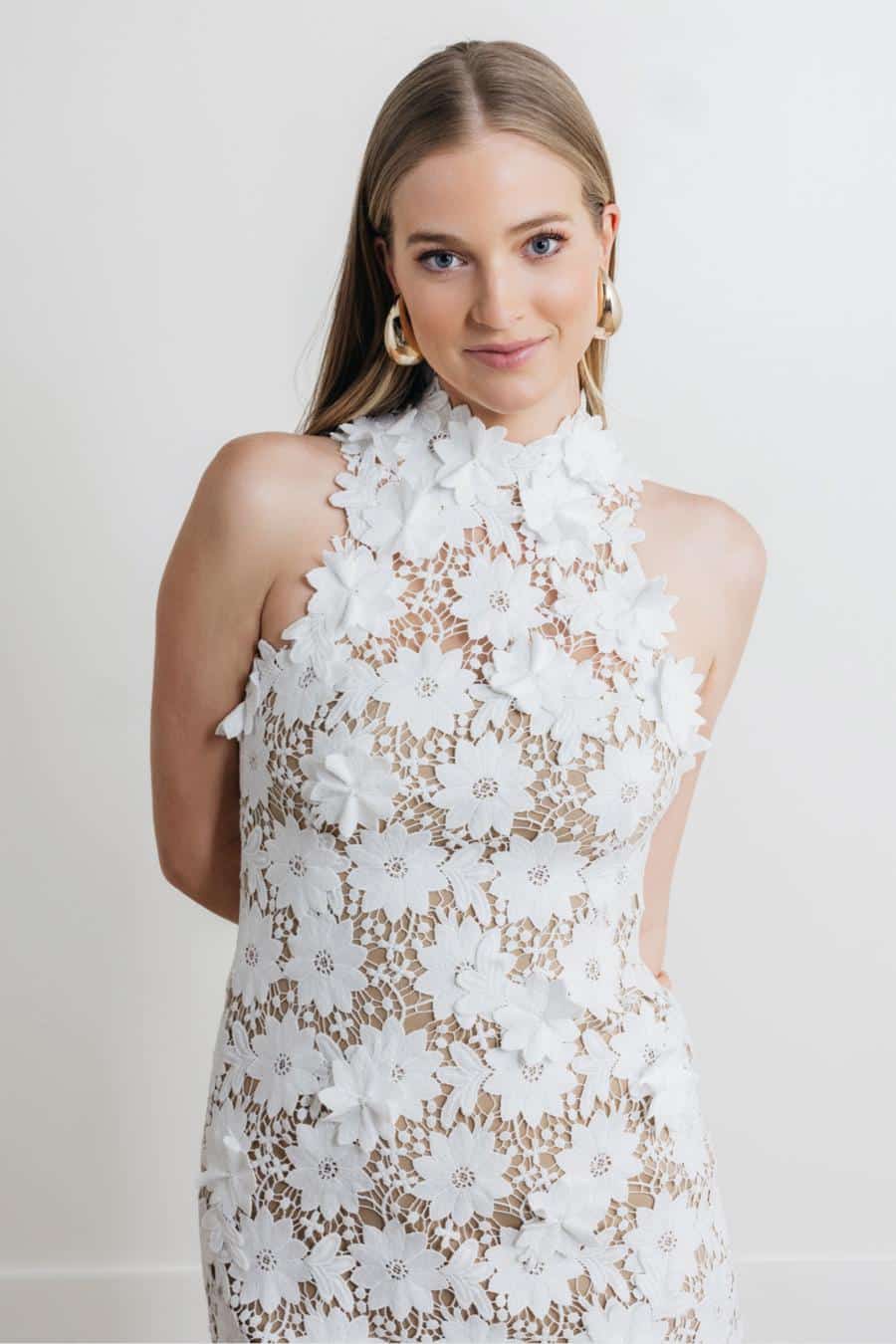 Bouquet hat einen modernen Neckholder-Ausschnitt und eine schicke Etuikleid-Silhouette.