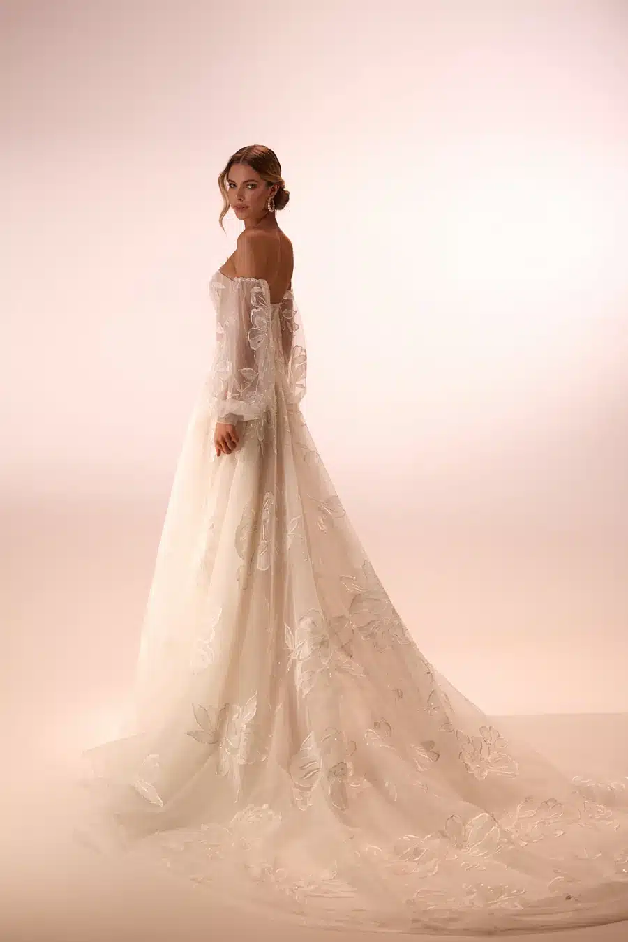 Atemberaubende, große Blüten-Applikationen zieren den glitzernden Tüll, dessen mehrere Lagen den voluminösen Rock formen. Ein trägerloses Korsett mit tiefem V-Ausschnitt setzt die Figur der Braut auf majestätische Art in Szene, während die abnehmbaren, mit Blumen verzierten Puffärmel einen Hauch von Romantik verleihen. Die lange Schleppe ist eine Selbstverständlichkeit für eine erhabene Kreation wie Caesaria. Das Traumkleid ist in den Farben Puderrosa und Elfenbein gehalten.
