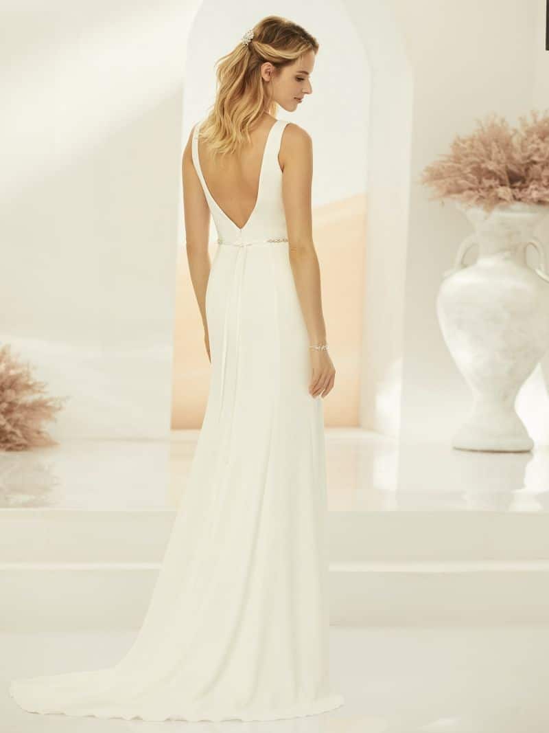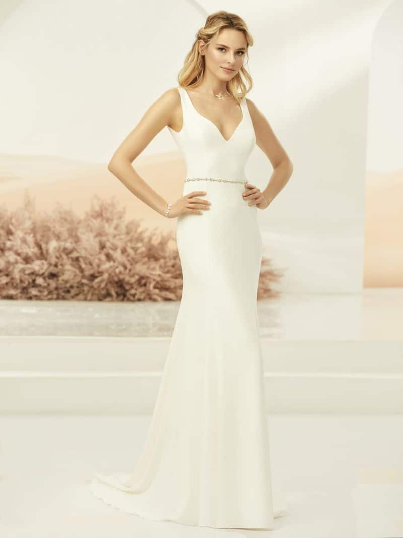 Calva in A-Linie besteht aus hochwertigem Stretch-Krepp und kommt mit geradem Rock und Schleppe. Sie hat einen wunderschönen eleganten V-Ausschnitt auf Vorder- und Rückseite.