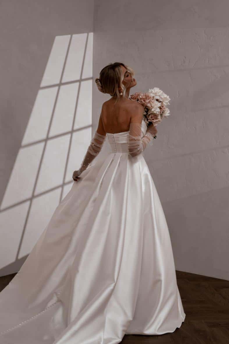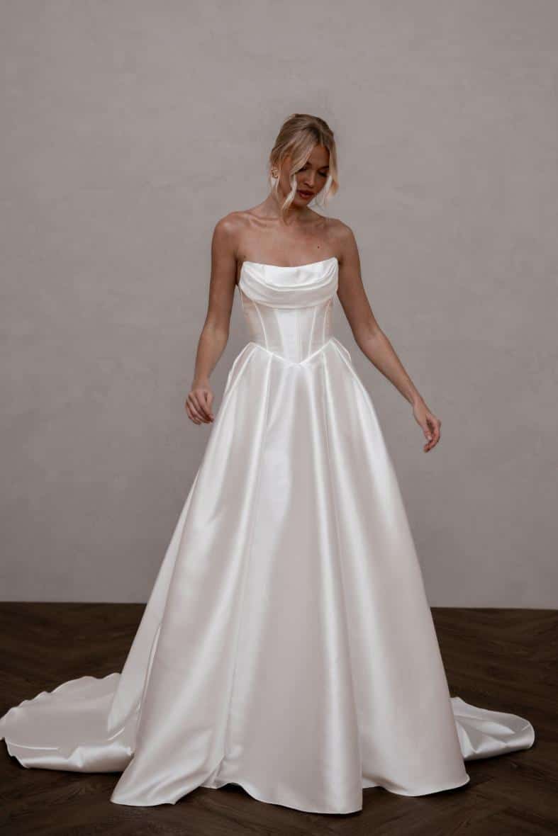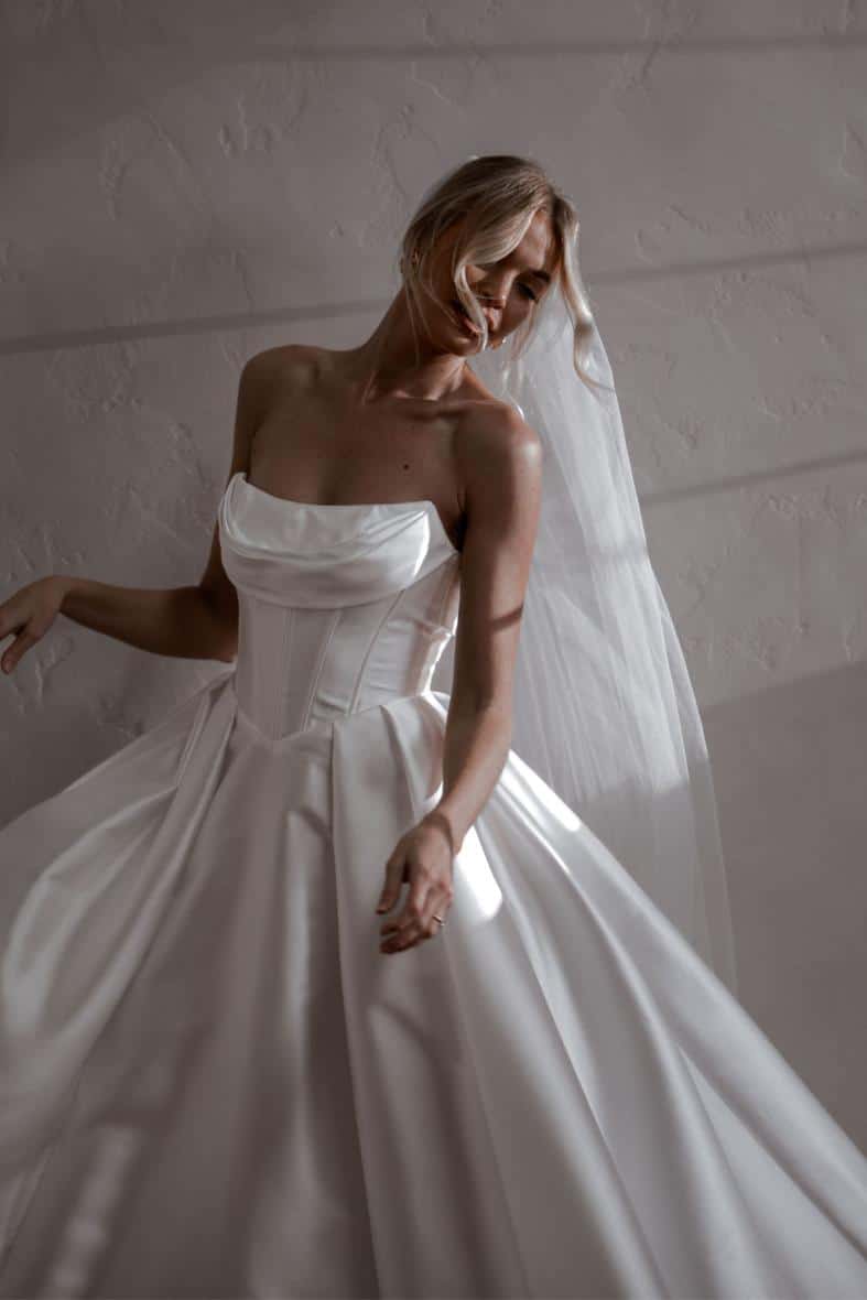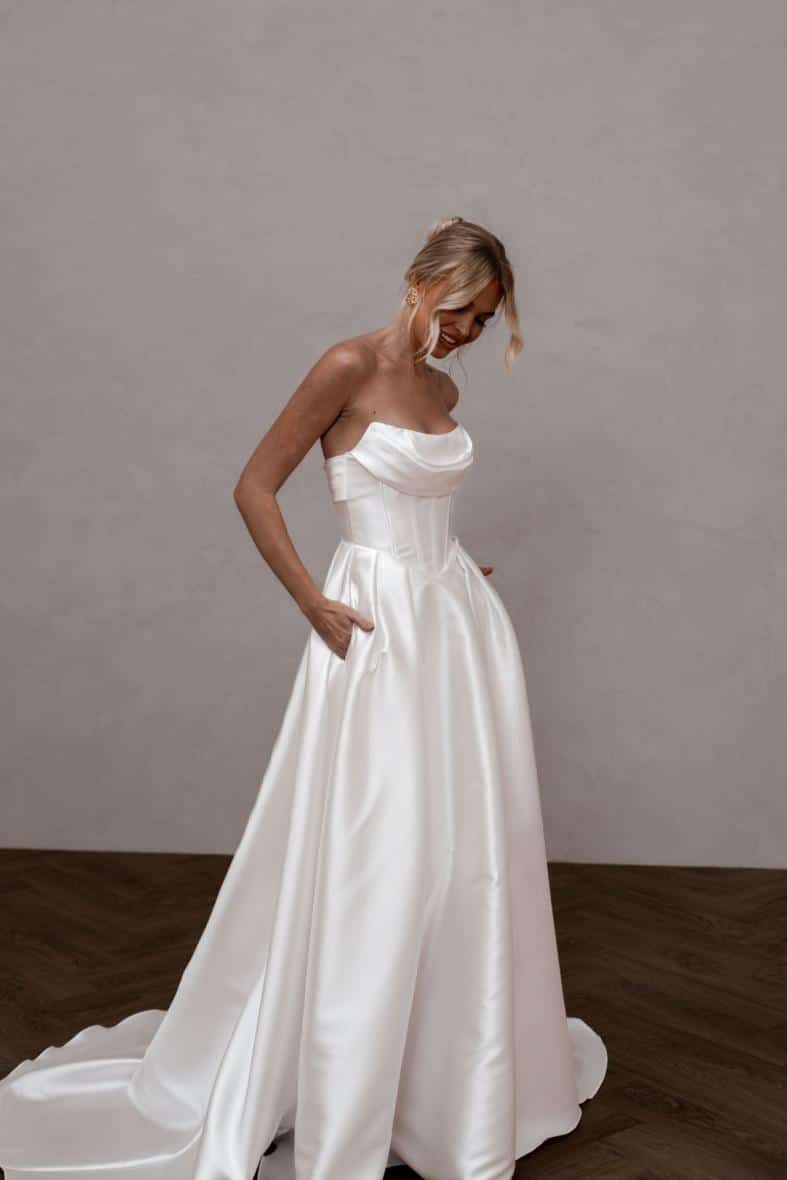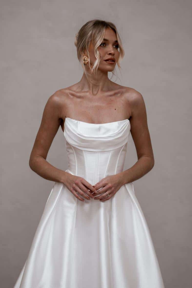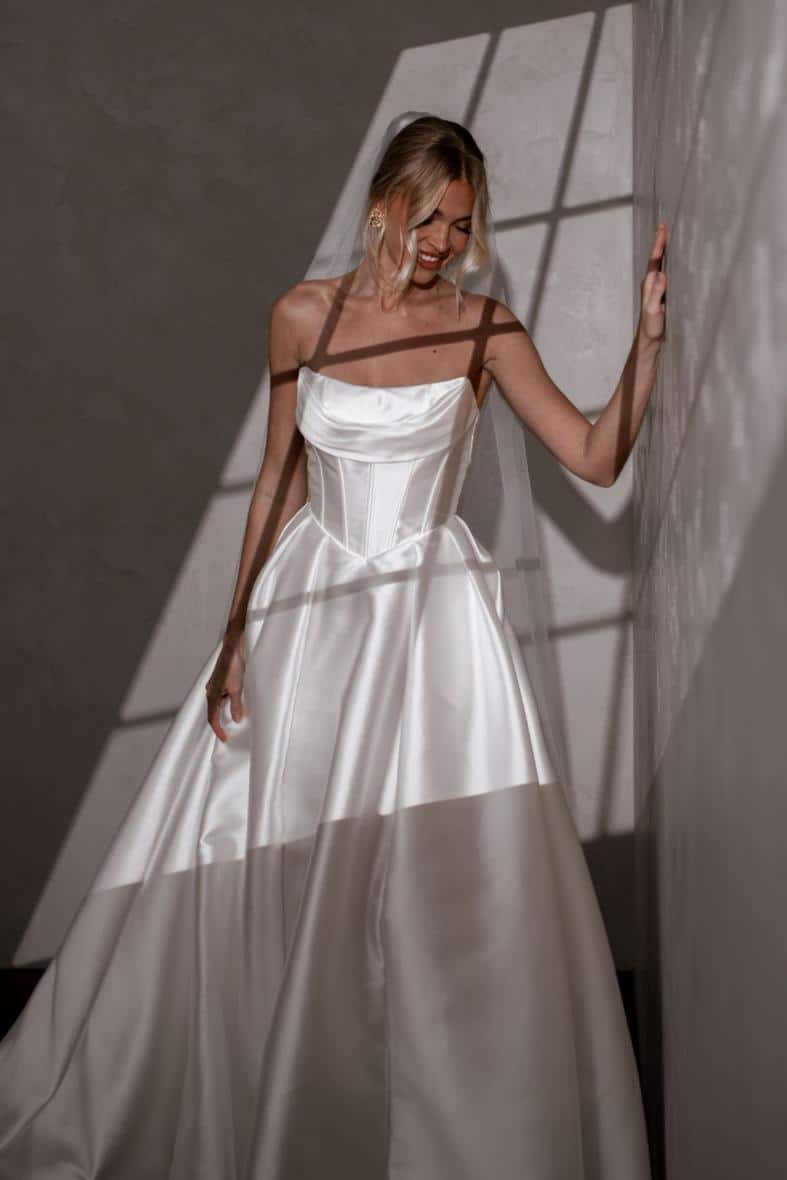 Celine ist nichts weniger als königlich: Die elegante, fallende Taille, der luxuriöse, voll gefaltete Mikado-Rock und die aufwendigen, korsettartigen Miederdetails sind wie aus einem Märchen.