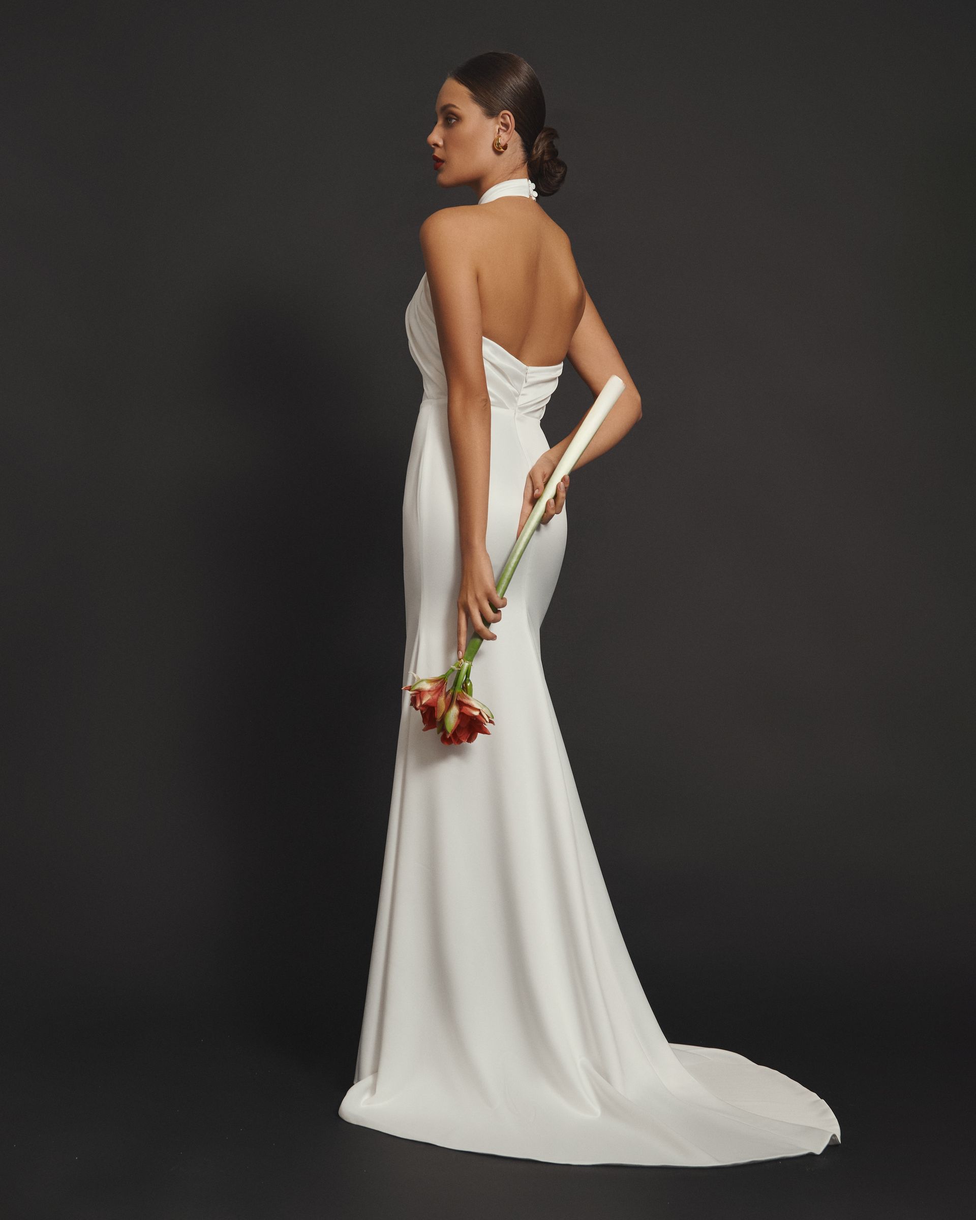 Satin-Kleid mit Neckholder-Ausschnitt demonstriert die Eleganz der weiblichen Silhouette. Das Oberteil mit Design Drapierung und Ausschnitt an der Taille sowie dem Mermaid-Rock überwältigt mit seinem Luxus und Schlichtheit.