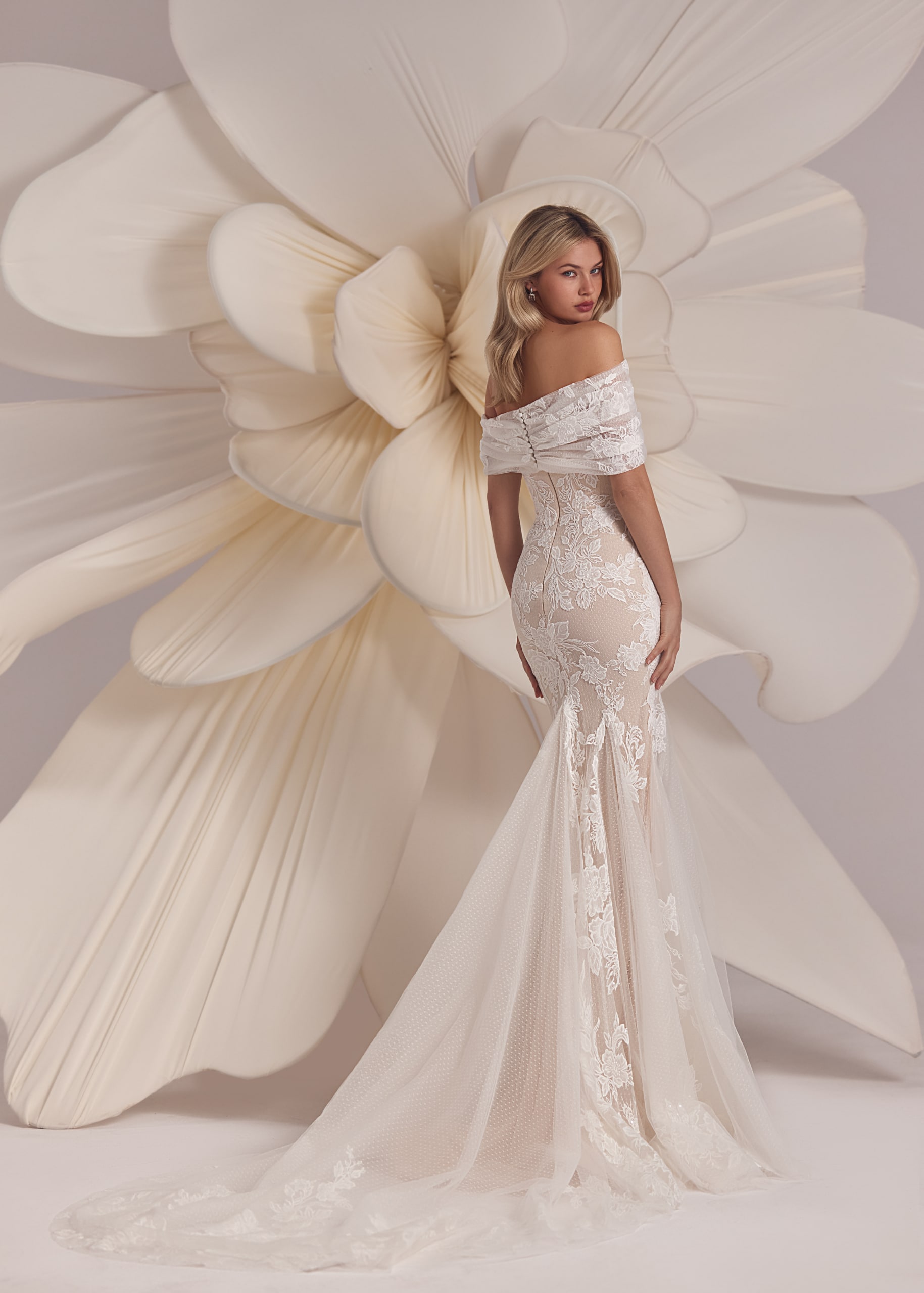 Dieses schulterfreie Brautkleid mit Meerjungfrau-Silhouette und aus luxuriöser Guipure-Spitze verführt mit einem romantischen Carmen-Ausschnitt und einer eleganten asymmetrischen Linie. Perfekt für die moderne Braut, die klassische Eleganz und verführerische Raffinesse vereinen möchte.