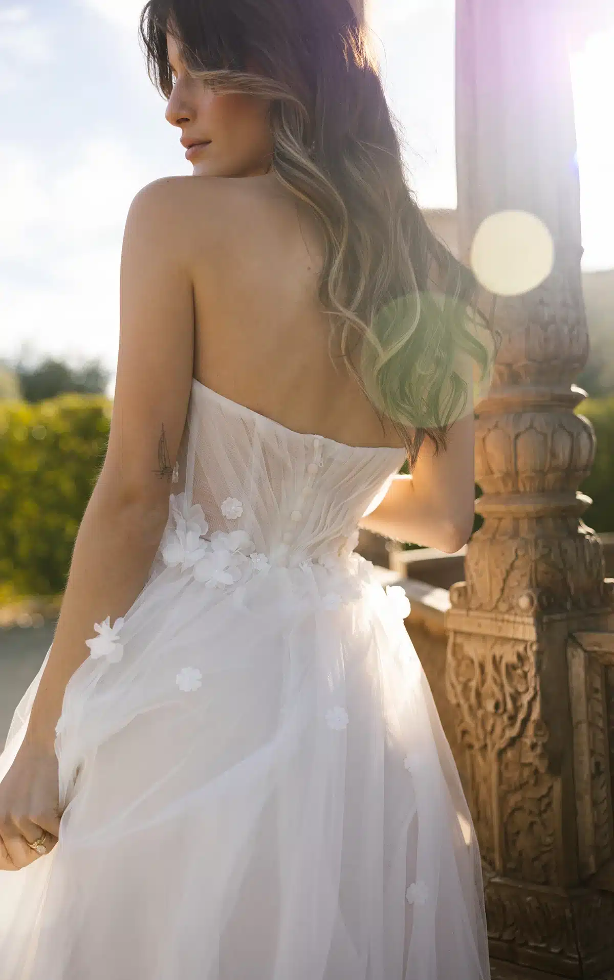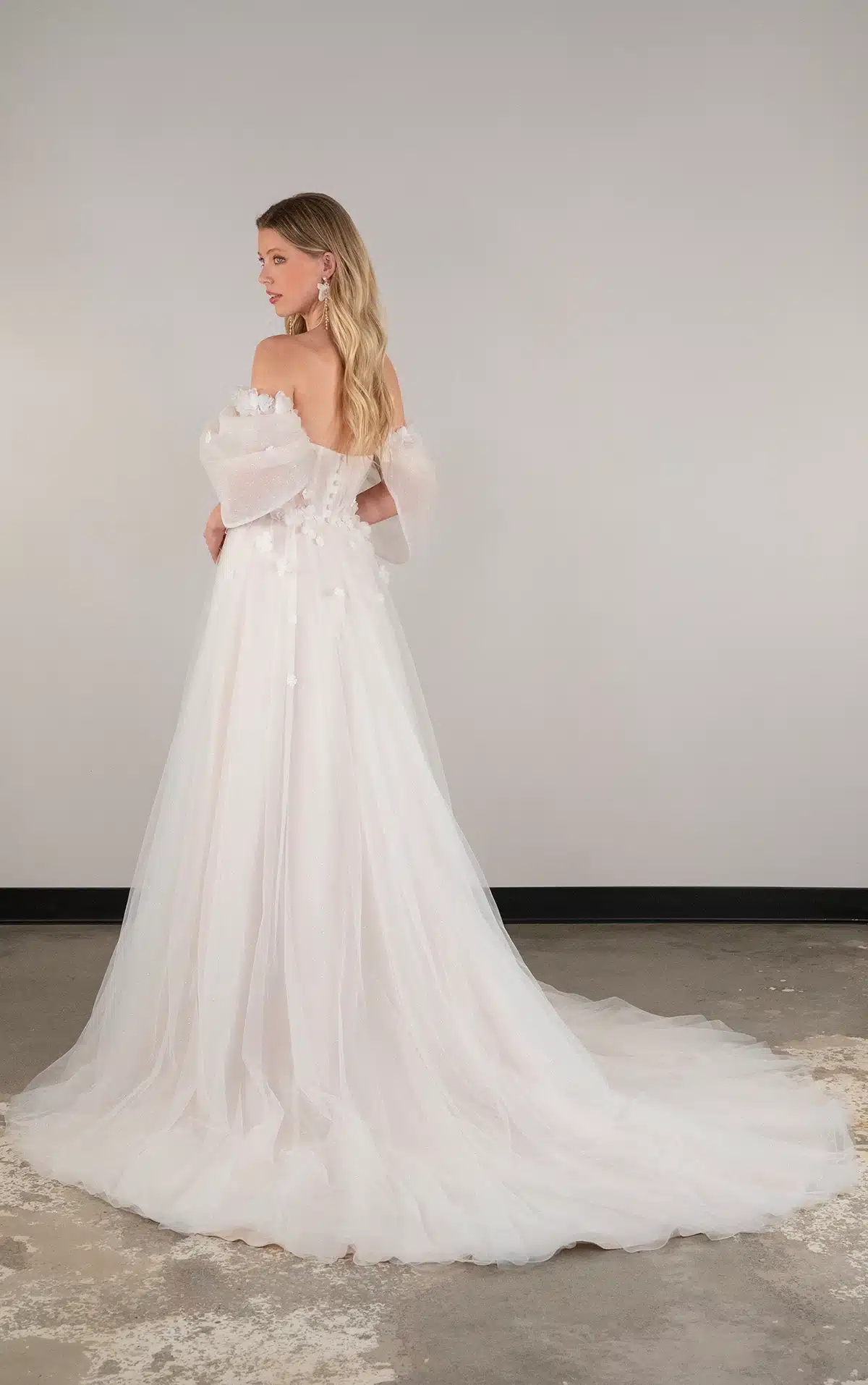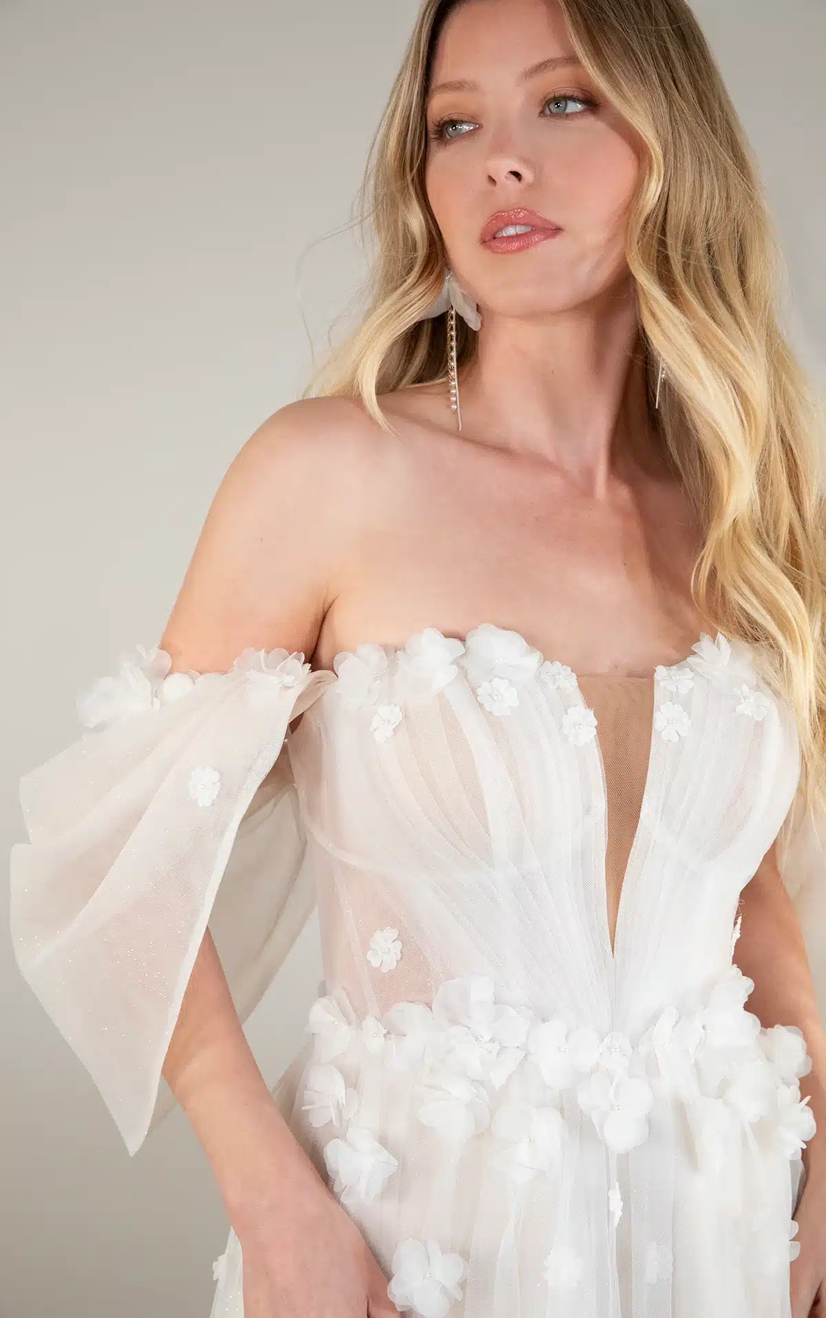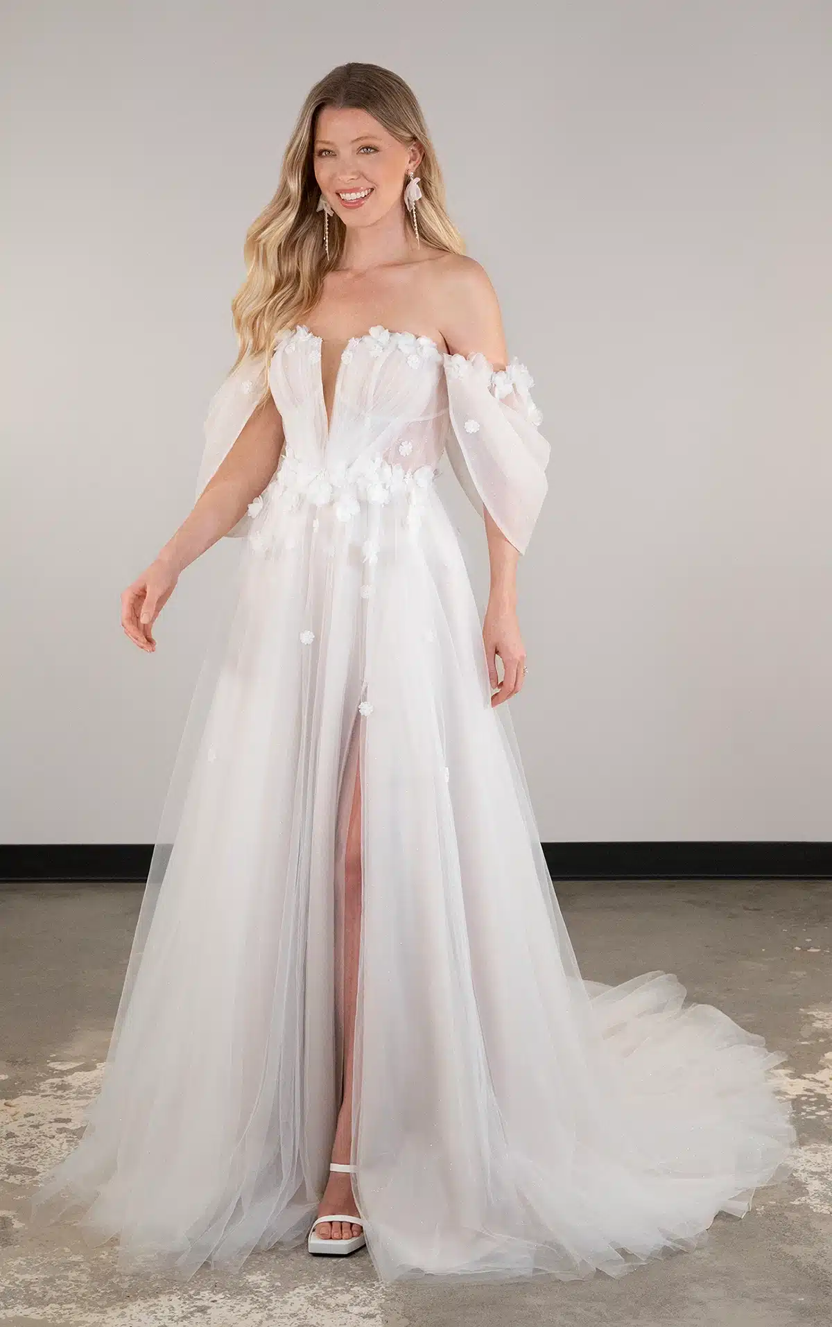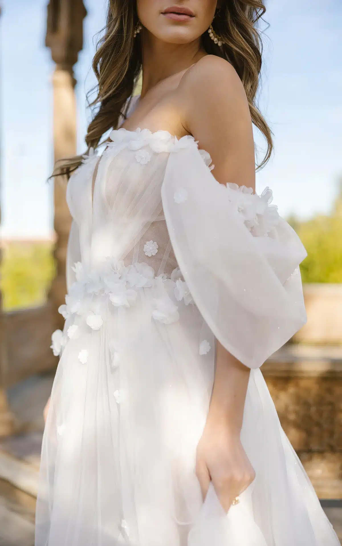 Abnehmbare schulterfreie Träger mit zarten 3D-Blumenakzenten flattern über den Oberarm, bevor sie sich im modernen, trendigen Stil puffen. Ein tiefer herzförmiger Ausschnitt sitzt über dem gerafften transparenten Korsett-Oberteil und trifft auf eine mit 3D-Blumen verzierte Taille. Der leicht drapierte A-Linien Rock enthüllt bei jedem Schritt einen subtilen Beinschlitz und verbindet Vintage-Charme mit modernem Design. Dieses Hochzeitskleid aus geblümter Spitze fängt die Essenz eines modernen Märchens ein und ist perfekt für das Happy End.