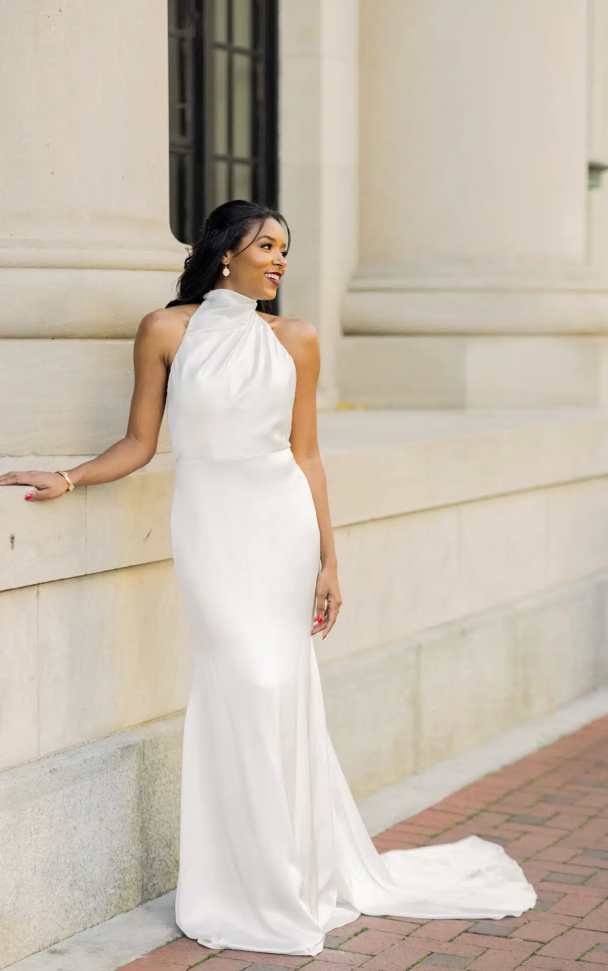 Luxuriöse Schlichtheit trifft auf zeitlose Eleganz in Style D4123, einem sexy Neckholder-Hochzeitskleid im Charmeuse Stoff. Ein raffiniert drapierter Neckholder-Ausschnitt umhüllt den Hals und geht in das Mieder über, bevor er einen dramatischen offenen Rücken enthüllt, der auf die Taille trifft. Die taillierte Säulensilhouette umschmeichelt die Figur mit schmeichelhaften Nähten, bevor sie anmutig in eine sanft geschwungene Schleppe übergeht. Gefüttert mit zeitlosen Perlenknöpfen am Rücken, ist dieses hochgeschlossenes Hochzeitskleid mit tiefem Rücken bereit für den Laufsteg und den Gang zum Altar.