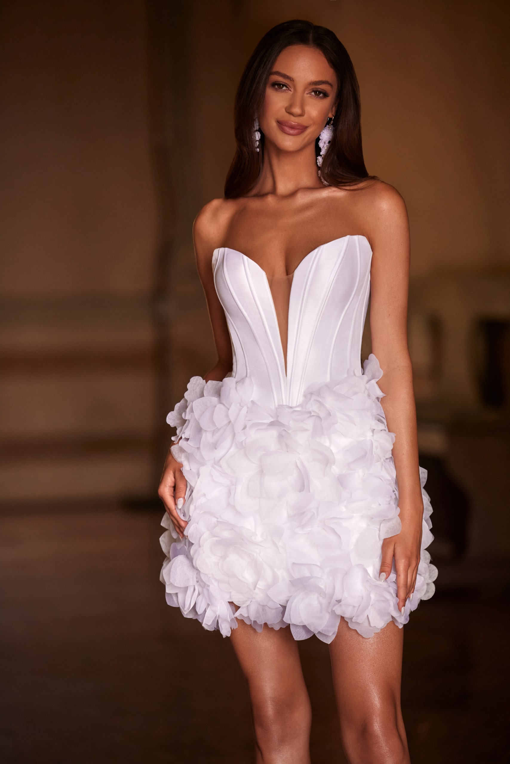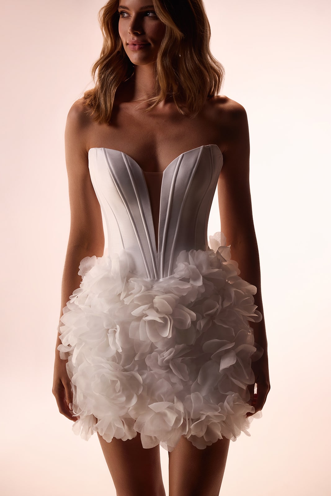 Dalia ist ein atemberaubendes Brautkleid für die standesamtliche Hochzeit oder als zweites Outfit für die Braut, die sich am Hochzeitstag traut. Mutige Eleganz und zeitlose Schönheit vereinen sich im trägerlosen Korsett-Oberteil aus Satin. Der bis zur Taille reichende Herz-Ausschnitt betont Schultern und Hals. Dessen schlanke Silhouette mündet in einem Meer aus üppigen, handgefertigten Blütenapplikationen, die einen kurzen Rock formen. Verspielt und luxuriös hinterlässt Dalia einen bleibenden Eindruck.