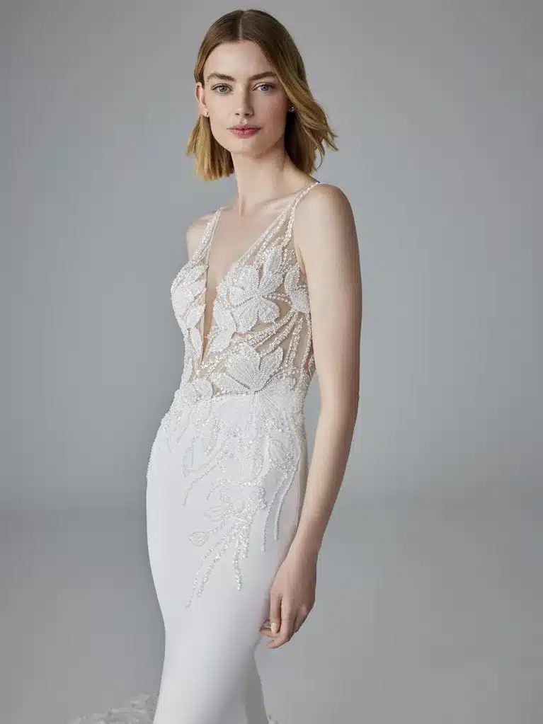 DEBBY ist elegant und verführerisch und wird an deinem großen Tag alle Blicke auf sich ziehen. Dieses Kleid aus Crêpe mit Meerjungfrau-Silhouette hat ein Mieder mit Trägern, einen V-Ausschnitt auf der Vorderseite und auf dem Rücken, Transparenzen und Spitze mit Strass, die dem Oberkörper und dem Hüftbereich eine romantische und verführerische Note verleihen. Der Rock hingegen schmiegt sich an die Figur der Braut an und betont diese, indem er sich sanft öffnet und in eine zarte Schleppe aus floraler Spitze mündet.