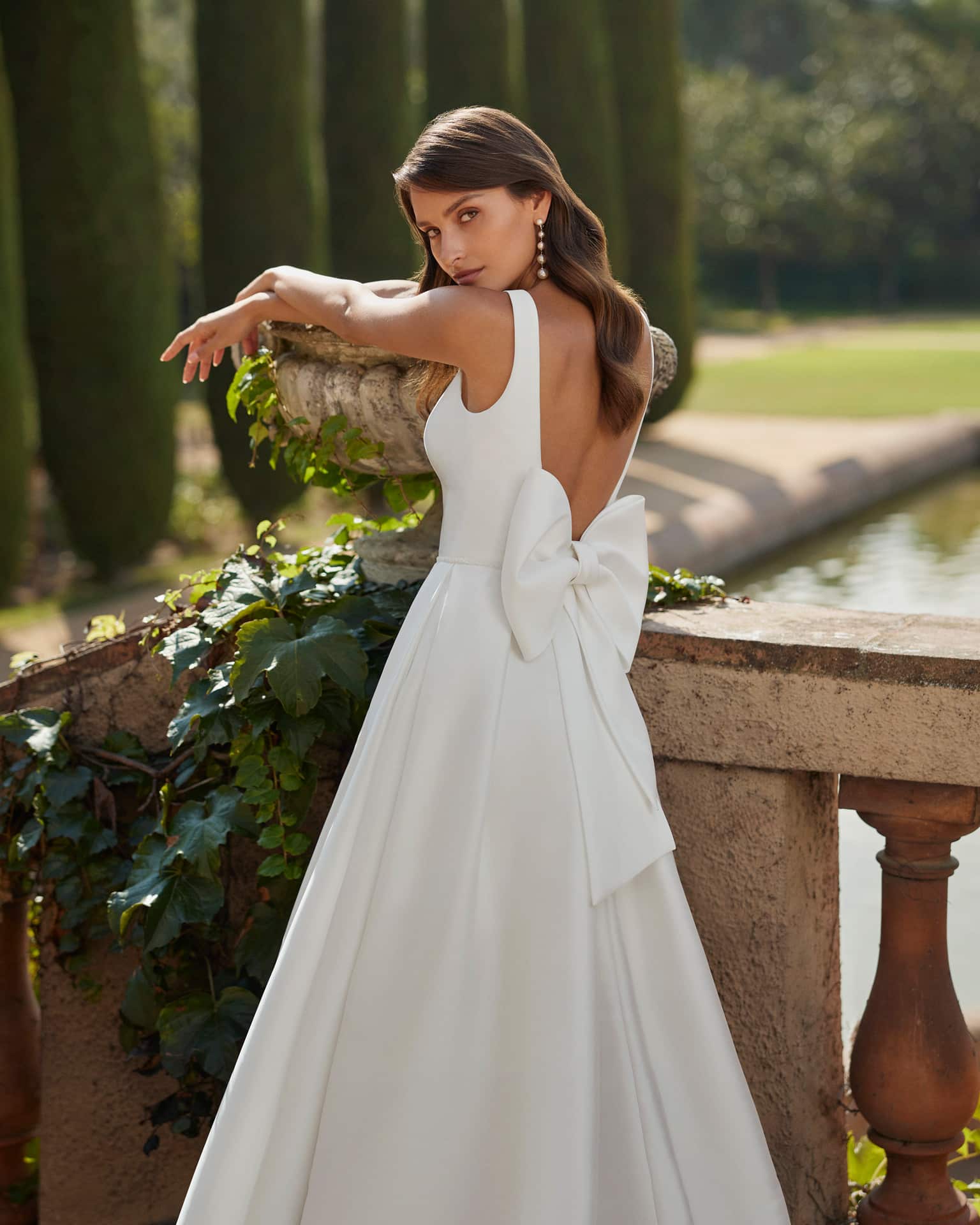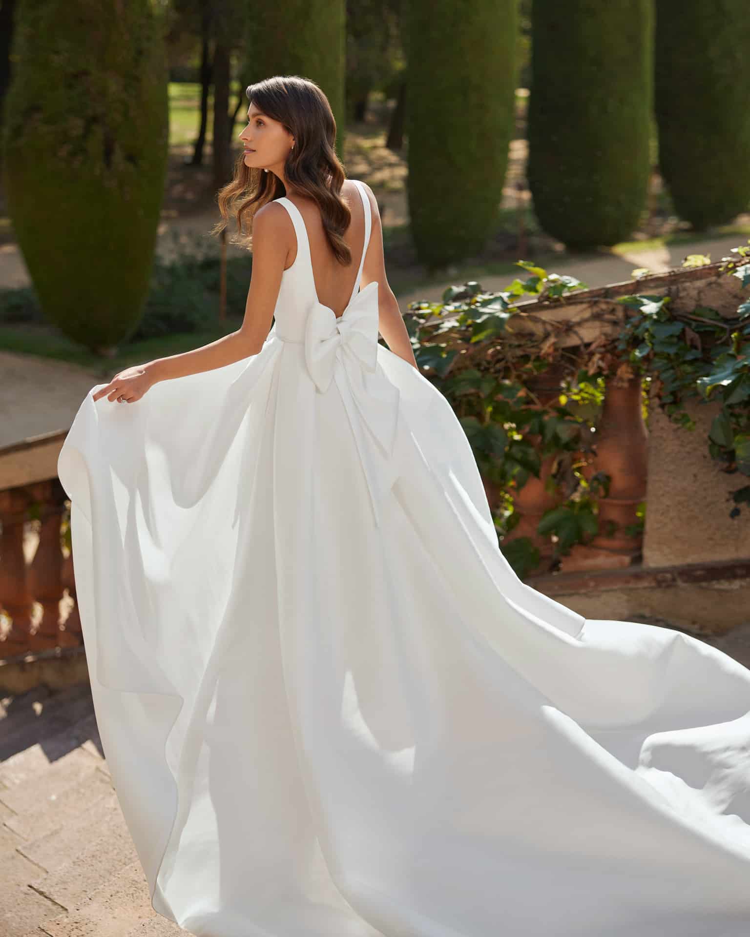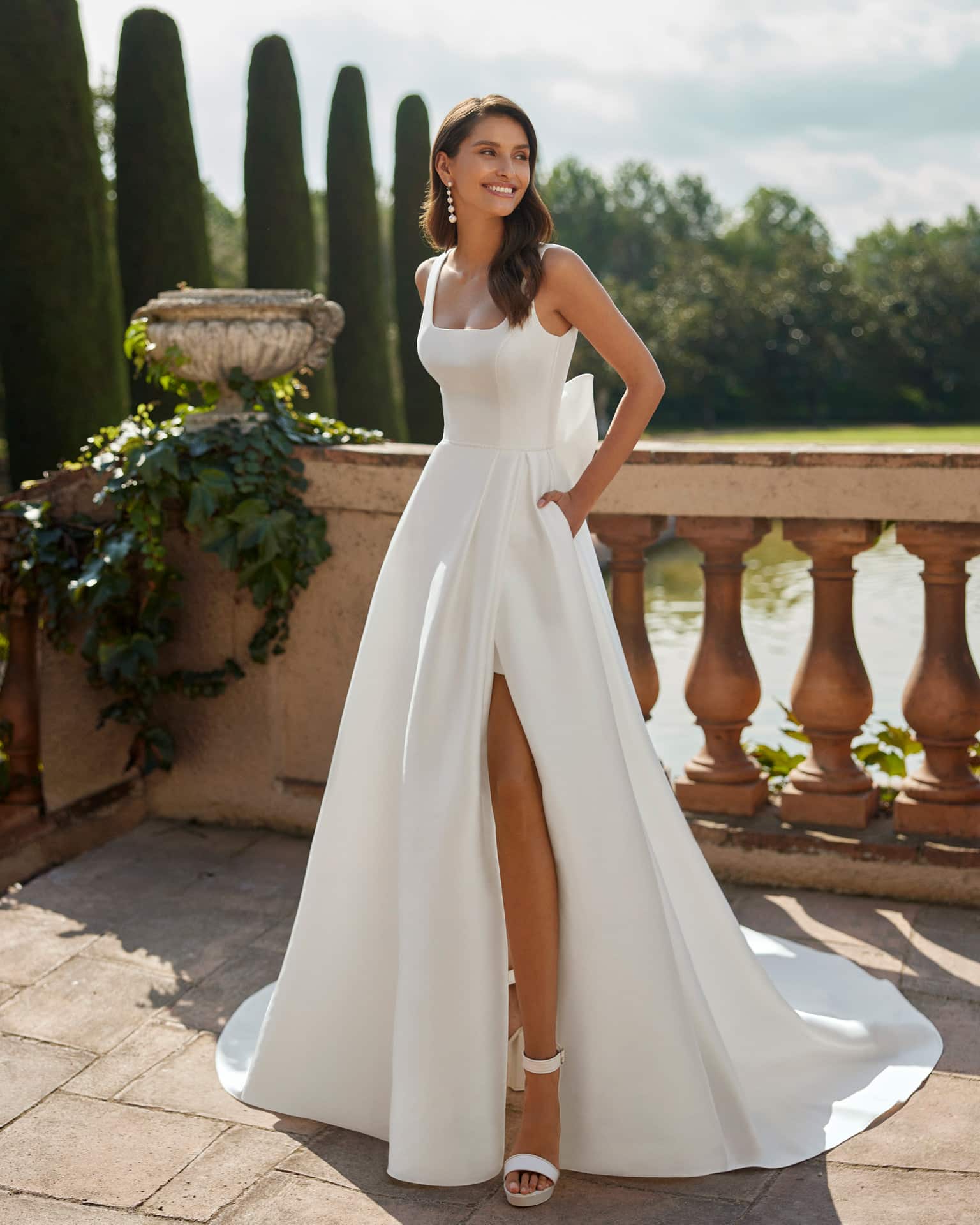 Romantisches Hochzeitskleid im Ballkleid-Stil aus Verona-Mikado. Mit quadratischem Ausschnitt, offenem Rücken, Trägern, Schleife und Rock mit Seitenschlitz.