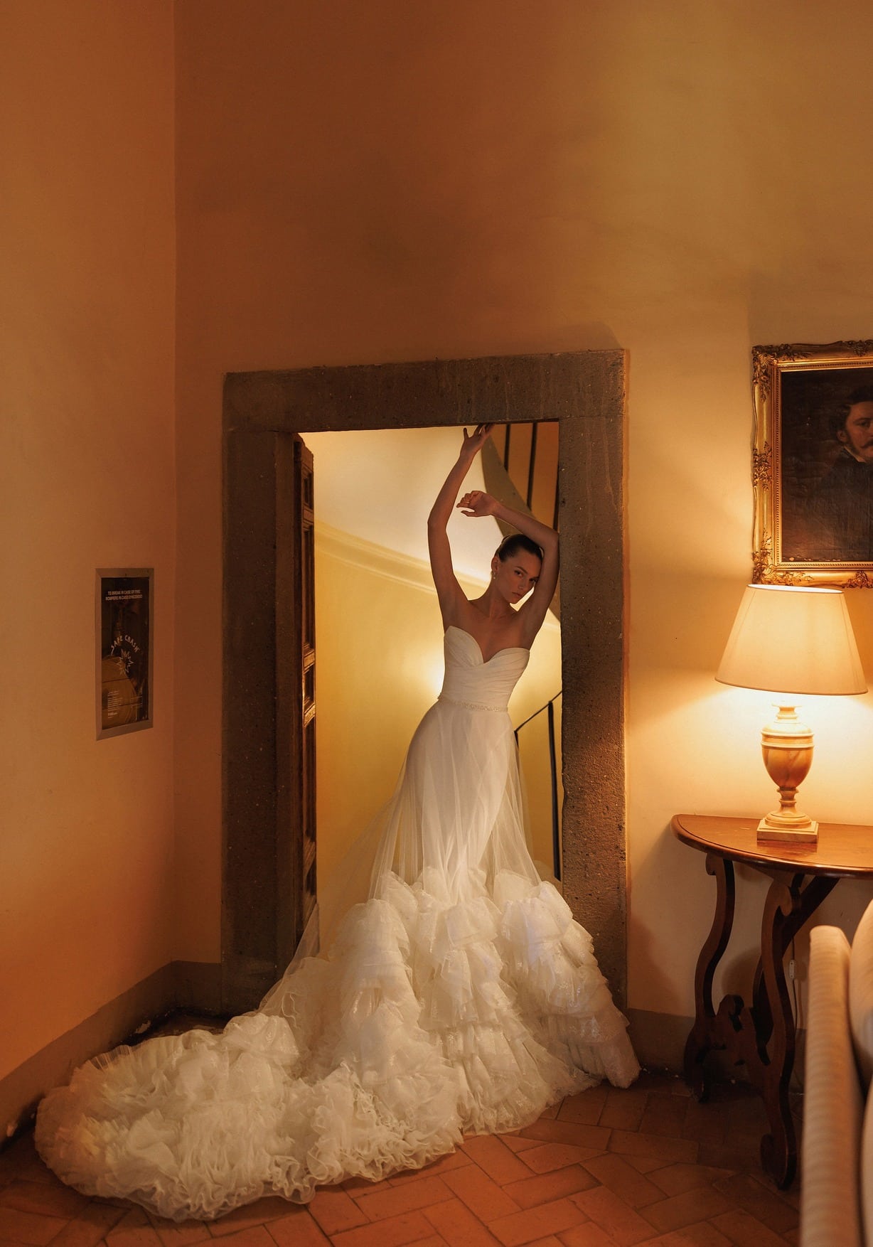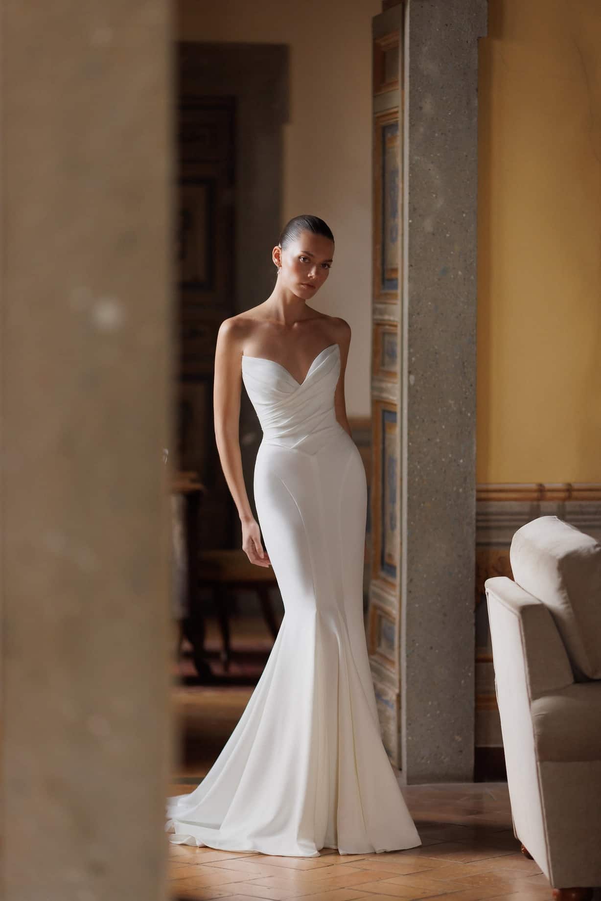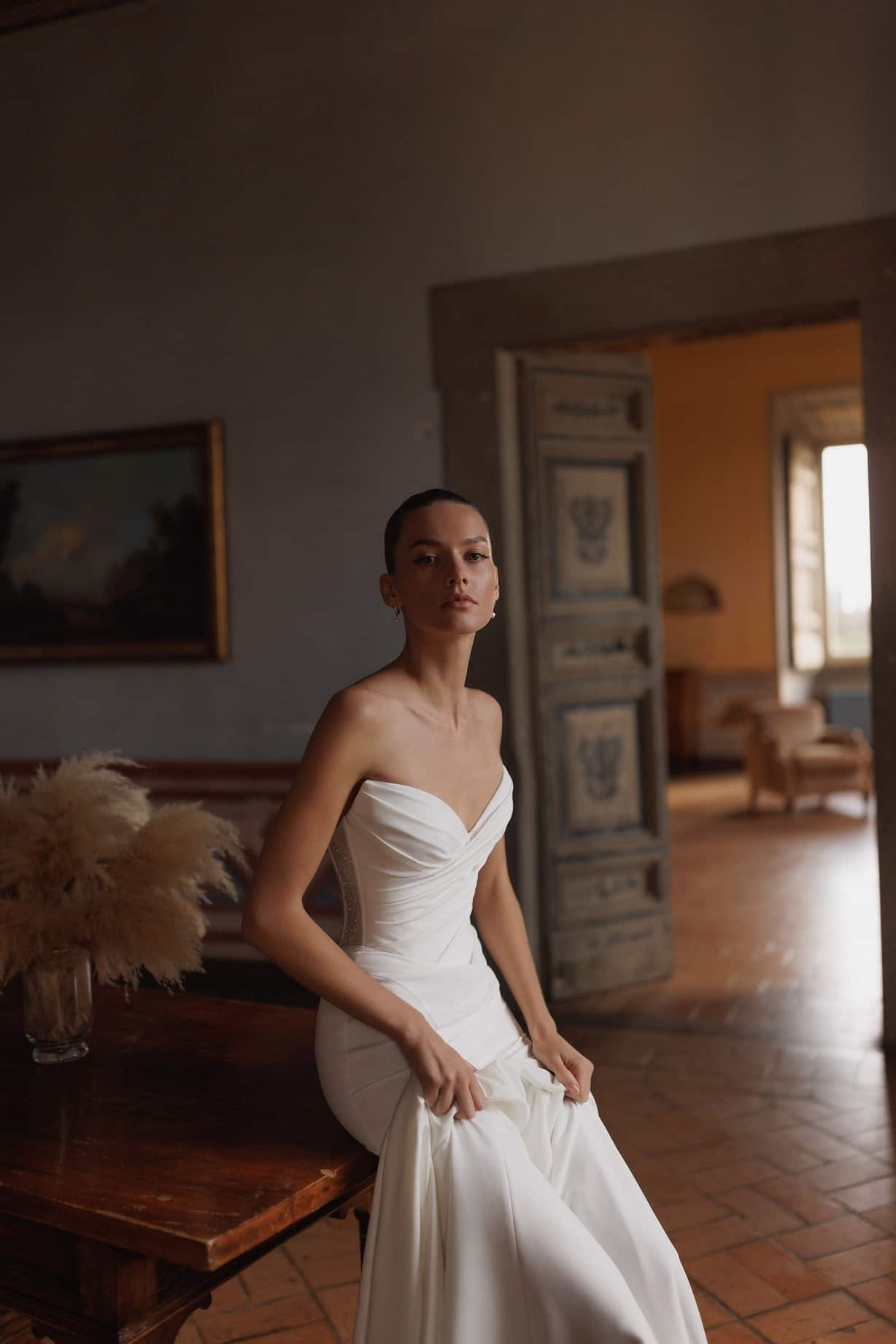 Fast schon klassisch und doch mit einem modernen Twist: herzförmiger Ausschnitt, gewickeltes Korsett mit einem Meerjungenfrauen-Rock.