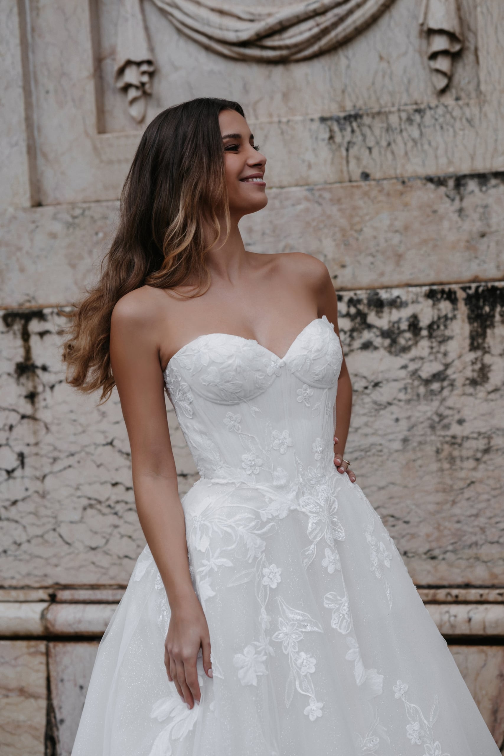 Elegante Spitzenapplikationen verleihen dem glitzernden Tüll-Overlay des Babetta-Ballkleids mit trägerlosem, herzförmigem Mieder und Baskettentaille Dimension.