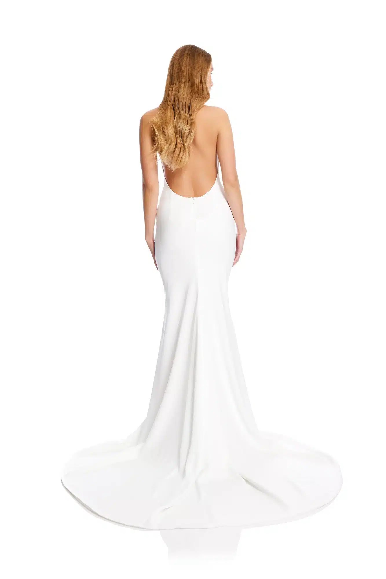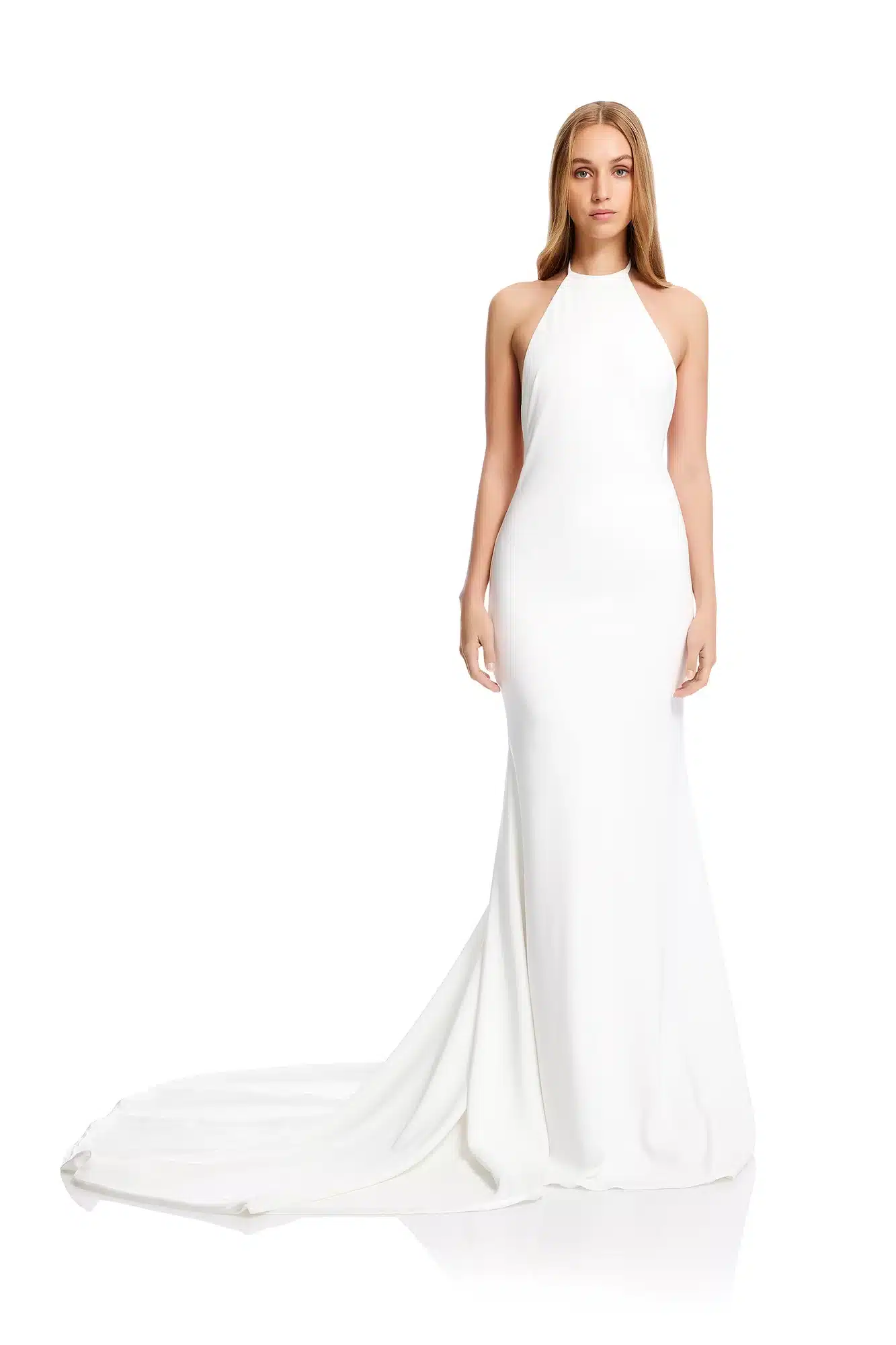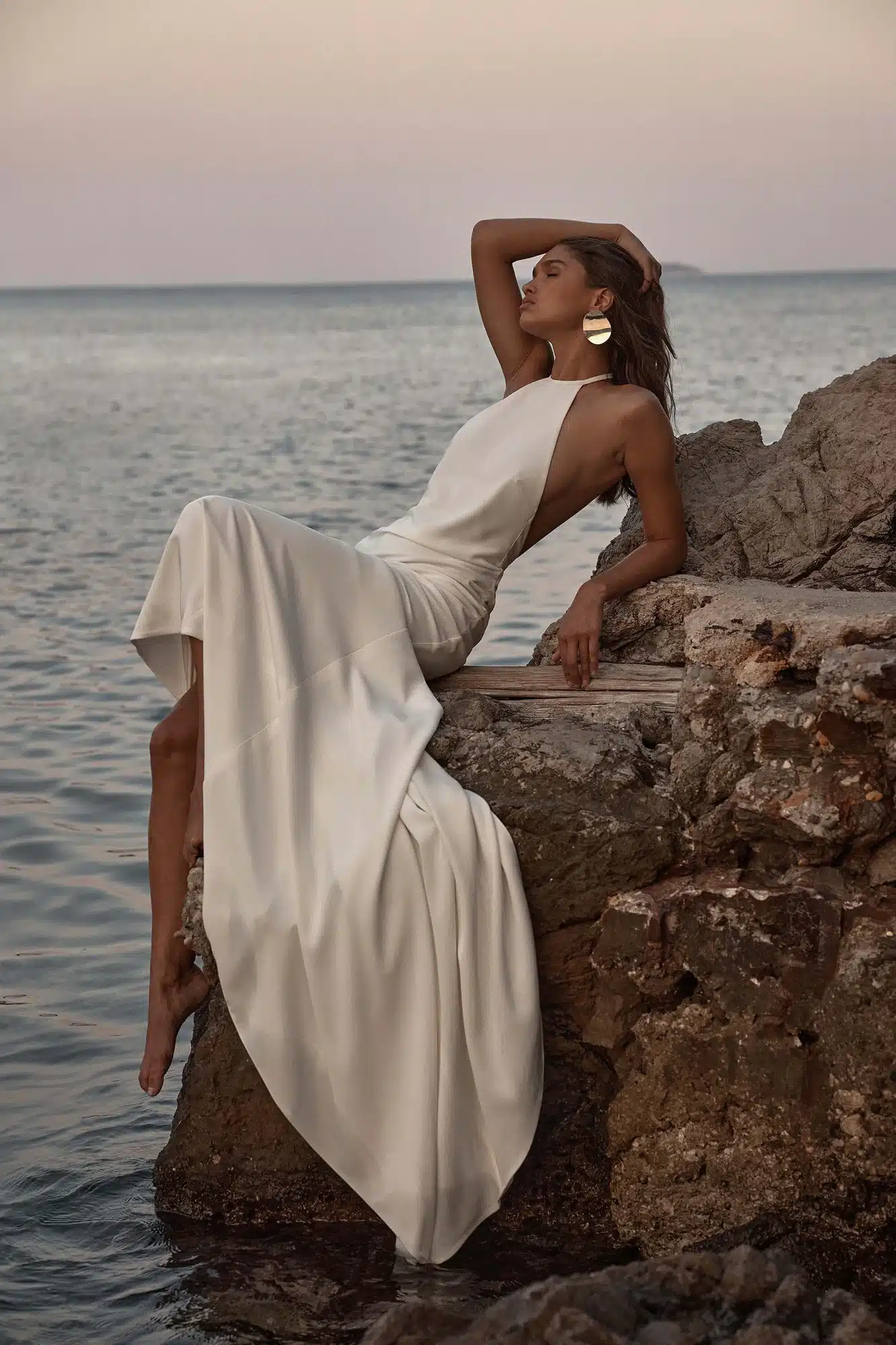 Elidi ist Minimalismus vom Feinsten, mit einem Neckholder und einem offenen Rücken, der in einen ausgestellten Rock übergeht. Aus luxuriösem Triacetat geschnitten, ist Elidi eine Studie in schlichter Coolness.