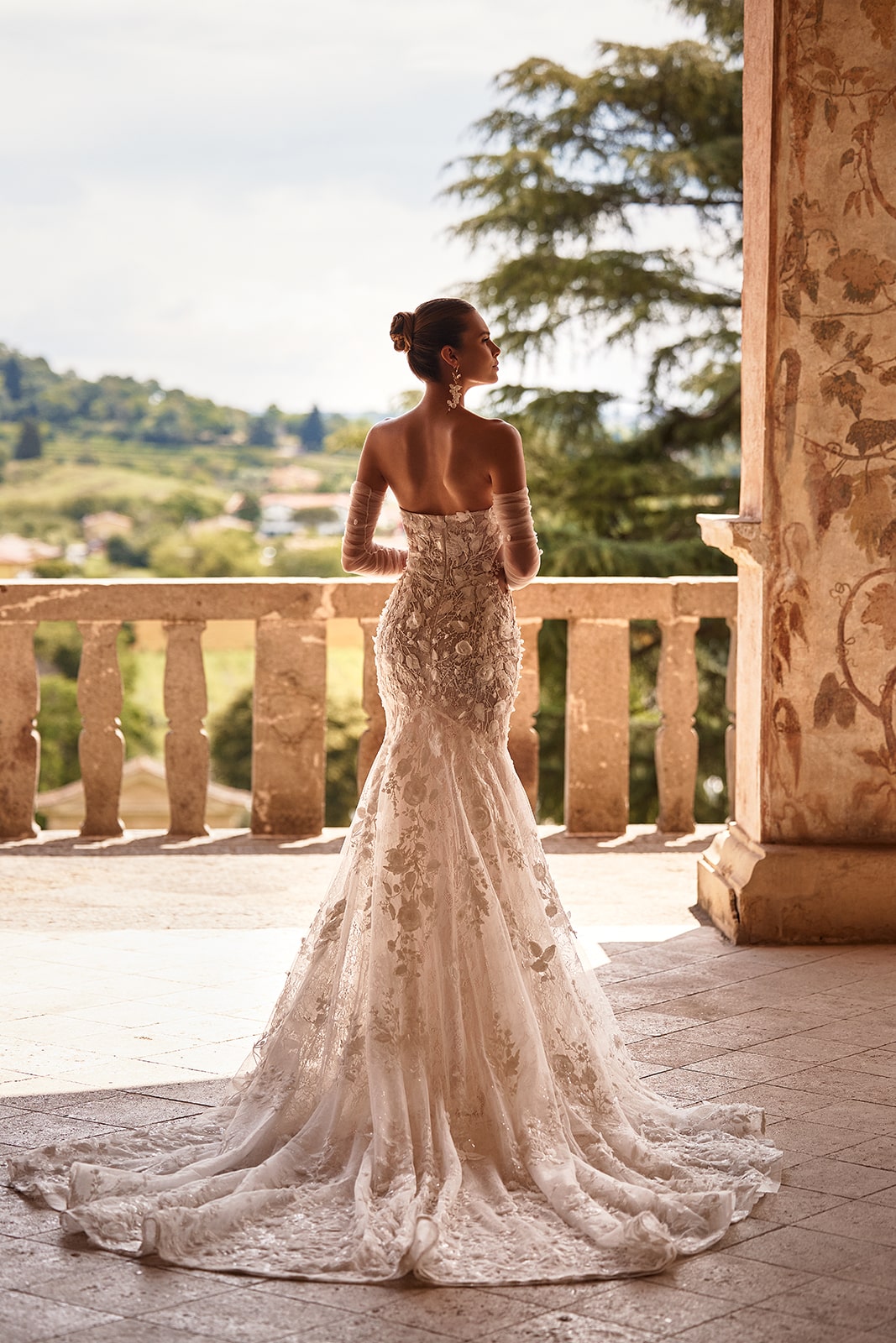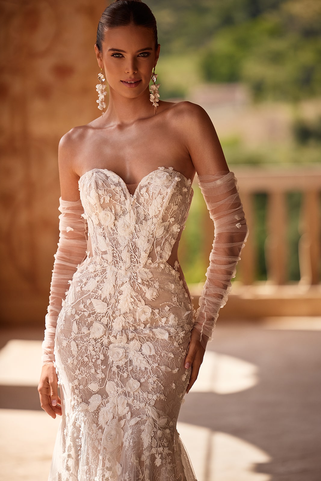 Der Wow-Effekt ist in dieses glamouröse Kleid eingenäht. Das Brautkleid Ellyse umschmeichelt die Figur mit seiner klassischen Meerjungfrauen-Silhouette. Ein Kleid, das die Anmut und das Selbstbewusstsein seiner Trägerin unterstreicht und alle Blicke auf sich zieht. Filigrane Blumen-Spitze schmückt den Stoff vom Herzausschnitt bis über die lange Schleppe, während gewagte seitliche Ausschnitte einen Hauch Haut preisgeben. Abnehmbare Tüllärmel bieten vielseitige Styling-Optionen, die den dramatischen Charakter unterstreichen.