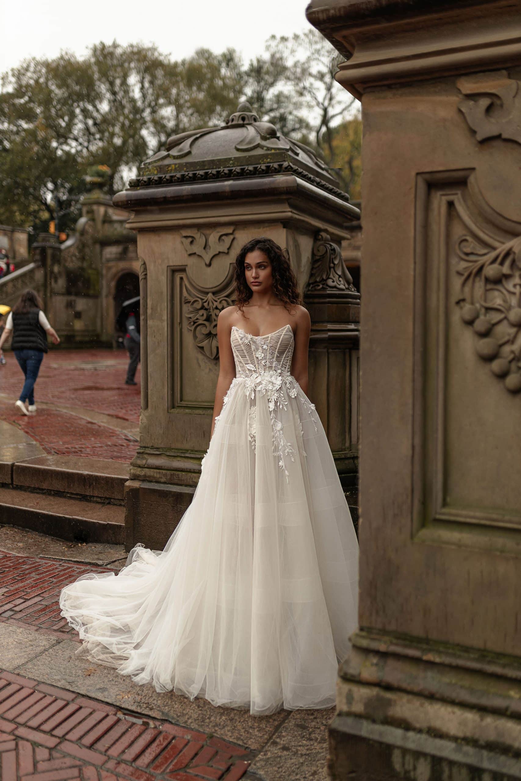 Der extravagante U-Ausschnitt setzt dein Dekolleté perfekt in Szene, während die 3D-Spitze eine zauberhafte, dreidimensionale Textur schafft. Das moderne Korsett mit Stäbchen formt eine schmeichelhafte Silhouette und bietet gleichzeitig optimalen Halt. Der ausgestellte Rock verleiht dem Kleid eine märchenhafte Note und sorgt für einen unvergesslichen Auftritt.