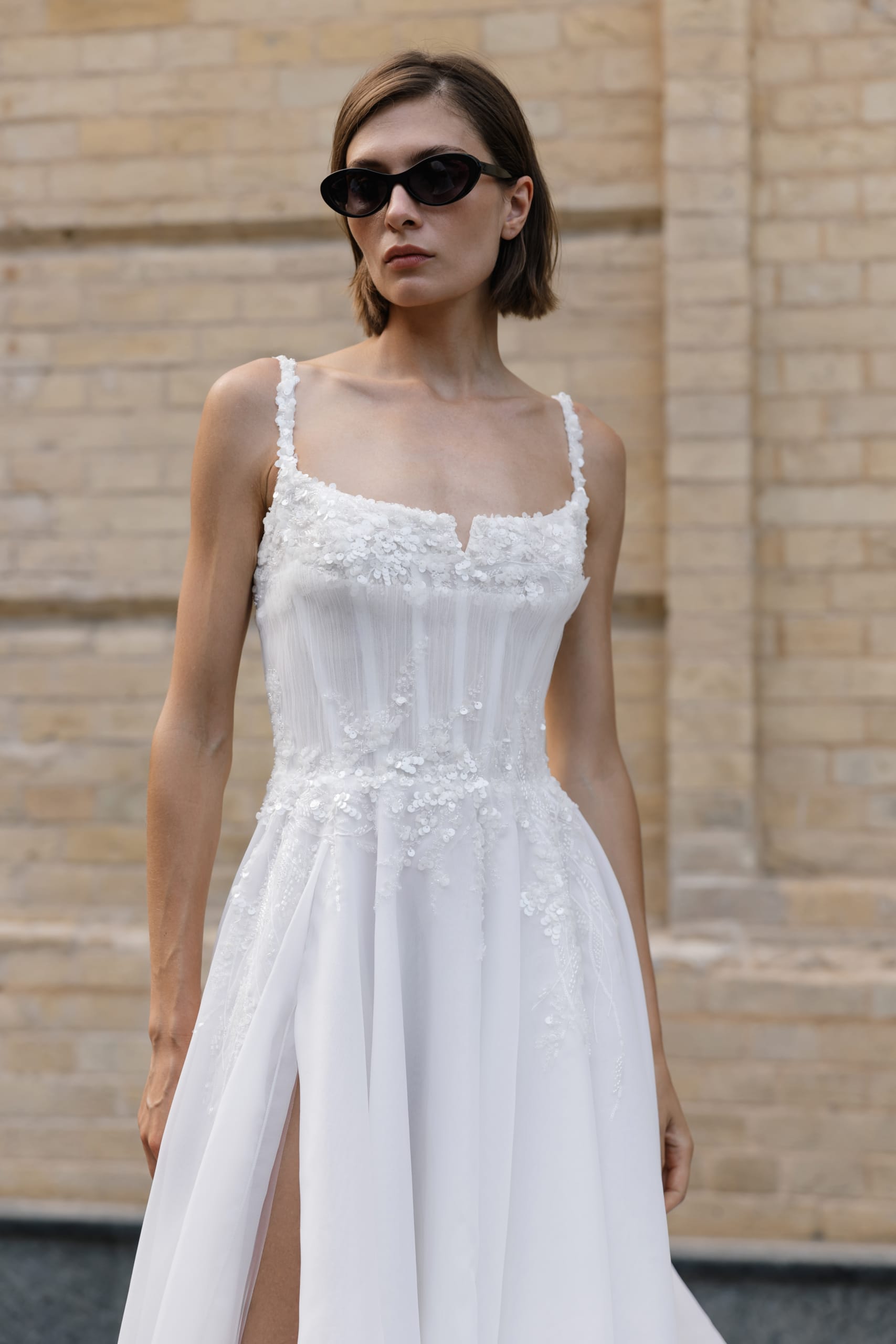 Ein Korsettkleid aus leichtem, mattem Organza. Das Mieder des Korsetts ist dicht mit Spitze aus schönen nicht durchsichtigen Pailletten bedeckt. Gaufrierter Organza an der Taille verleiht dem Kleid Leichtigkeit, der Beinschlitz ist extravagant.