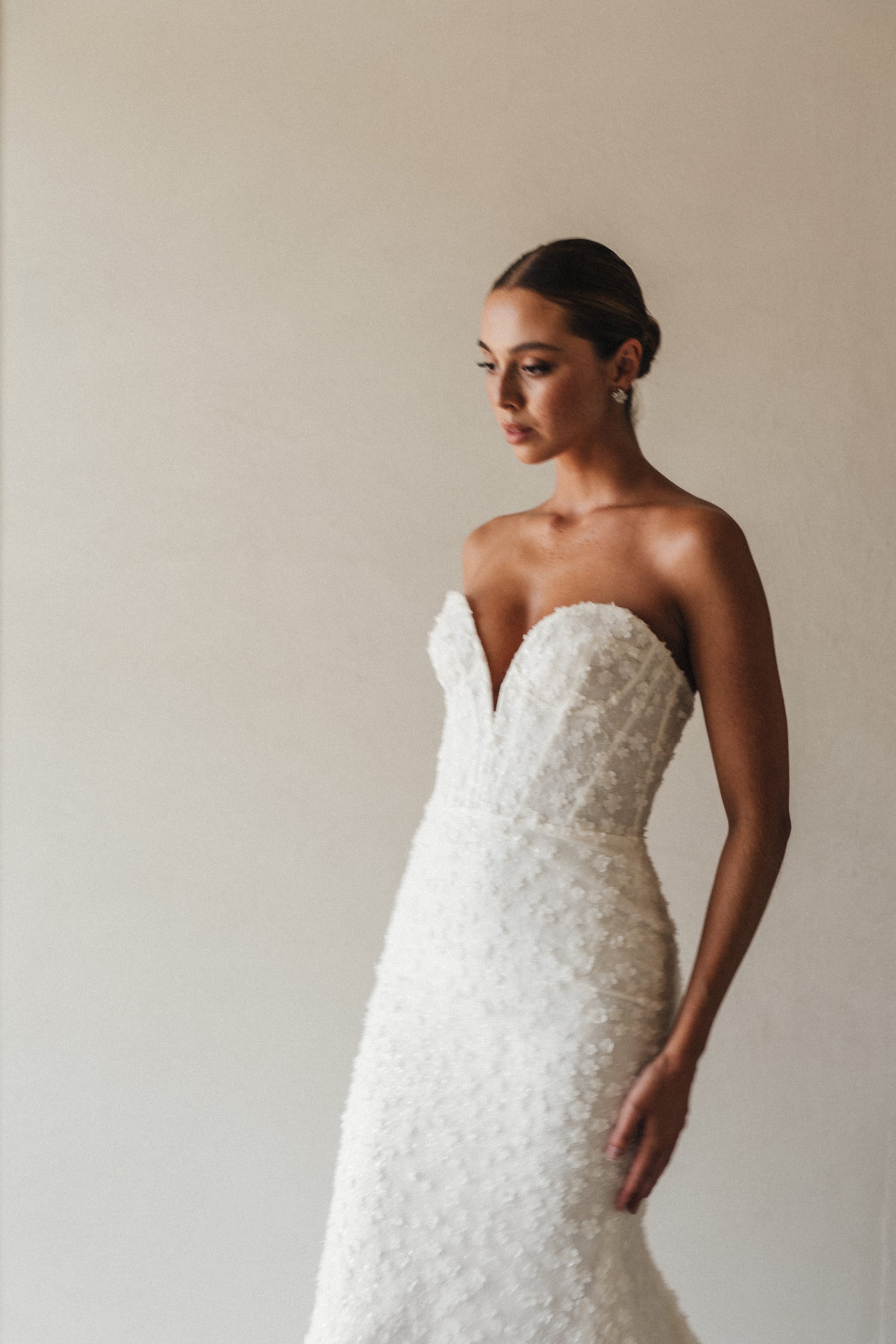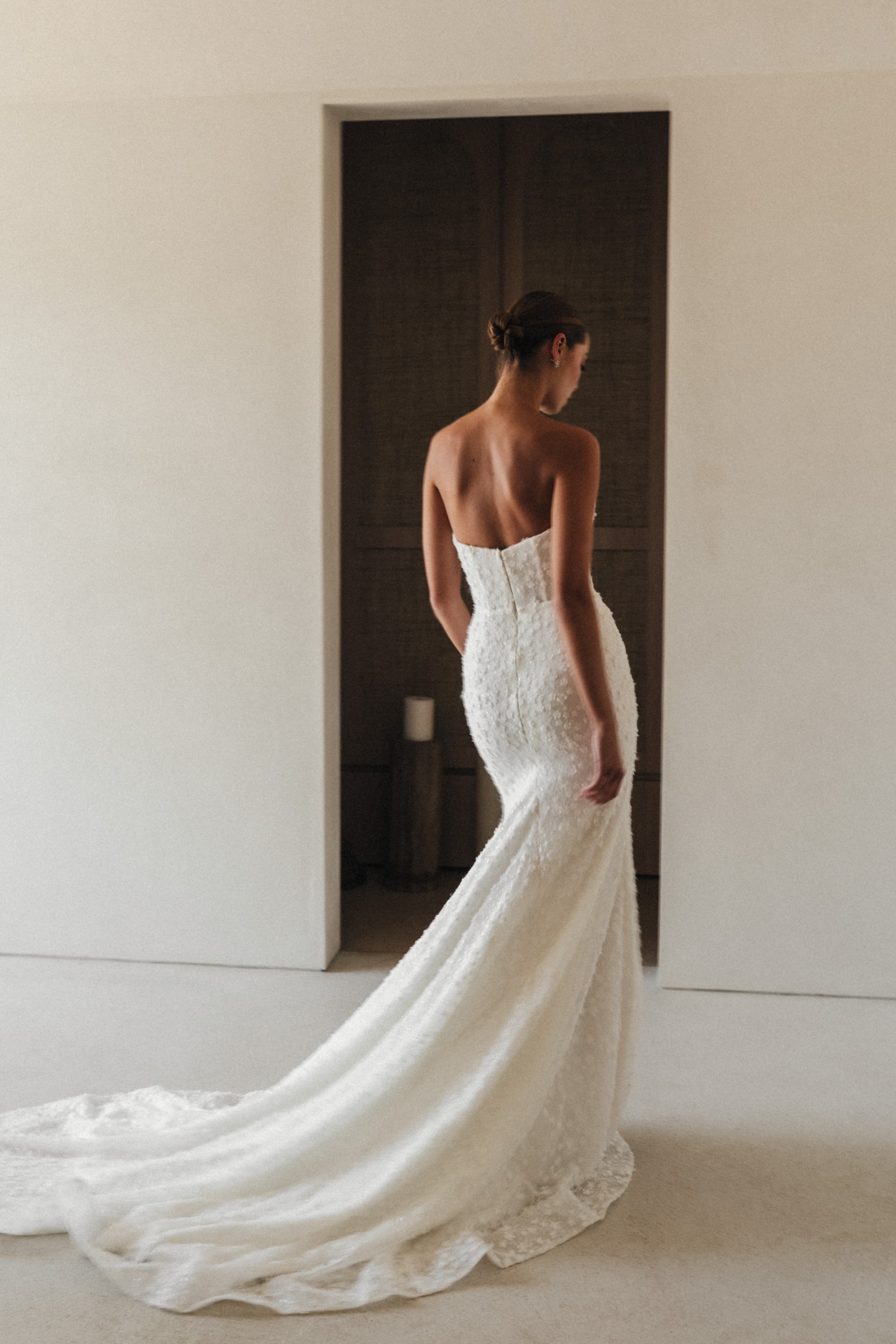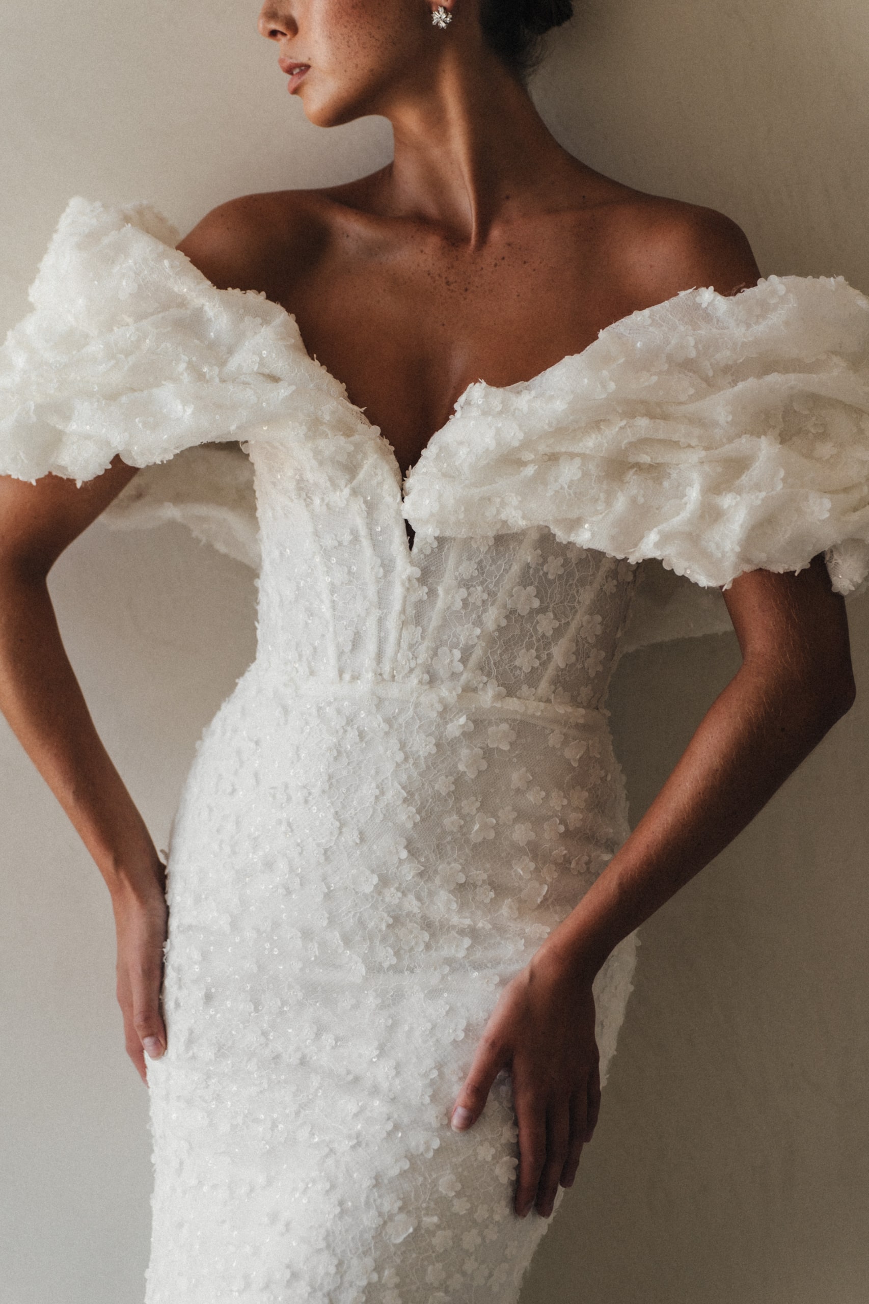 Das Gentiana-Kleid ist mit funkelnden Tautropfen und zarter Blumenspitze übersät, doch das auffällige Bustier und das abnehmbare voluminöse Bandeau stehen im Mittelpunkt des Interesses. Wie eine Göttin erhebst du dich aus dem Meer und erfüllst deine tiefsten Sehnsüchte in einem Kleid, das seinesgleichen sucht.