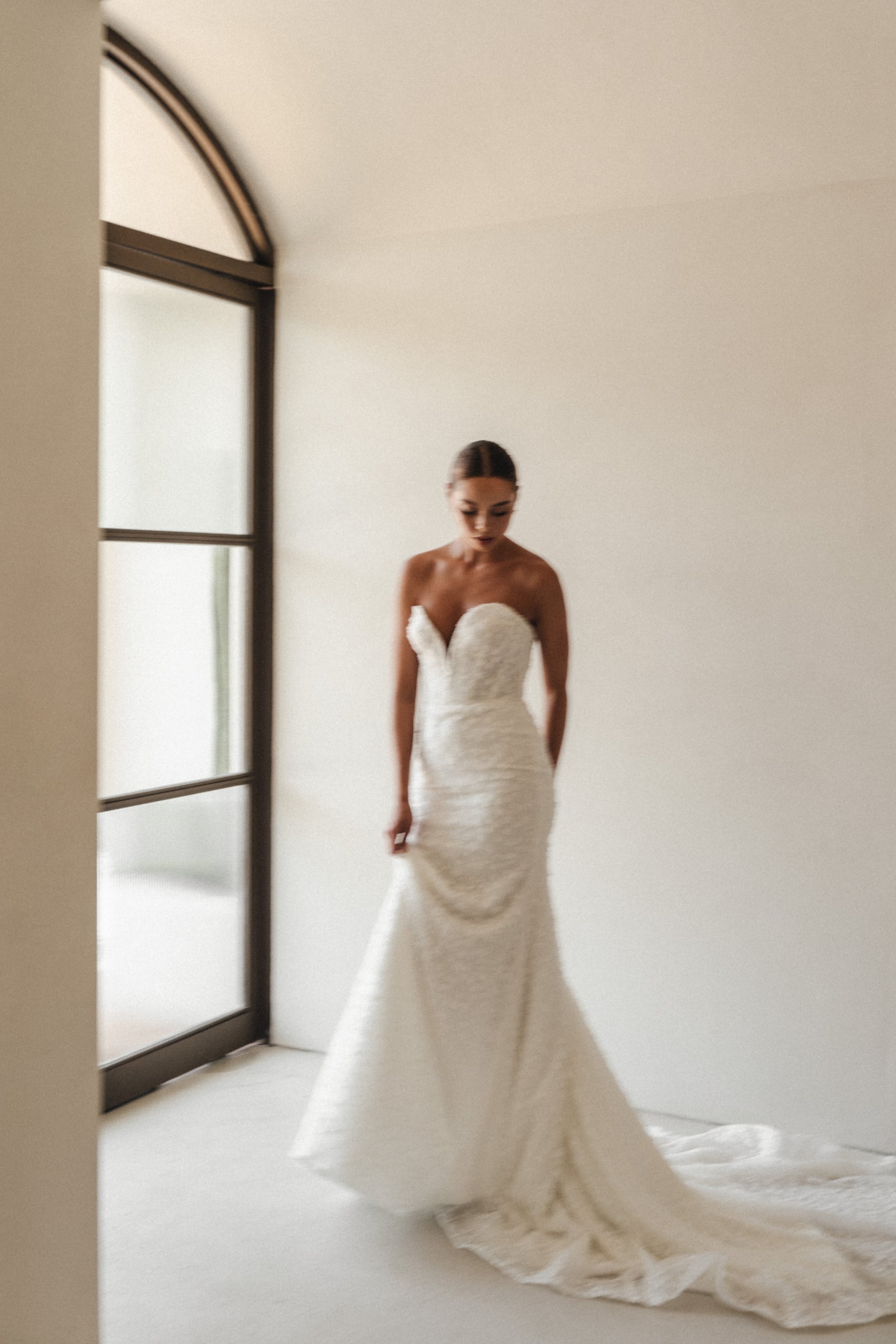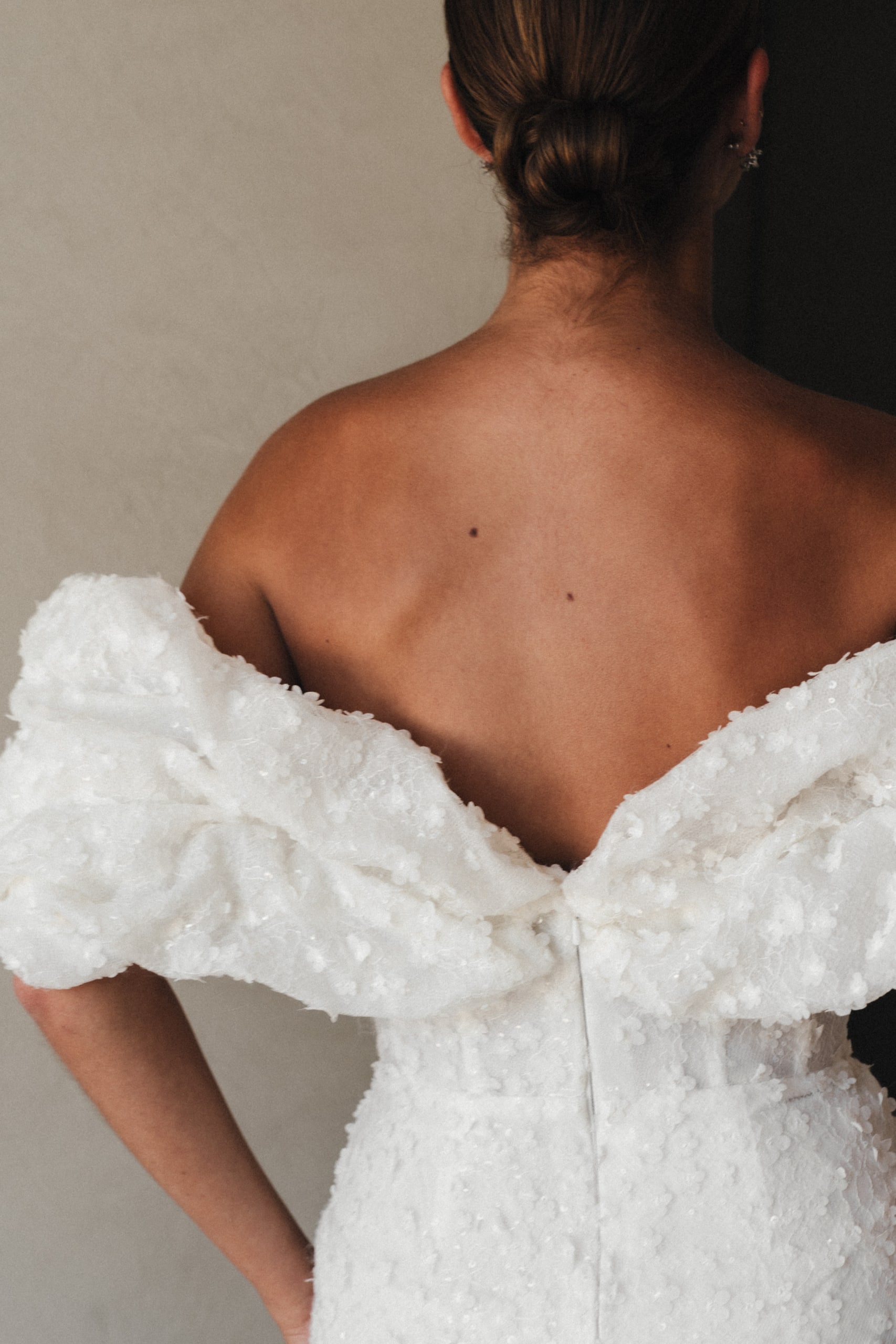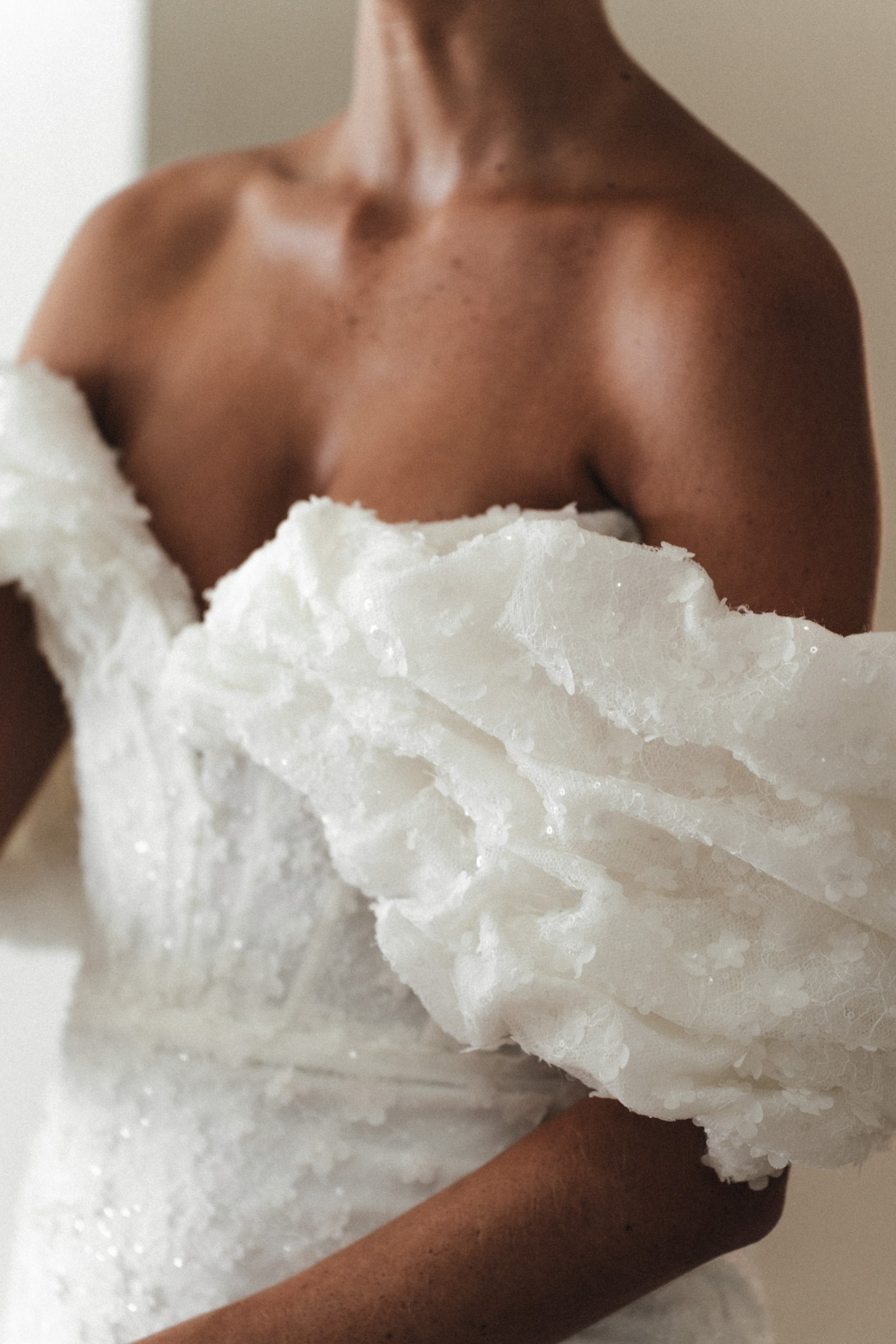 Das Gentiana-Kleid ist mit funkelnden Tautropfen und zarter Blumenspitze übersät, doch das auffällige Bustier und das abnehmbare voluminöse Bandeau stehen im Mittelpunkt des Interesses. Wie eine Göttin erhebst du dich aus dem Meer und erfüllst deine tiefsten Sehnsüchte in einem Kleid, das seinesgleichen sucht.