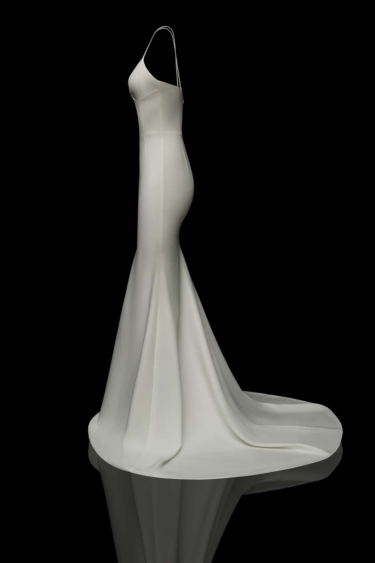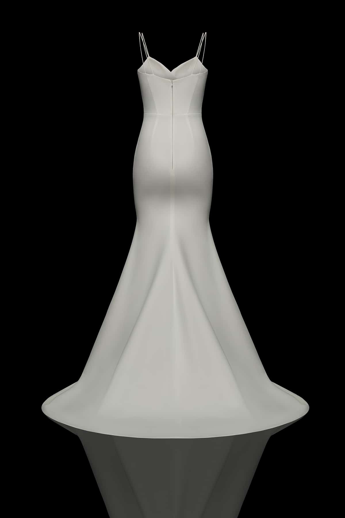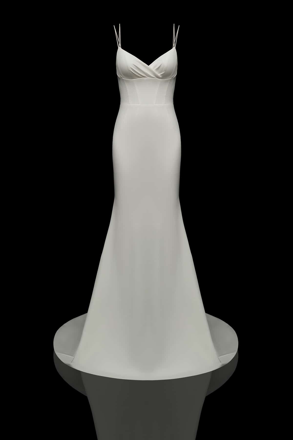 Meerjungfrauen-Kleid Gwen besticht durch seine Schlichtheit und Eleganz als schmales Trägerkleid mit Schleppe. Der Stil demonstriert vorteilhaft die Zartheit der weiblichen Silhouette, indem er Dekolleté und Schultern freilegt.