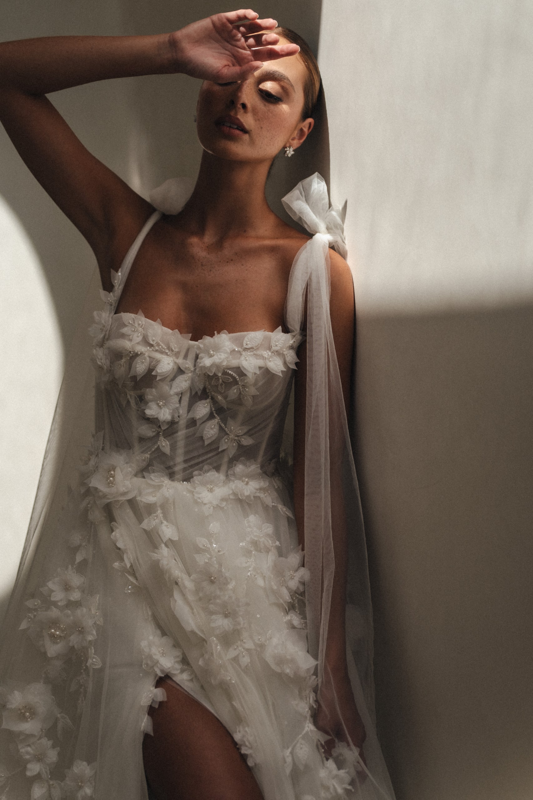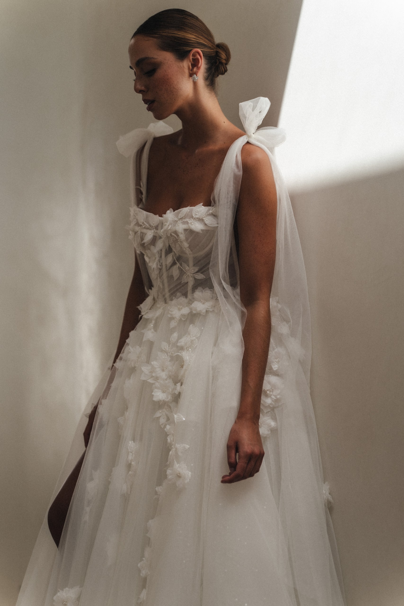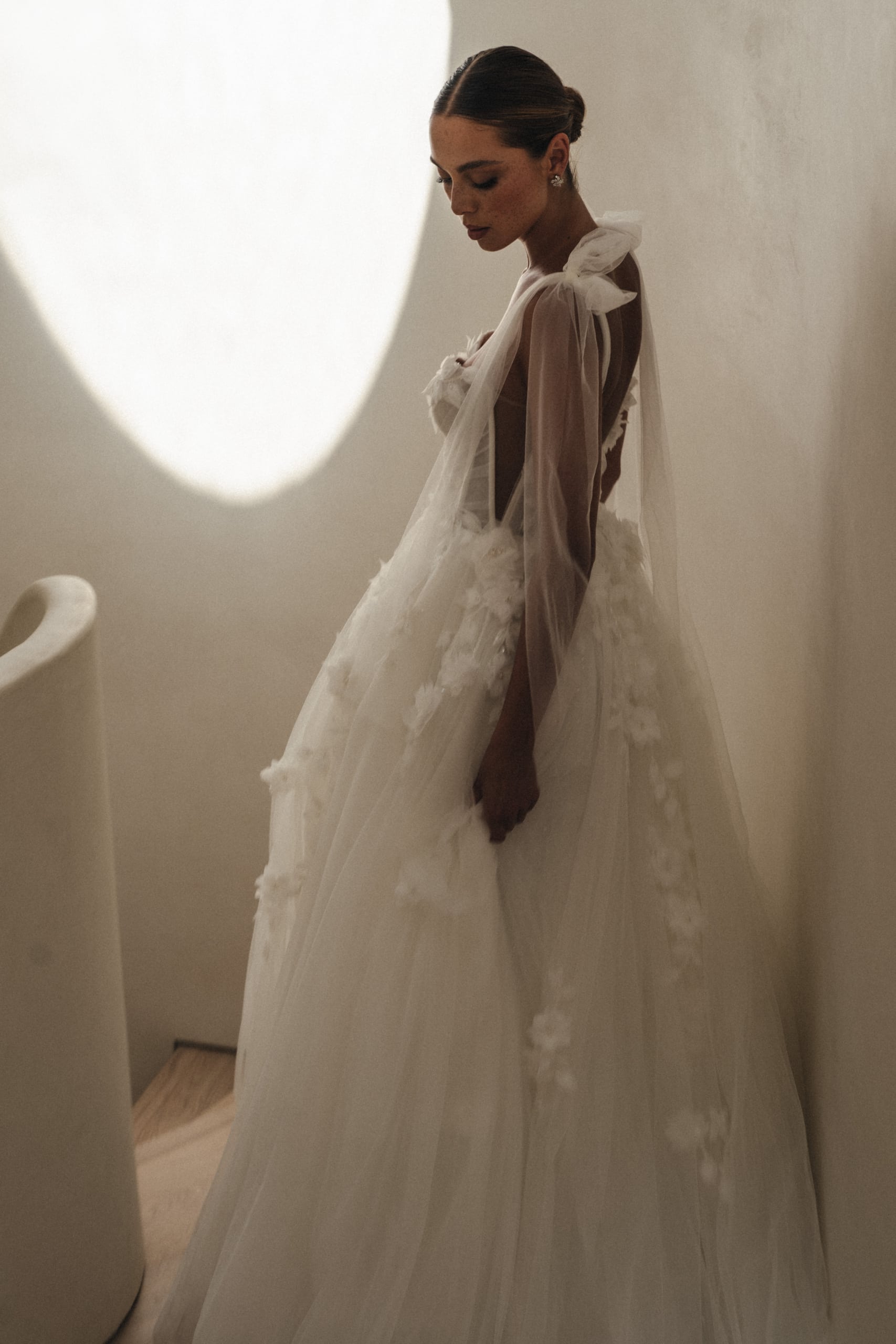 Das Habenaria-Kleid ist so ätherisch wie die Blume, von der es inspiriert wurde. Zarte Tüllwedel blühen an Ihren Schultern und fließen nach unten, um auf einen üppigen Tüllrock zu treffen.