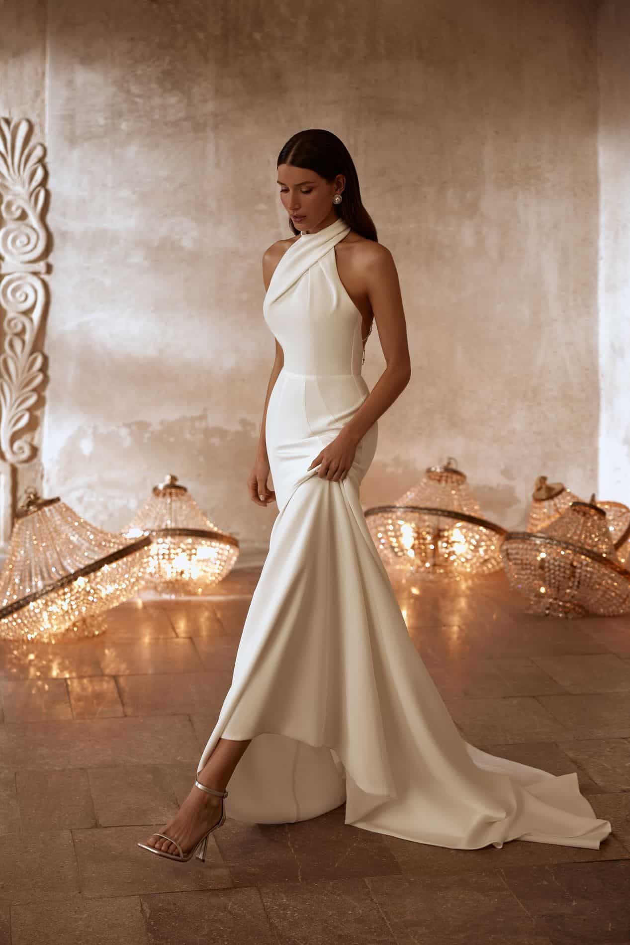 Dieses Kleid besticht durch seine schlichte Eleganz und sein modernes Design. Der hohe Kragen und der asymmetrische Schnitt sorgen für Raffinesse und Stil und betonen den schwanenartigen Hals der Braut. Die Meerjungfrauen-Silhouette schmiegt sich an die Figur und betont ihre natürlichen Kurven, während der glatte Stoff einen Effekt von makelloser Geschmeidigkeit erzeugt. Das minimalistische Dekor und der Verzicht auf überflüssige Details vermitteln ein Gefühl von moderner Raffinesse und Eleganz. Die lange Schleppe vervollständigt den Look und verleiht jedem Schritt Anmut und Erhabenheit. Dieses Kleid ist die perfekte Wahl für eine Braut, die stilvoll und elegant aussehen und ihre natürliche Schönheit betonen möchte.