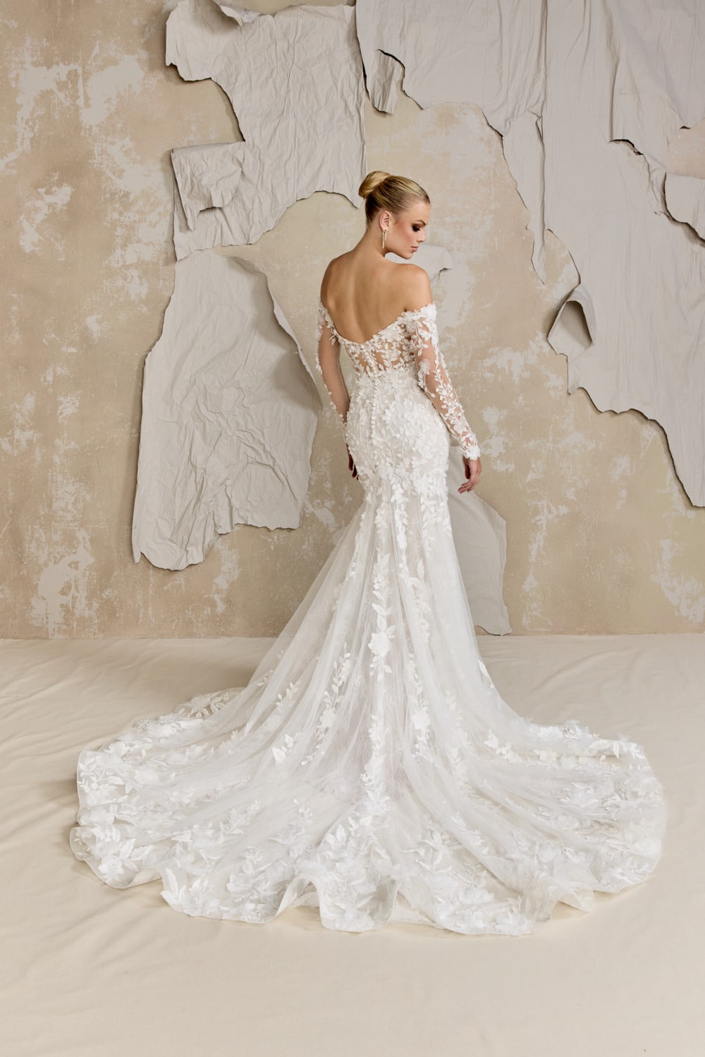 Allover-Spitzen-Trompetenkleid mit schulterfreiem Ausschnitt.