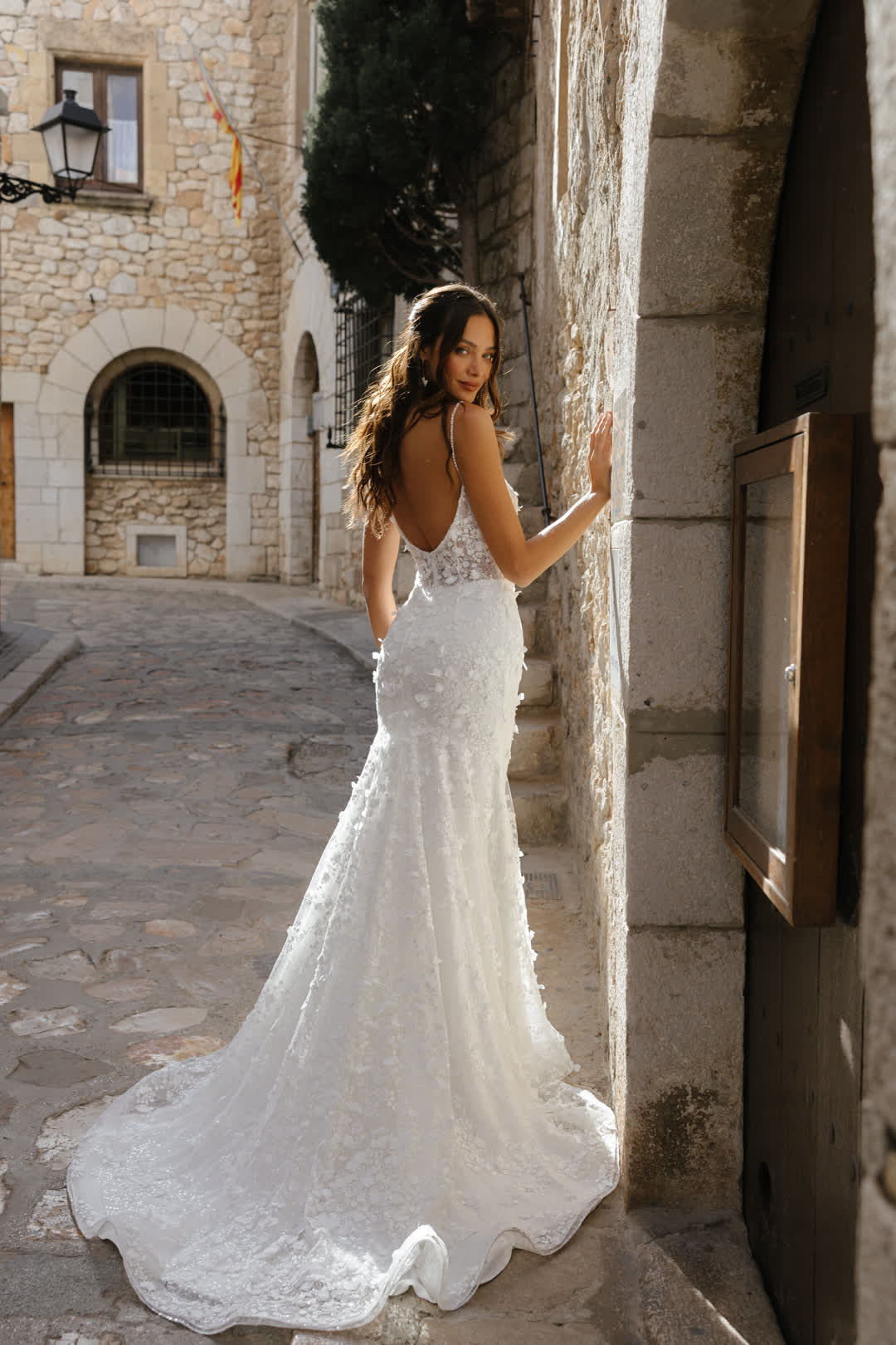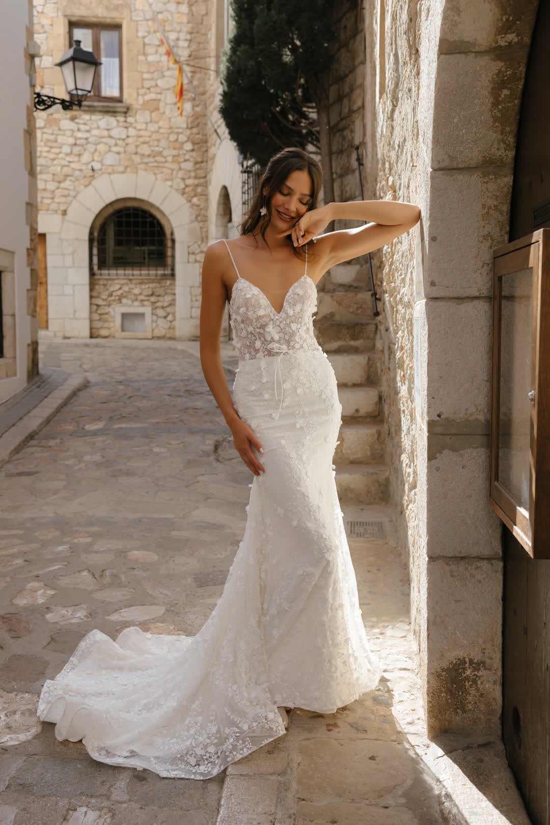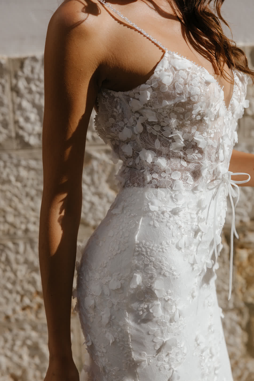 Dieses atemberaubende Brautkleid vereint Romantik und Sinnlichkeit auf perfekte Weise. Der figurbetonte Schnitt schmeichelt den weiblichen Kurven und verleiht jeder Braut einen eleganten, verführerischen Look. Der tiefe V-Ausschnitt sorgt für eine subtile, sexy Note, während die florale 3D-Spitze, die sich über das gesamte Kleid erstreckt, für eine romantische Atmosphäre sorgt. Die aufwendig gestalteten Blütenmuster in zarter Spitze wirken wie kleine Kunstwerke und verleihen dem Kleid eine traumhafte Leichtigkeit. Dieses Kleid ist die perfekte Wahl für Bräute, die sich an ihrem großen Tag selbstbewusst und feminin fühlen möchten.