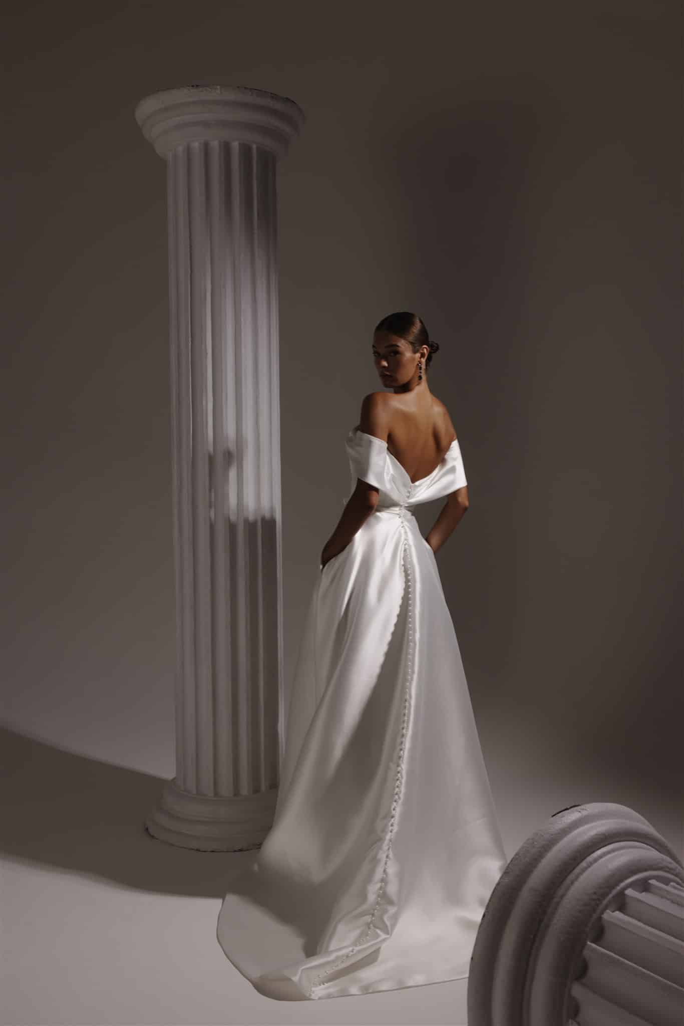 Knackiges Weiß und klare Linien sind die perfekte Grundlage für unser Johanna-Kleid. Ein freiliegendes Korsett mit Stäbchen verleiht diesem eleganten Kleid einen modernen Twist, der durch ein hübsches Taillenband mit Schleifendetail (Achtung: Bei uns ohne Schleife!), das die Taille definiert, gemildert wird. Der Rock aus dem Mikado-Stoff fließt mühelos, Taschen und ein tiefer Schlitz machen Johanna modern und cool. Die schulterfreien Manschettenärmel betonen die Schultern und enden in einem subtilen V-Rücken. Eine Reihe von Kunstperlen an der Schleppe vervollständigt den Look. Johanna ist die perfekte Kombination aus modern und traditionell.