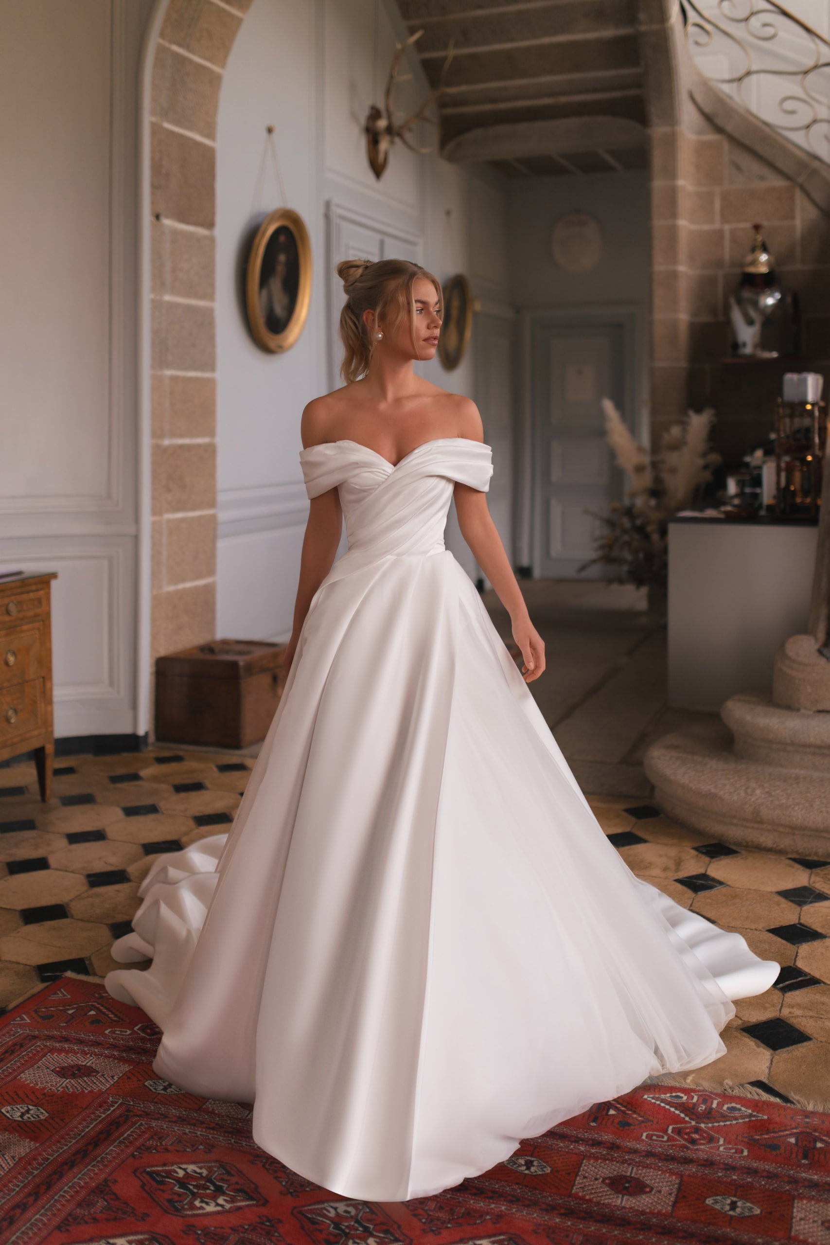 Das üppige Kelly-Satin-Kleid hat einen interessanten Schnitt und ungewöhnliche Designlösungen. Die abgesenkten Träger, die in Falten gelegt sind, gehen bei der Korsage fließend in einen herzförmigen Ausschnitt über. Das Korsett selbst hat eine diagonale Drapierung, die allmählich in die Falten des Rocks übergeht. Der obere Rockteil aus dichtem, mattem Satin erzeugt die Illusion eines Schlitzes, durch den die Tüllschicht sichtbar wird. So erhält der klassische Look einen Designer-Touch.