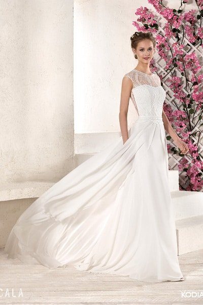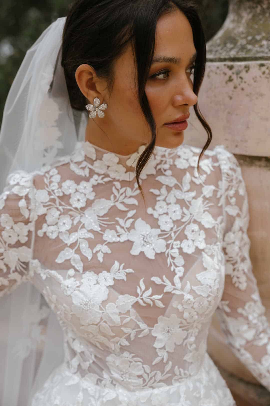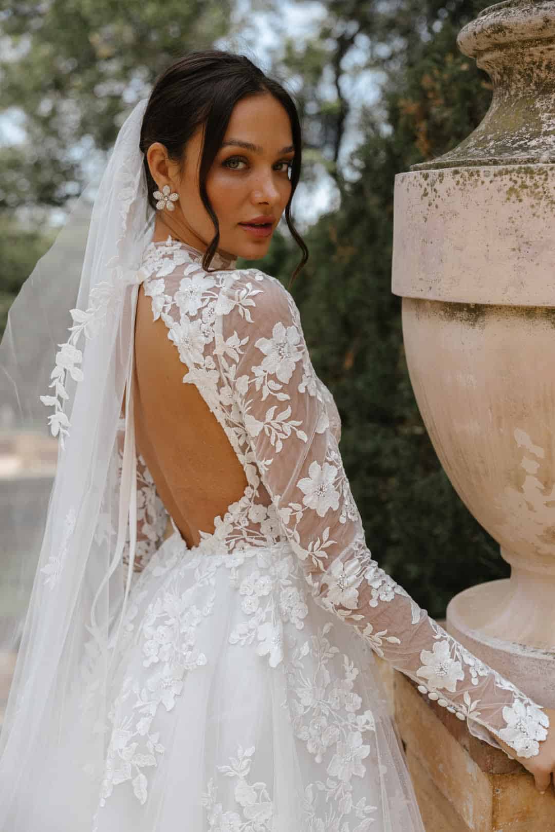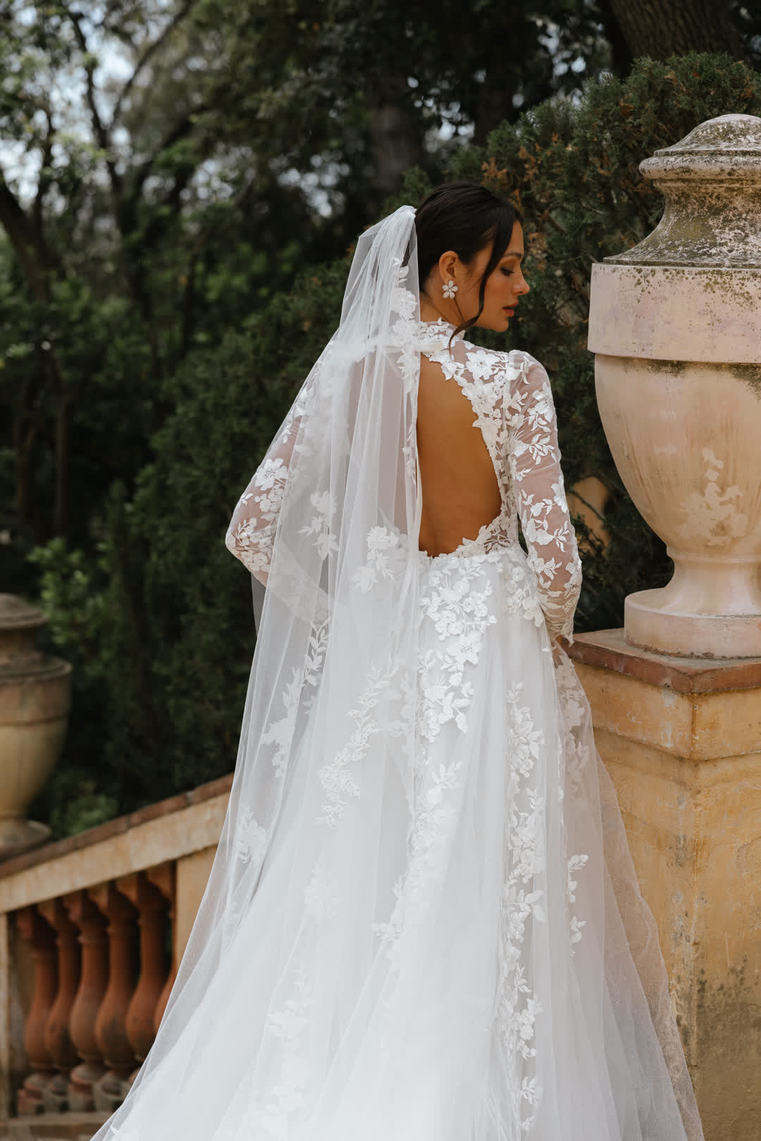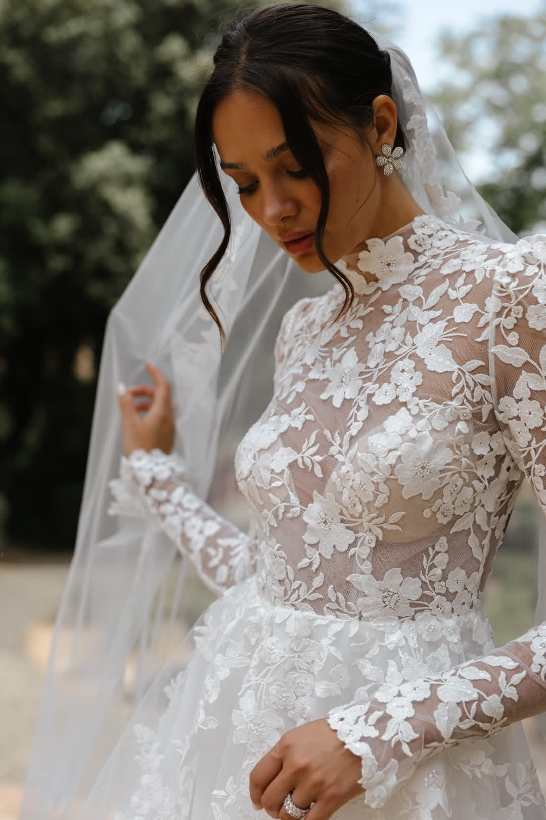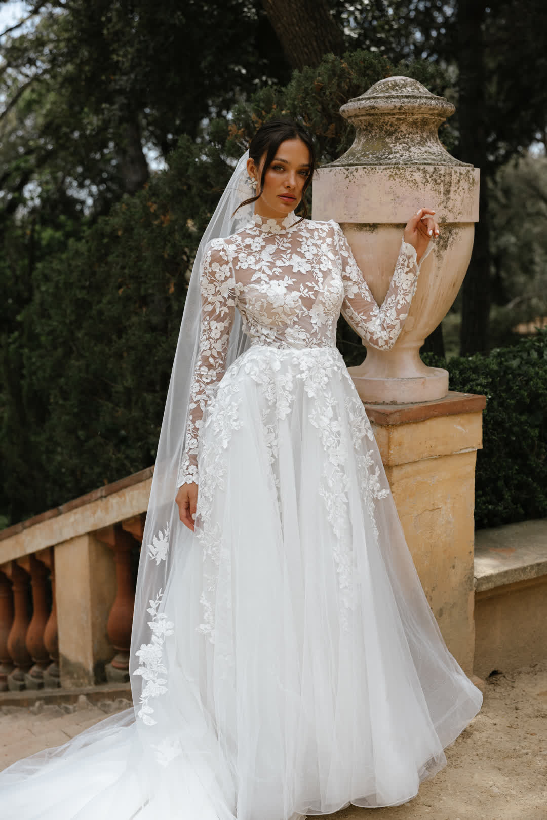Dieses Brautkleid kombiniert Romantik und Eleganz in Perfektion. Das Oberteil aus zarter, floraler Spitze mit langen Ärmeln und einem eleganten, hohen Kragen verleiht dir eine raffinierte Ausstrahlung. Ein Highlight ist der Schlüsselloch-Ausschnitt am Rücken, der für einen Hauch von verführerischer Leichtigkeit sorgt. Der weich fließende Tüllrock lässt dich wie eine Märchenprinzessin erscheinen, während die Spitze sanft von oben in den Rock übergeht und so eine harmonische Verbindung schafft.