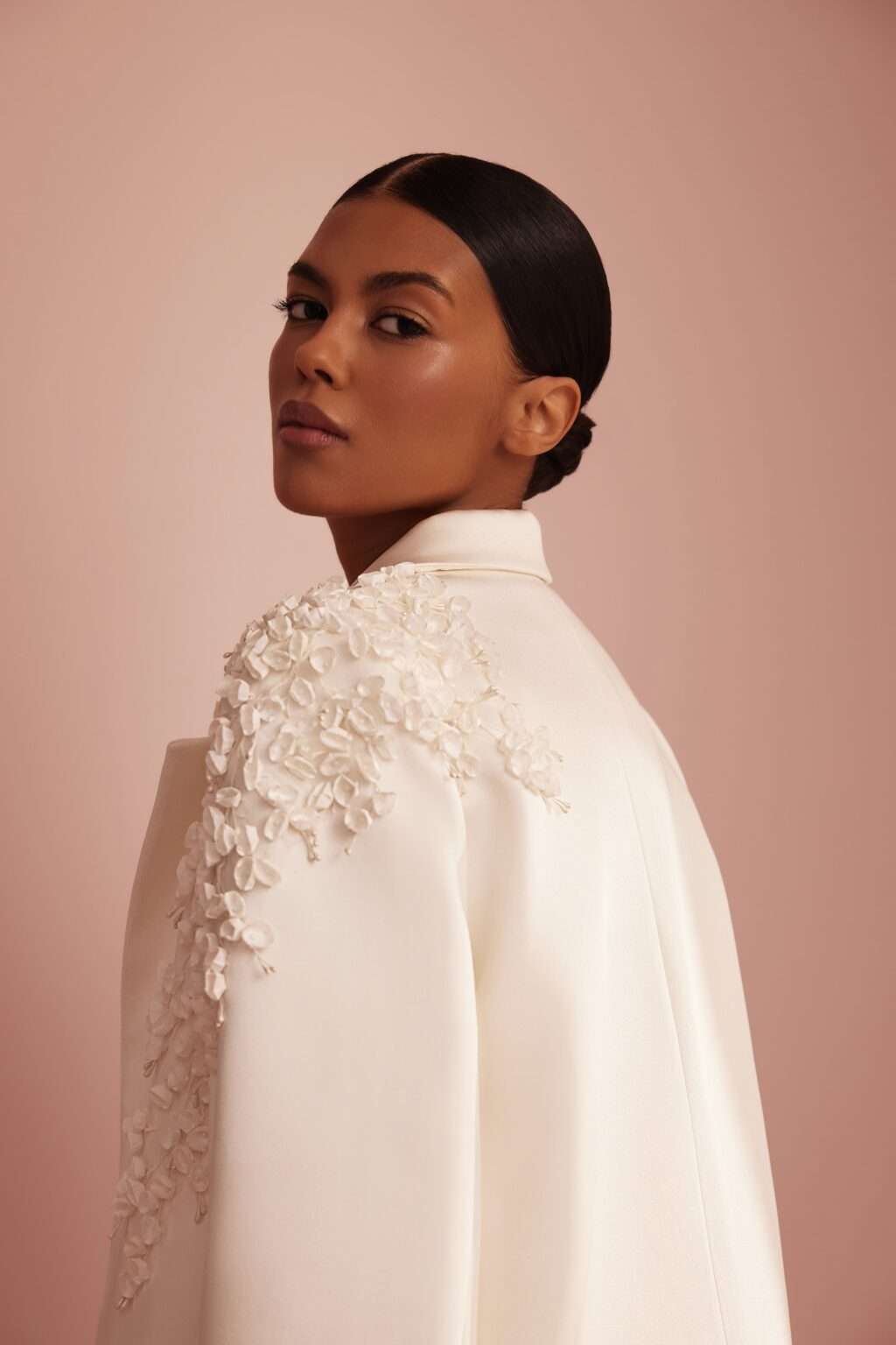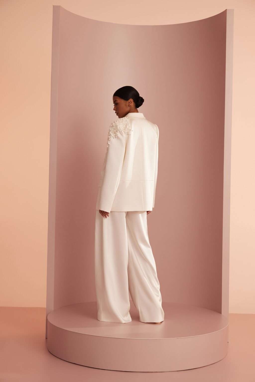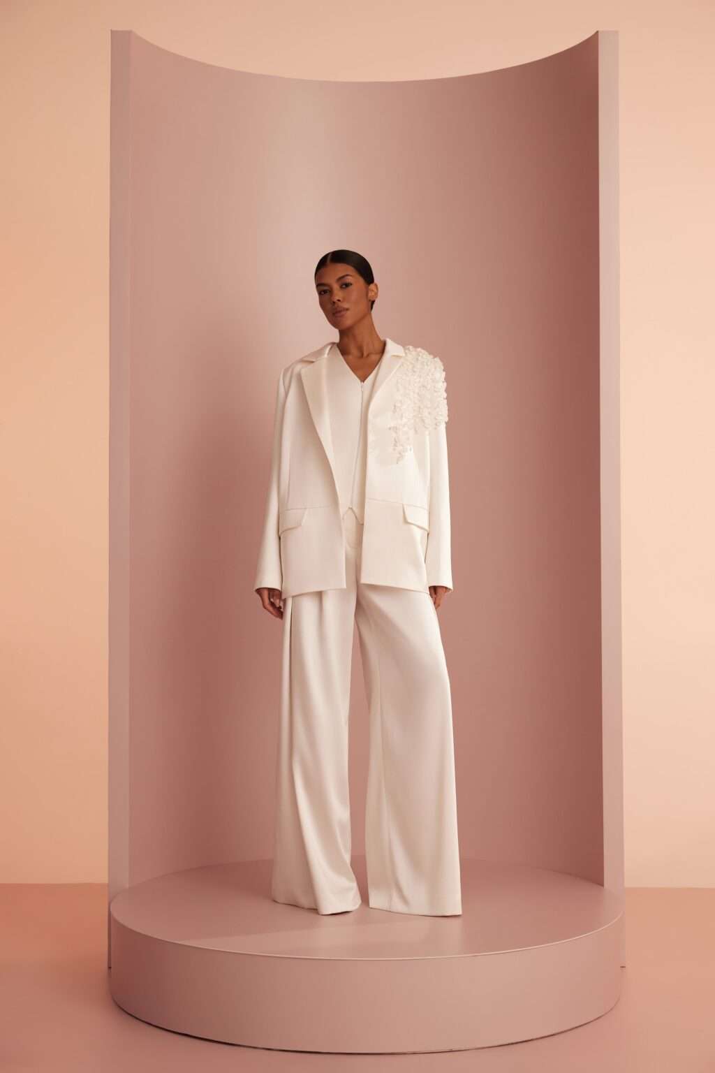 Verleihe deinem Hochzeitslook eine moderne Note mit dem weit geschnittenen Brautblazer. Gefertigt aus luxuriösem Glossy Satin, bietet dieser Blazer nicht nur höchsten Tragekomfort, sondern auch ein edles Finish. Ein besonderes Highlight sind die aufwendig gearbeiteten 3-D-Blumenapplikationen an einer Schulter, die dem Outfit einen einzigartigen und romantischen Touch verleihen. Auch im Set erhältlich mit der dazu passenden Hose und Top.