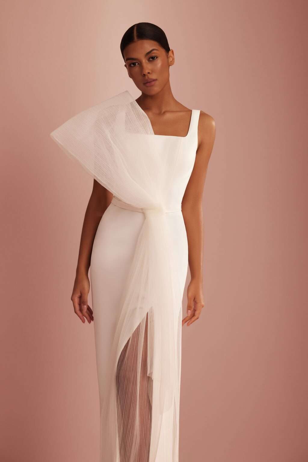 Dieses schlichte Brautkleid aus mattem Satin besticht durch seinen eleganten, eckigen Ausschnitt, der sowohl vorne als auch hinten stilvoll die Schultern betont. Der dezente Schlitz sorgt für eine subtile, aber raffinierte Note, die deine Bewegungsfreiheit perfekt unterstützt. Das Kleid ist bei uns ohne Schleifen-Dekor vorhandnen.