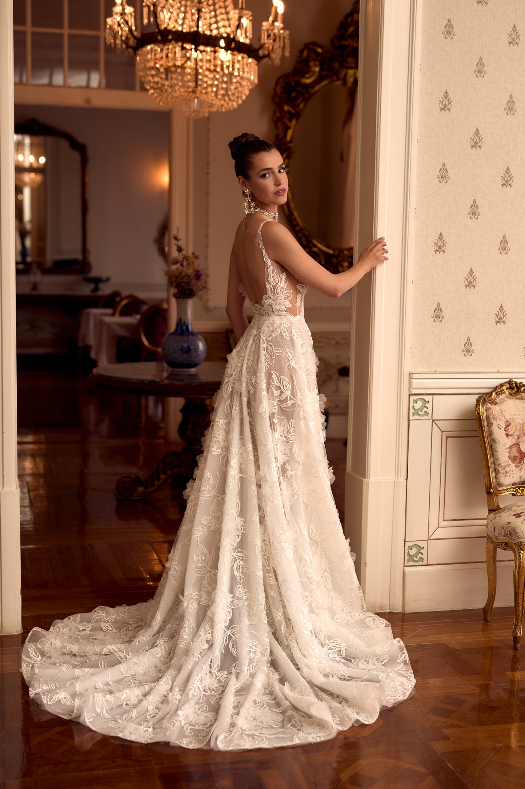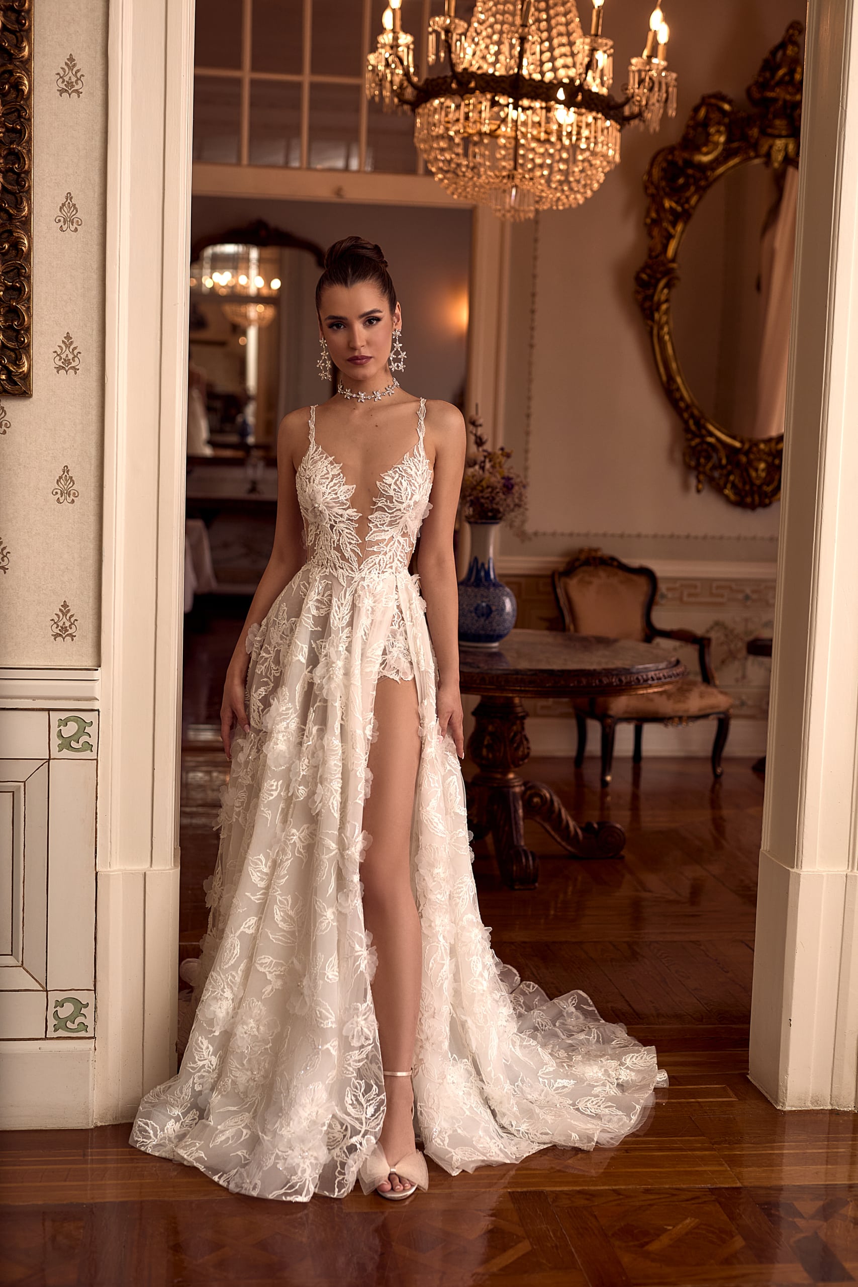 Dieses atemberaubende Brautkleid vereint pure Eleganz mit einem Hauch von Verführung. Die außergewöhnliche Spitze verleiht dem Kleid eine luxuriöse Note, während der tiefe V-Ausschnitt und der hohe Schlitz deine Weiblichkeit perfekt in Szene setzen. Der Rock wird durch 3D-Spitze zum Highlight, und der tiefe Rückenausschnitt in Kombination mit zarten, dünnen Trägern sorgt für einen unwiderstehlichen, sexy Look. Ein Kleid, das deine Einzigartigkeit an deinem besonderen Tag unterstreicht.