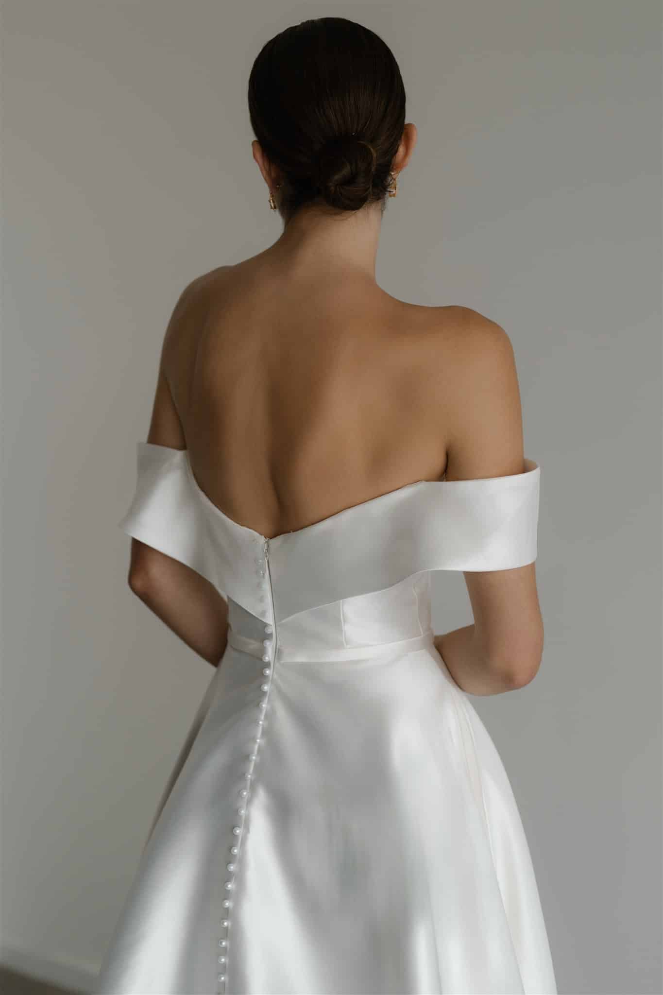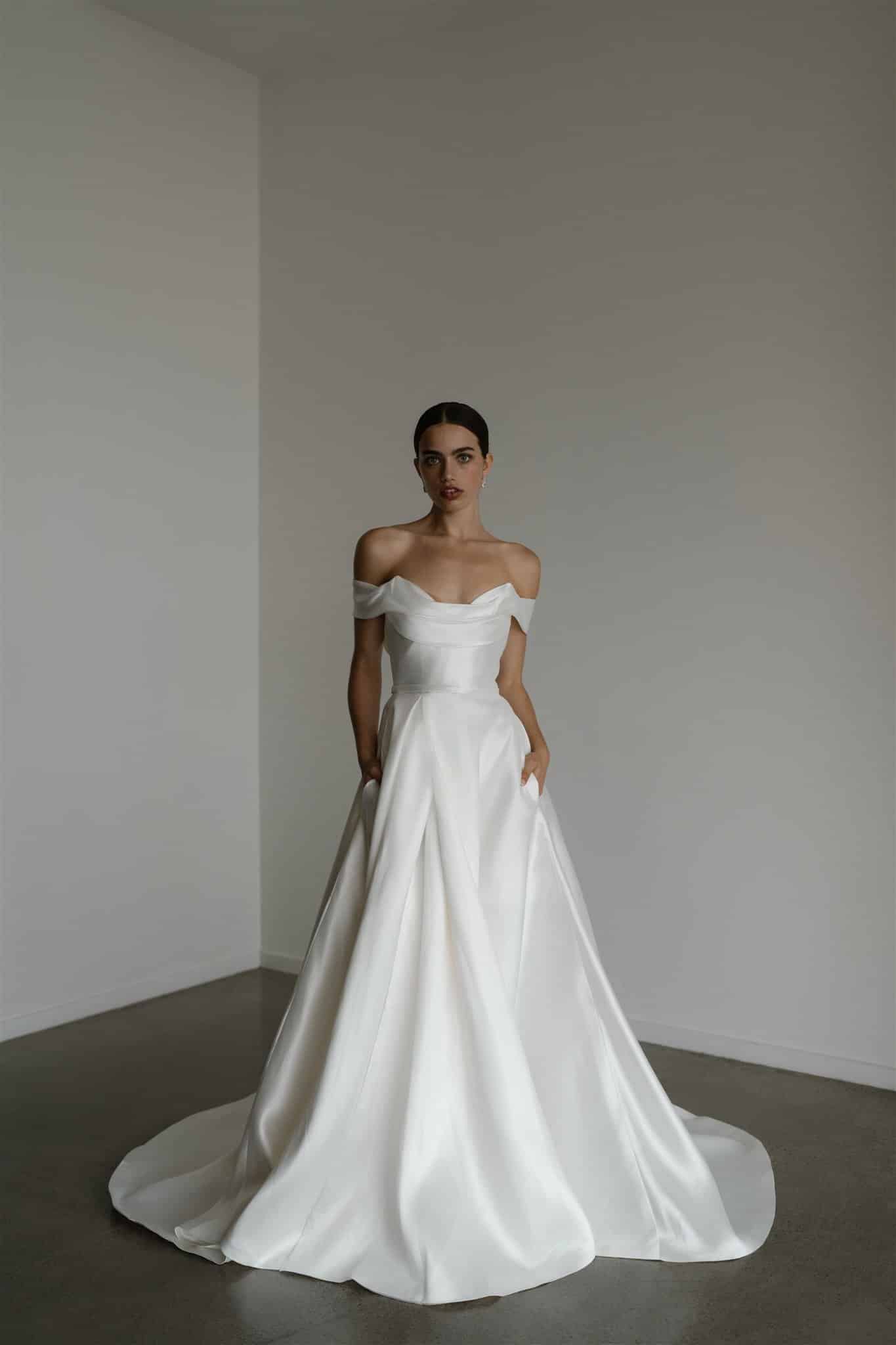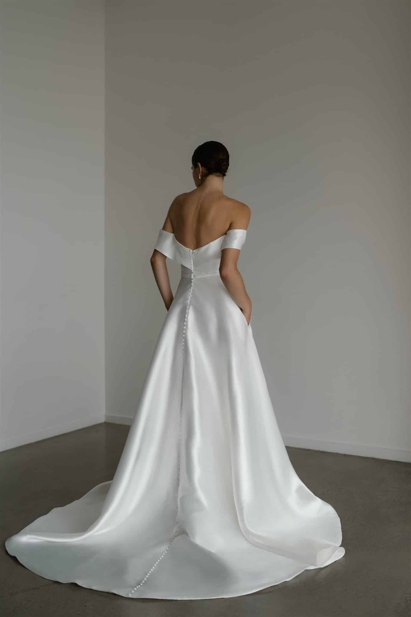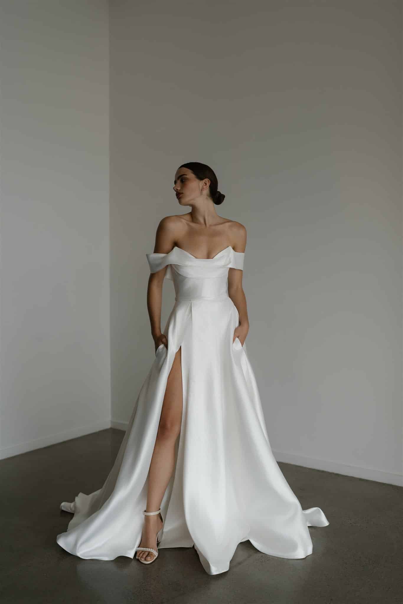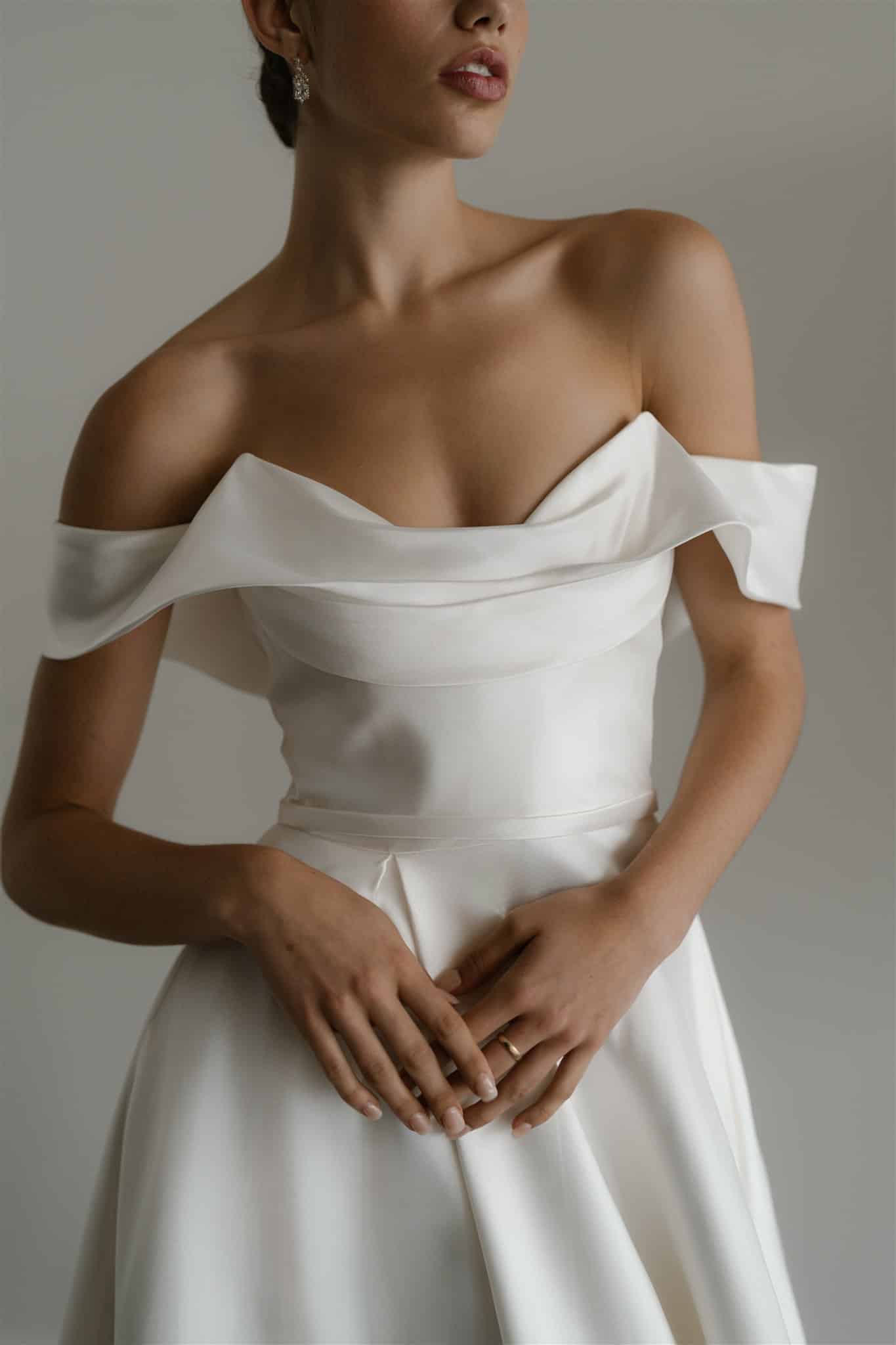 Wenn du den “cool girl chic” suchst, bist du bei Le Belle genau richtig. Le Belle ist aus wunderschönem, schwerem Seiden-Drill-Satin gefertigt und besteht aus einem Korsett, das in einen Rock in A-Linie übergeht, während die Off-Shoulder Träger dem herzförmigen Ausschnitt eine moderne Note verleihen. Taschen und ein hoher Seitenschlitz sorgen für einen Hauch von Lässigkeit. Ob du dieses atemberaubende Kleid klassisch und feminin oder modern und ausgefallen stylst, das La Belle schafft einen Look von mühelosem Stil und lässt die Persönlichkeit der Braut durchscheinen. Das Le Belle V2 ist ein Schwestermodell unseres Le Belle, das einen gewagten Schlitz aufweist. Auch in French Crepe erhältlich.