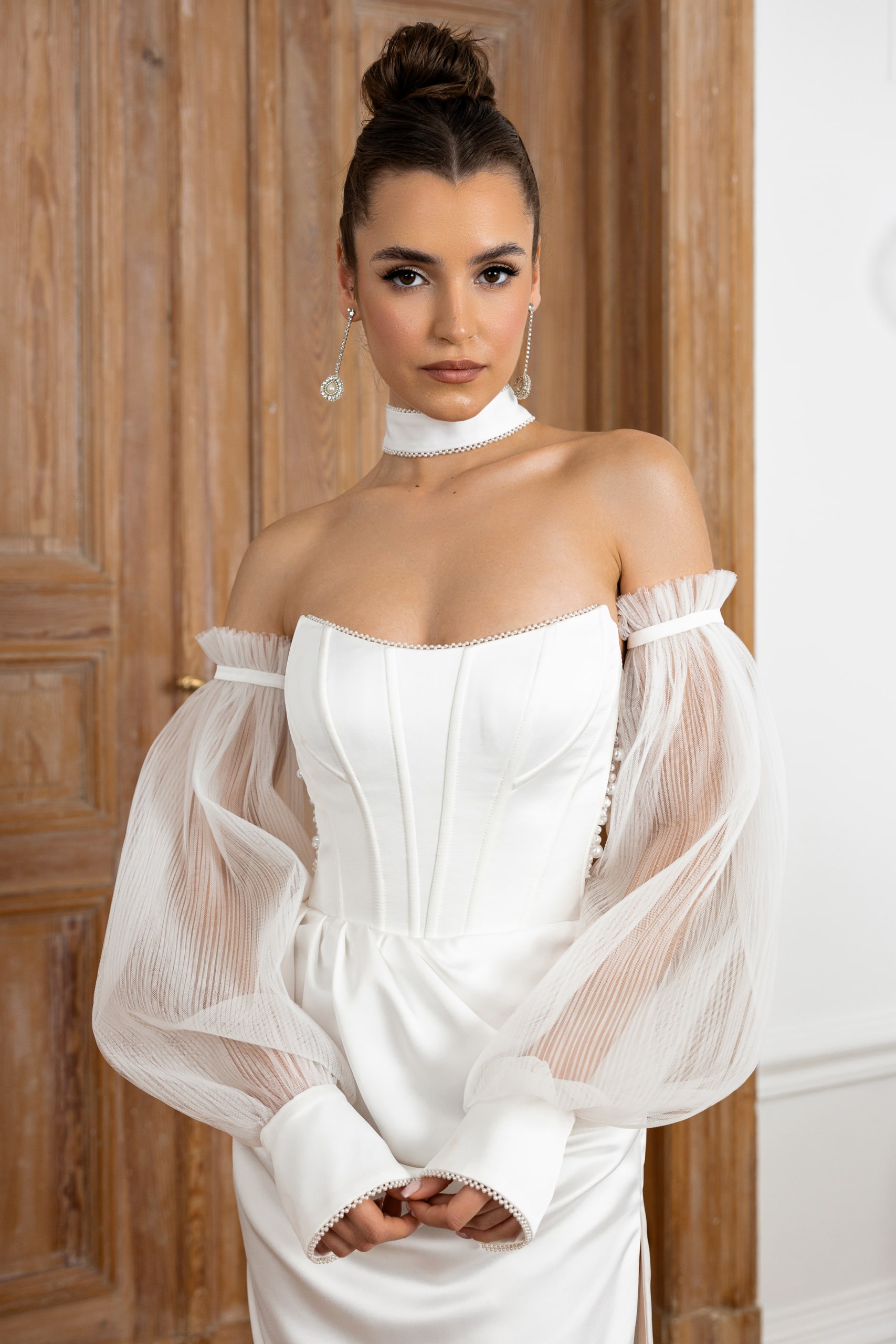 Dieses atemberaubende Brautkleid vereint zeitlose Eleganz mit modernen Akzenten. Hergestellt aus hochwertigem, glattem Material, schmiegt es sich perfekt an die Silhouette an und betont die Figur auf stilvolle Weise. Der runde U-Ausschnitt und das mit zarten Perlen verzierte Rückendetail verleihen dem Kleid einen Hauch von romantischem Luxus. Das Oberteil ist mit Stäbchen im Korsett verstärkt und sorgt für optimalen Halt. Zusätzliche Ärmel und ein verführerischer seitlicher Schlitz runden das Design ab, das klassische Schönheit und zeitgenössischen Chic harmonisch miteinander verbindet.