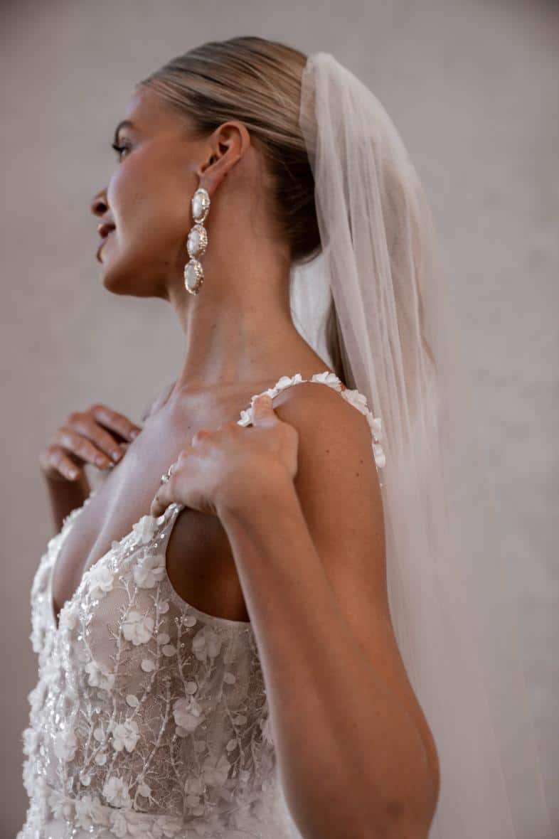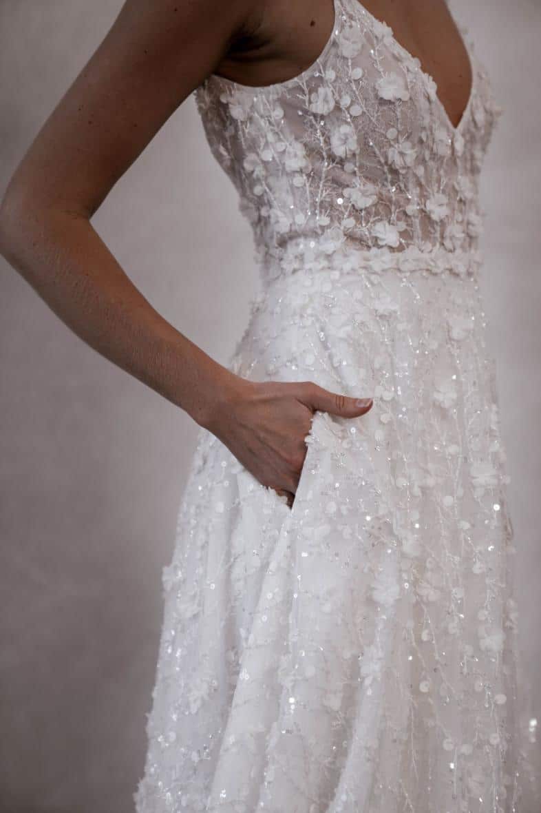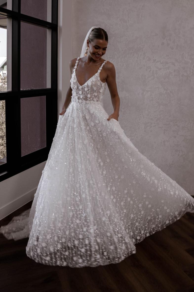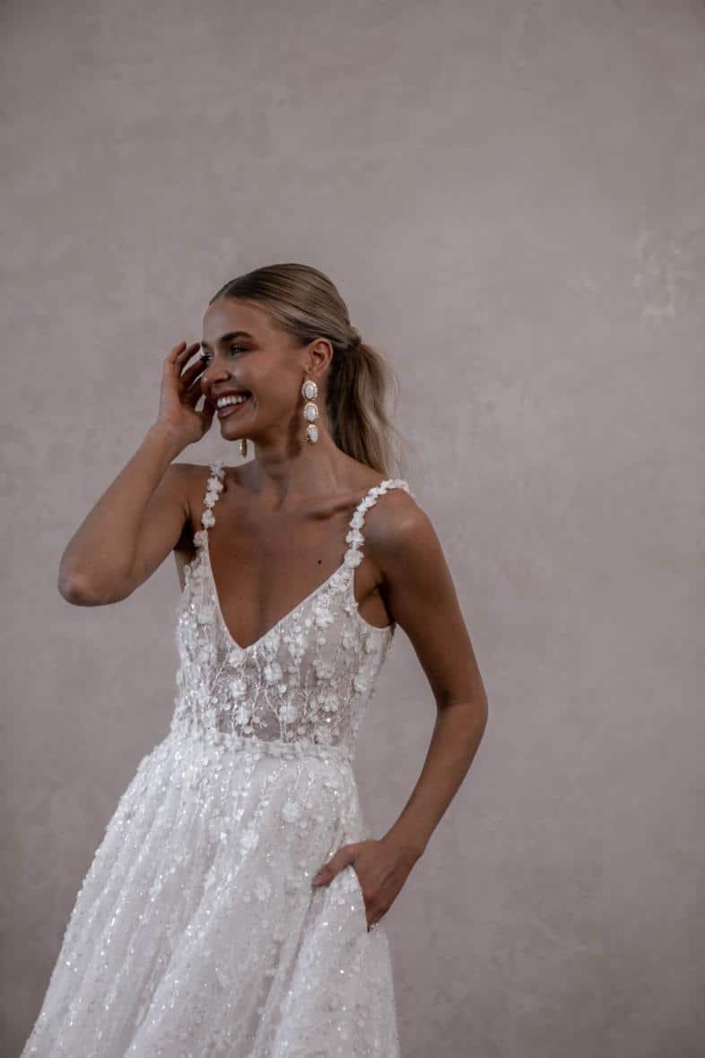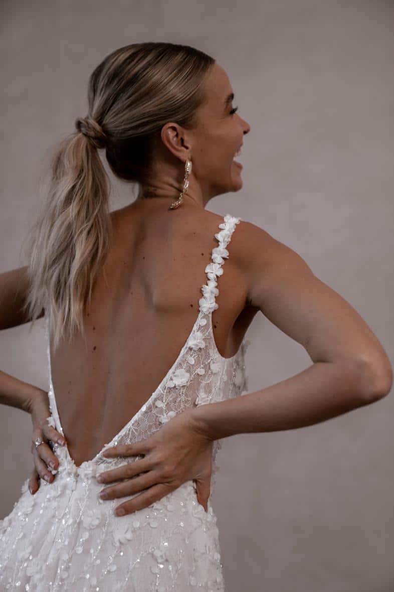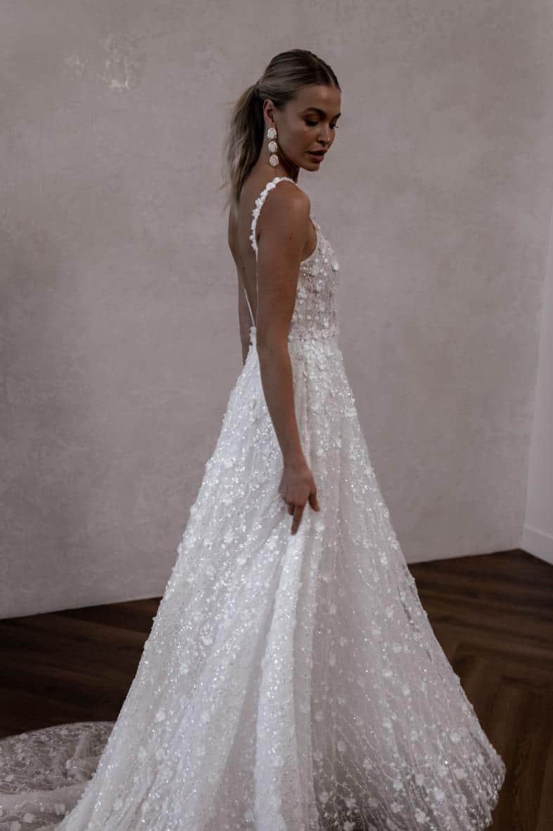Für alle Bräute, die nicht genug von Lennis umwerfend schöner Blumenspitze bekommen können und einen glamourösen Spitzenrock suchen, ist Lenni Flowy genau das Richtige! Mit dem geliebten subtilen Dekolleté von Lenni und den weichen, femininen Blütenträgern, kombiniert mit unserem beliebten fließenden Spitzenrock, ist Lenni Flowy ein glitzernder Traum zum Tragen.