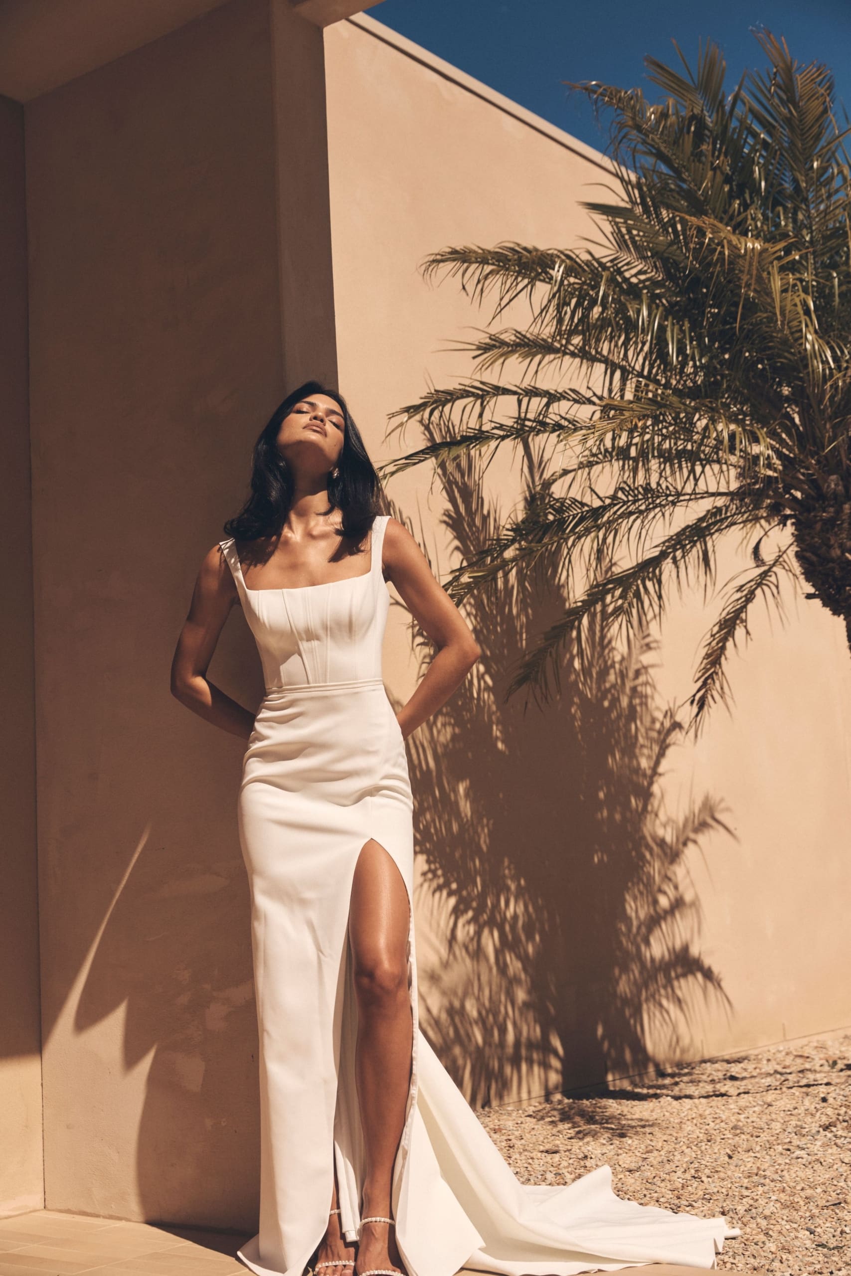 Das Louis-Kleid verkörpert moderne Schlichtheit mit dezenter Eleganz, entworfen für die Braut, die raffinierte Raffinesse schätzt. Ein quadratischer Ausschnitt und ein Seitenschlitz schaffen eine moderne Silhouette. Ein subtiles Taillenband definiert die Taille und ergänzt die taillierte Silhouette.