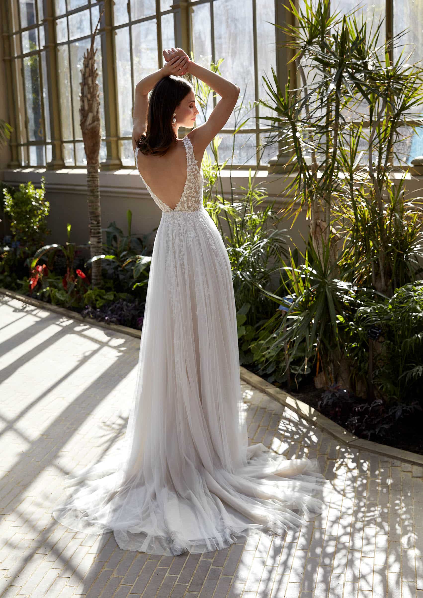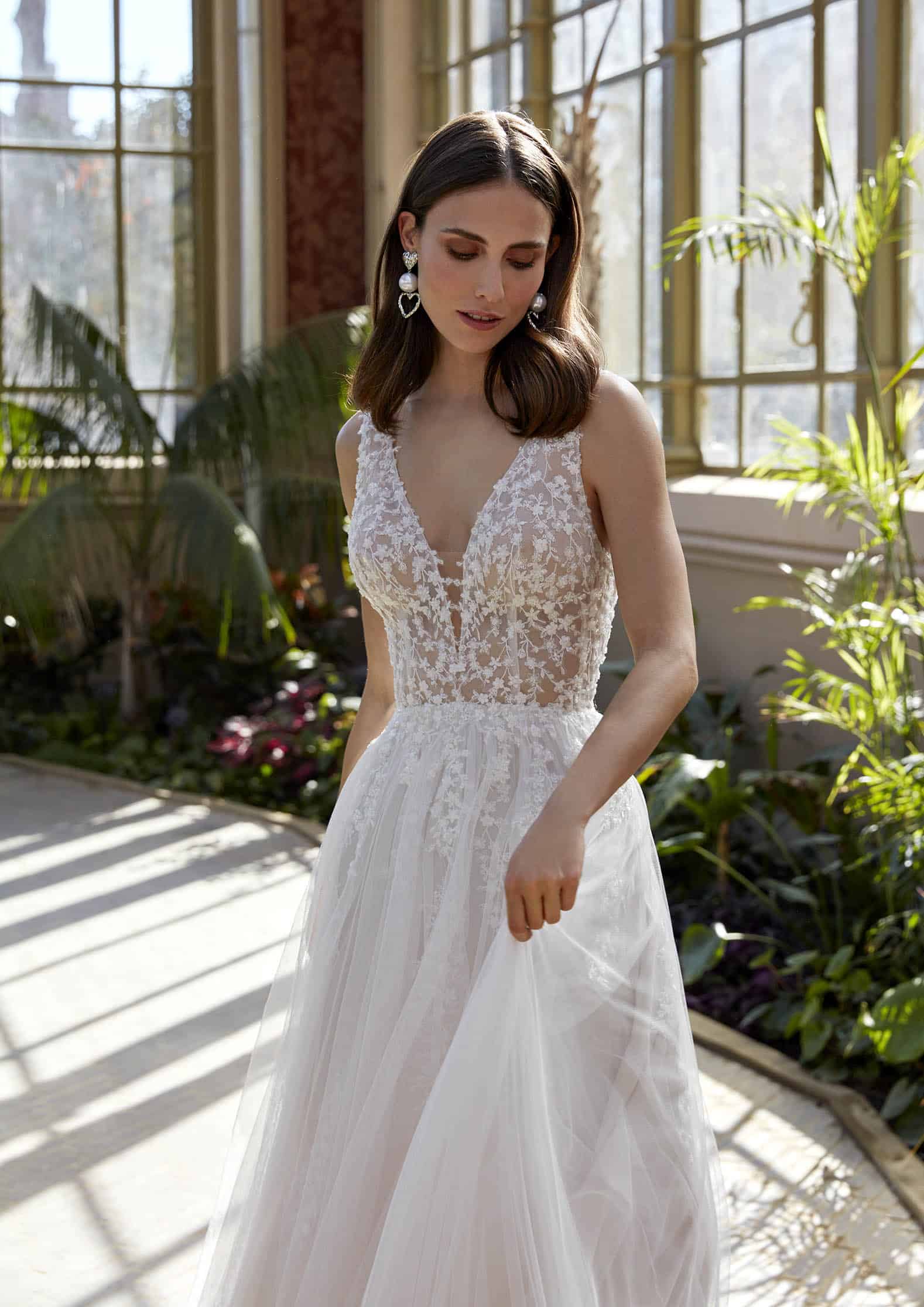 Dieses traumhafte Brautkleid vereint Romantik und Eleganz in Perfektion. Der zarte Tüll in A-Linie schmeichelt jeder Figur und sorgt für einen fließenden, femininen Look. Das raffinierte Oberteil mit filigranen Stickereien verleiht dem Kleid eine edle Note und setzt glamouröse Akzente. Ideal für die Braut, die sich einen modernen und dennoch romantischen Auftritt wünscht.
